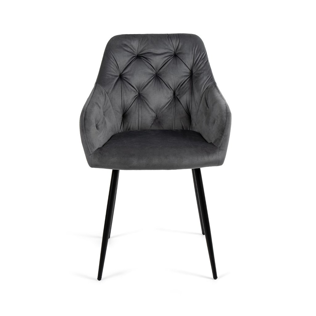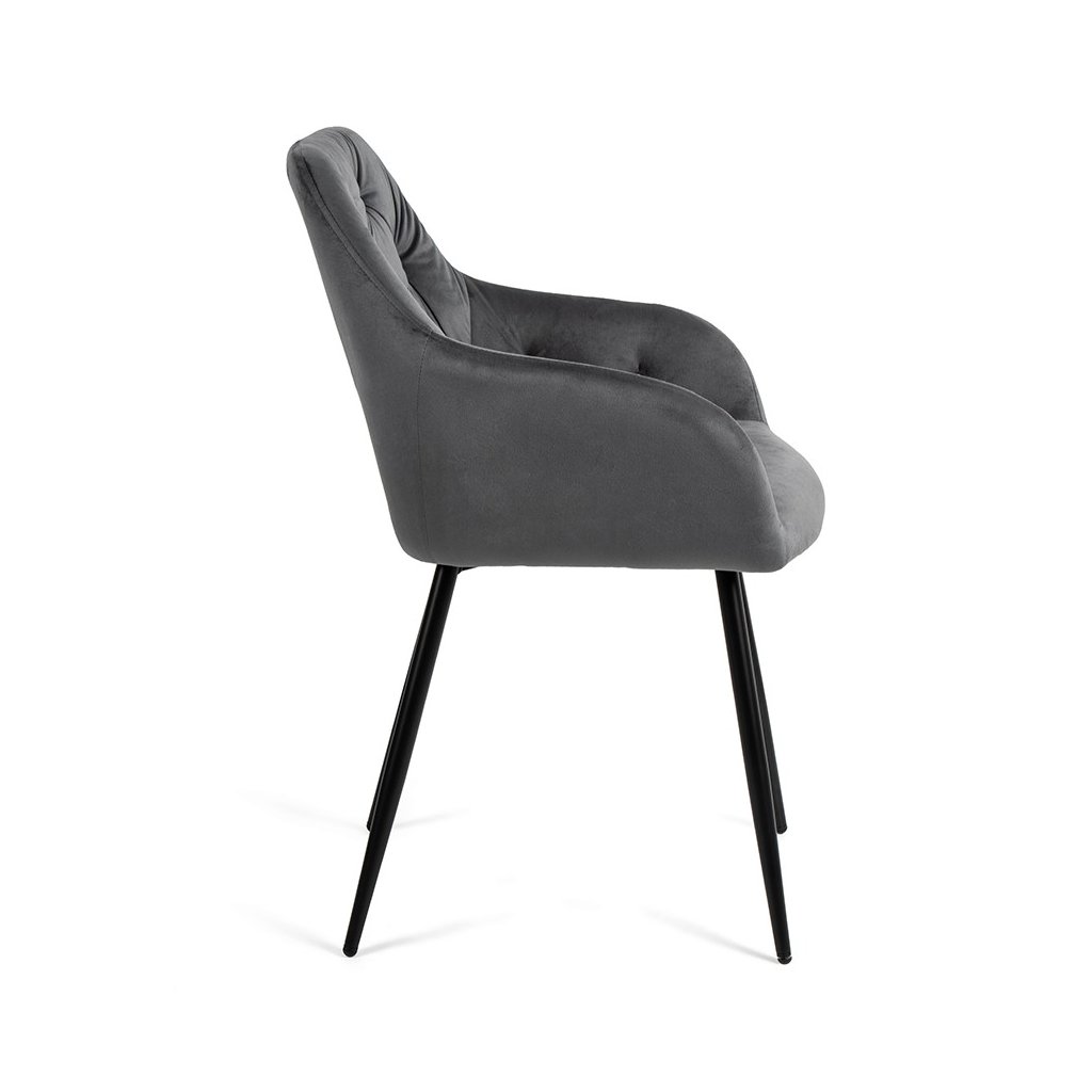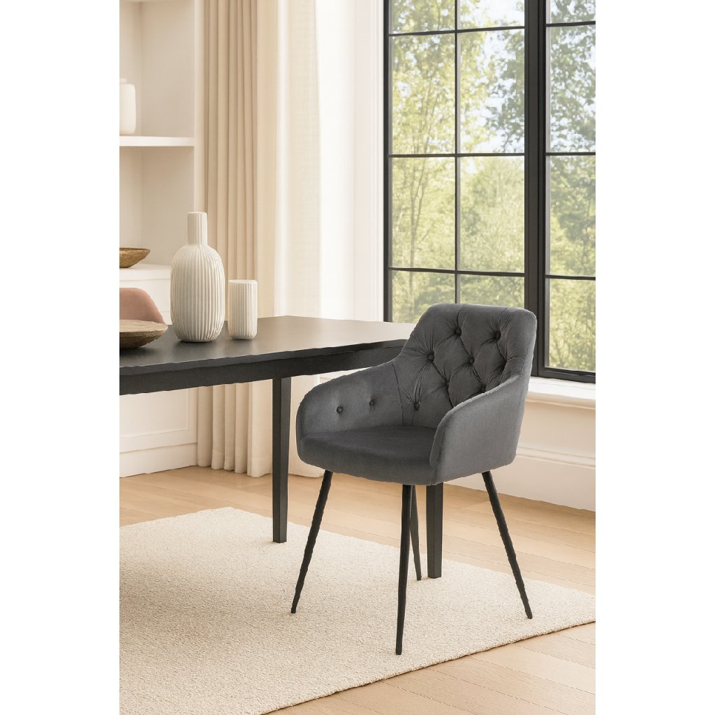 Moderní židle s elegantním designem a područkami. Pohodlné čalounění v šedém sametu s dekorativním prošíváním. Stabilní kovové nohy v černém provedení. Vhodná do jídelny, pracovny i obývacího pokoje. Spojuje komfort, styl a luxusní vzhled.