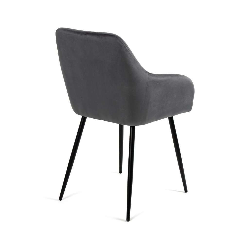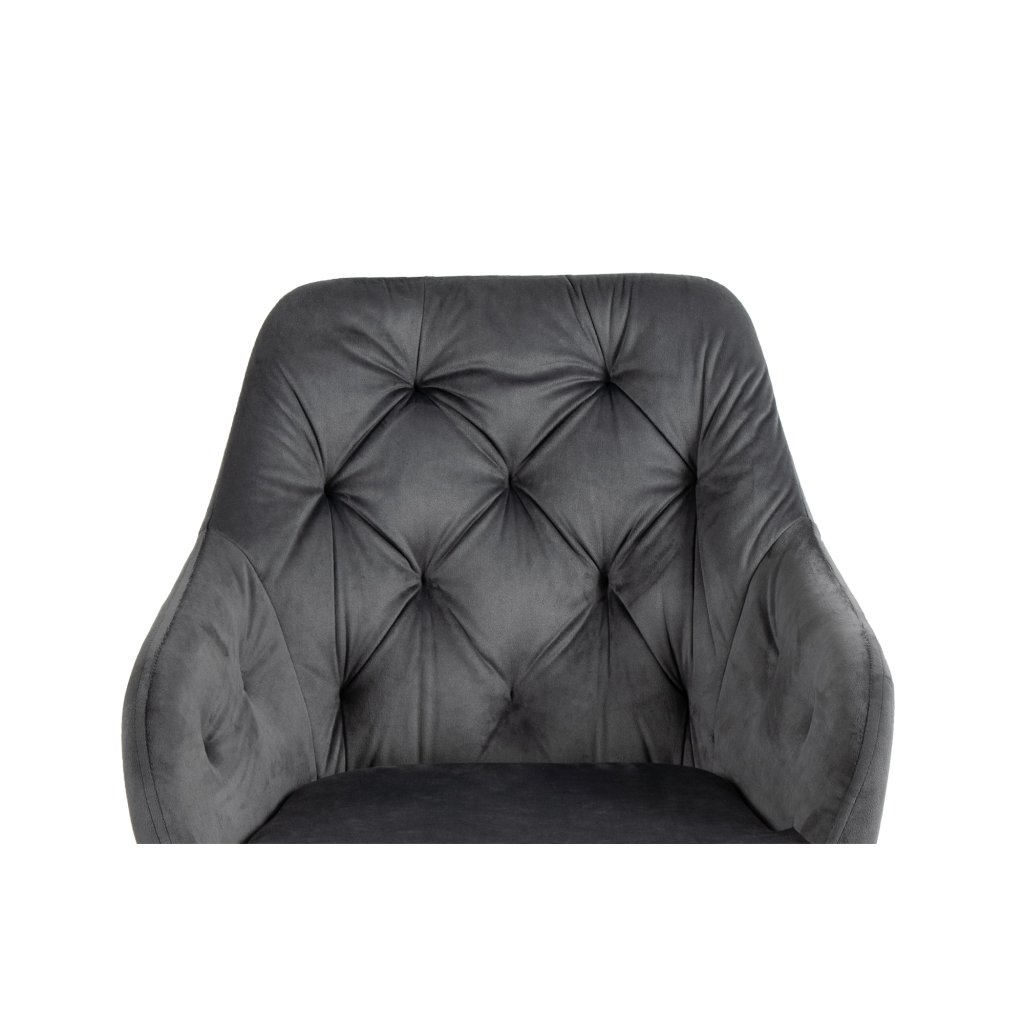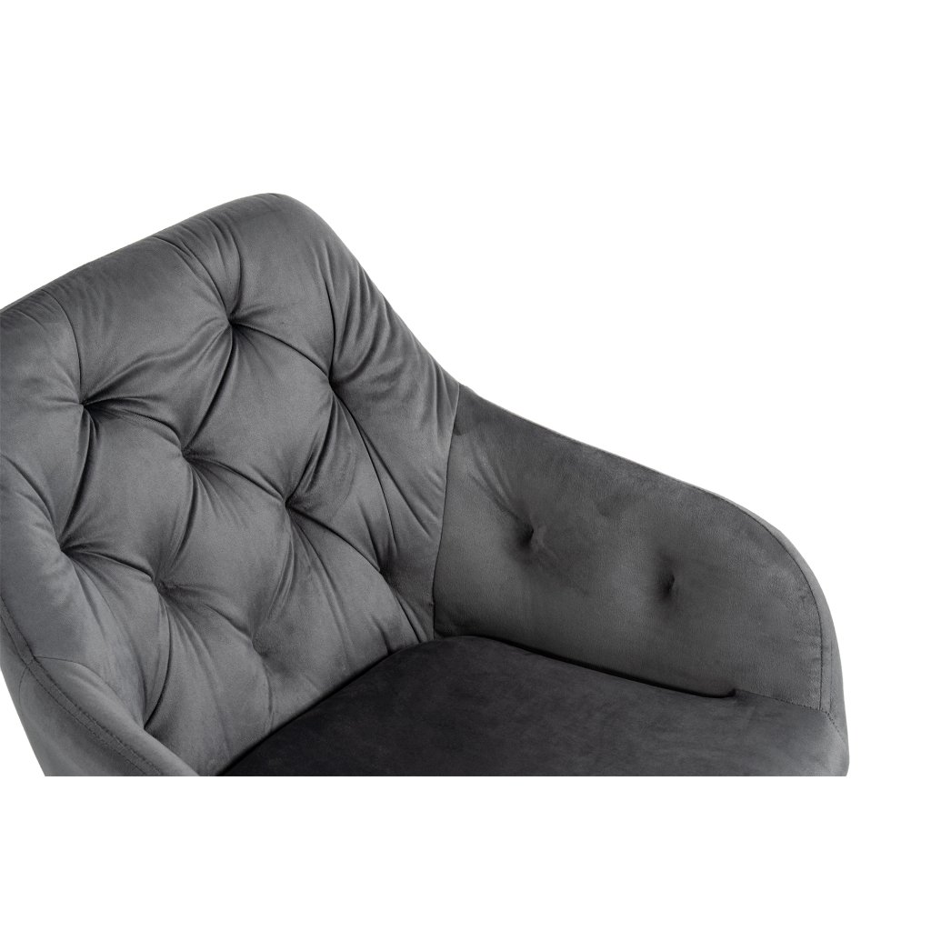 Moderní židle s elegantním designem a područkami. Pohodlné čalounění v šedém sametu s dekorativním prošíváním. Stabilní kovové nohy v černém provedení. Vhodná do jídelny, pracovny i obývacího pokoje. Spojuje komfort, styl a luxusní vzhled.