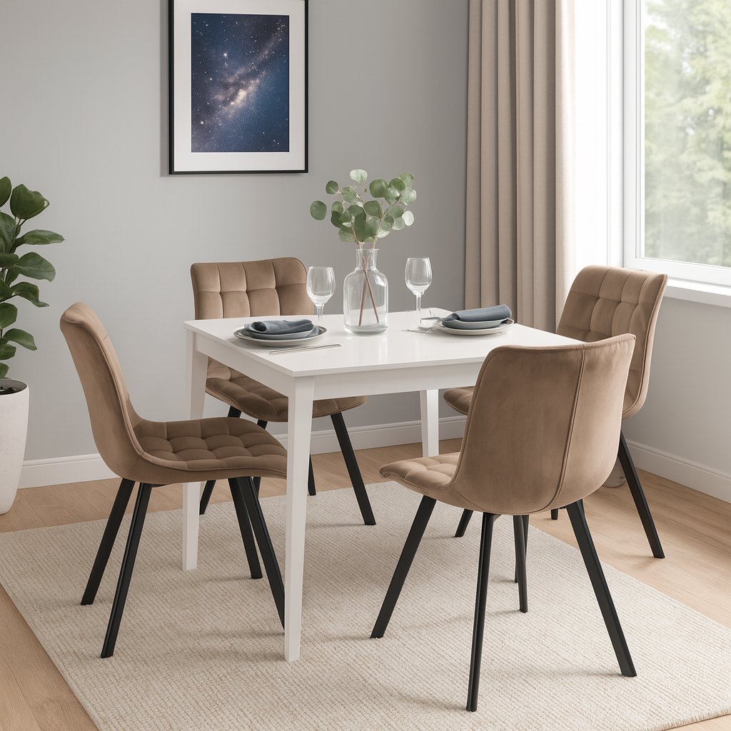 Židle Bella je navržena pro každodenní pohodlí i vizuální lehkost v interiéru. Měkký sametový potah v béžovém odstínu vytváří příjemný kontrast s černými kovovými nohami a snadno zapadne k různým typům stolů.