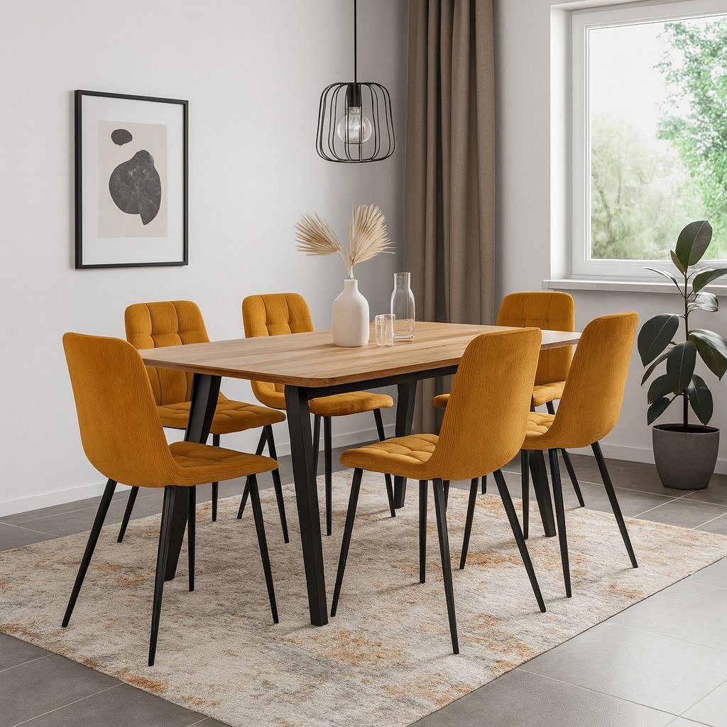 Stylová židle s moderním designem. Pohodlné čalounění v hořčicově žluté manšestrové látce s prošíváním. Stabilní kovové nohy v černém provedení. Vhodná do jídelny, obývacího pokoje i pracovny. Spojuje komfort, odolnost a výrazný barevný akcent.