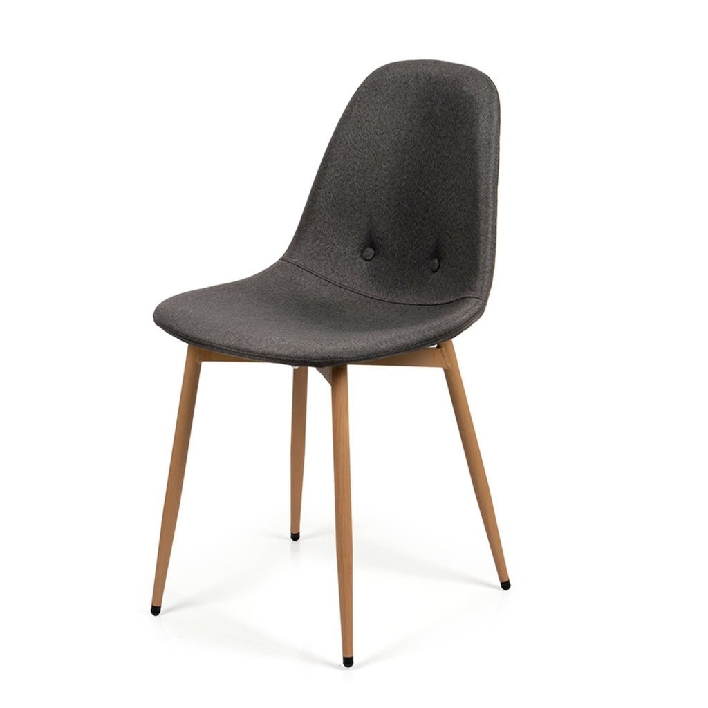 Moderní židle s elegantním designem. Pohodlné čalounění v tmavě šedé barvě s dekorativními knoflíky. Stabilní nohy v dekoru dřeva pro přírodní vzhled. Vhodná do jídelny, kuchyně i pracovny. Kombinace komfortu, jednoduchosti a stylového provedení.