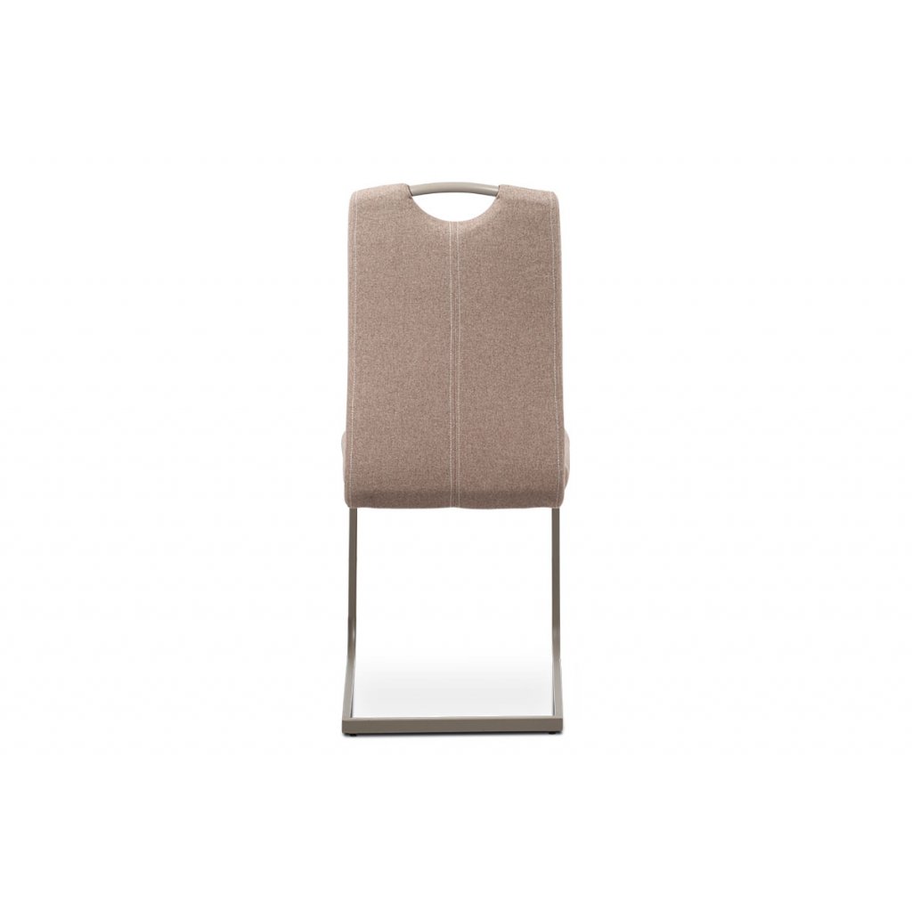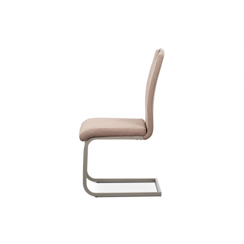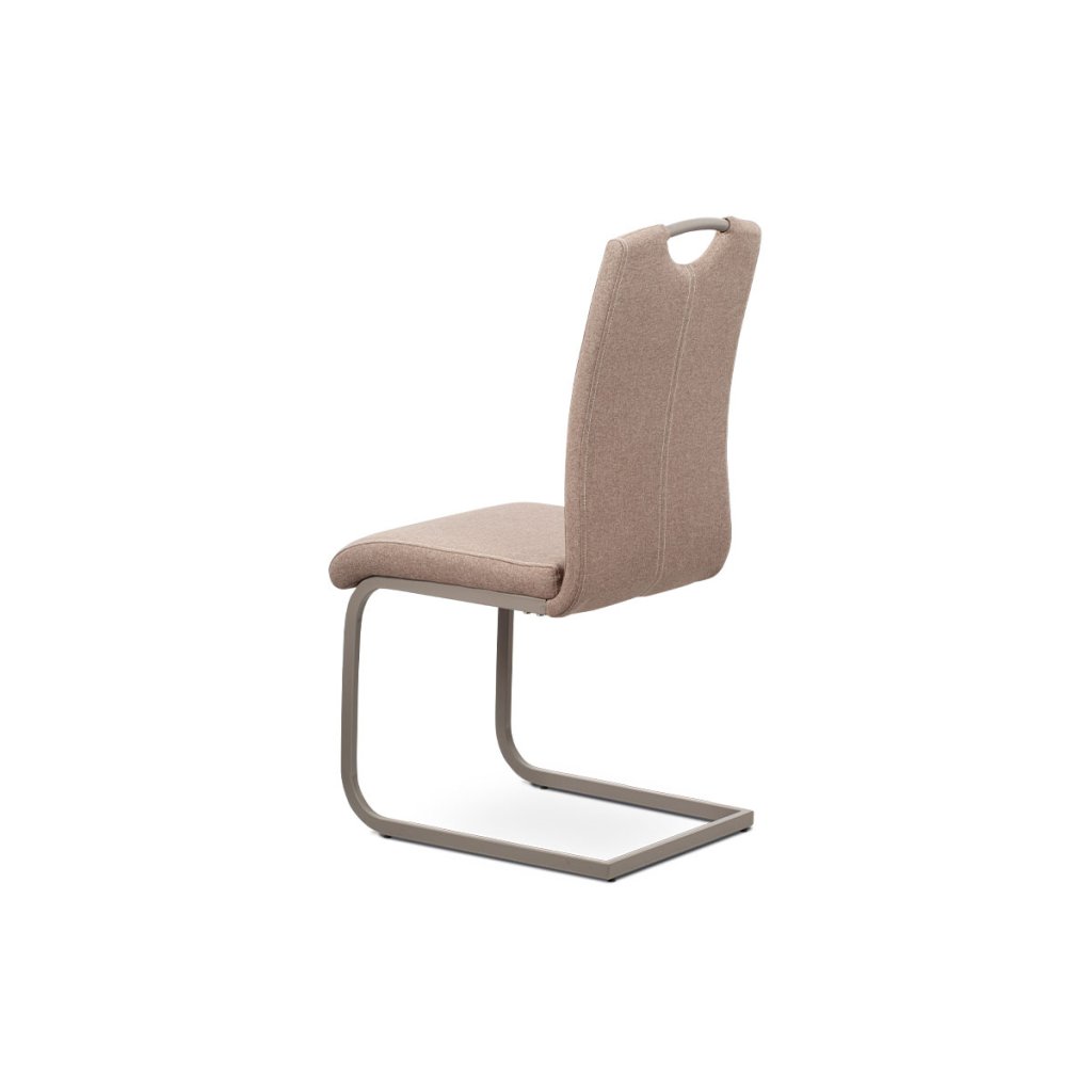 Jídelní židle s pohupovací podnoží čalouněná látkou v lanýžové barvě.