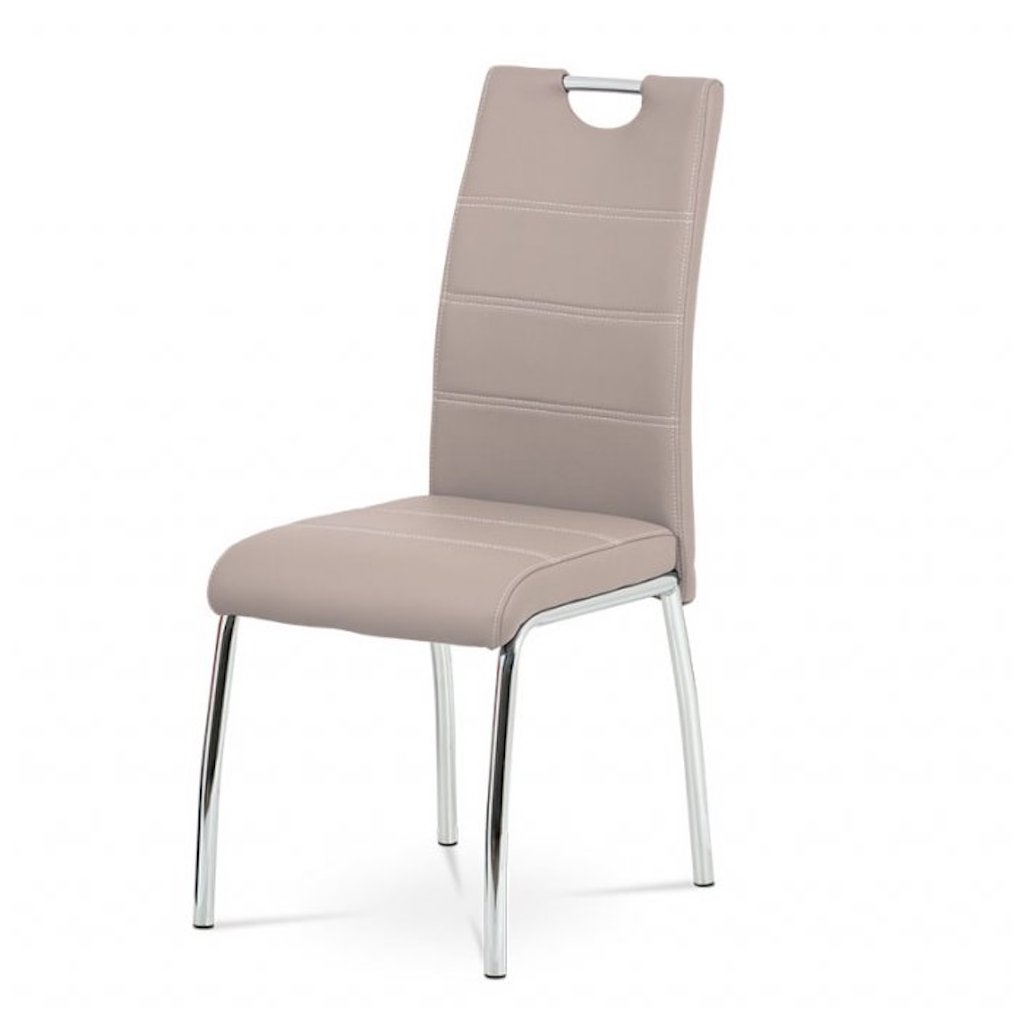 Jídelní židle, potah lanýžová ekokůže, bílé prošití, kovová čtyřnohá chromovaná podnož
