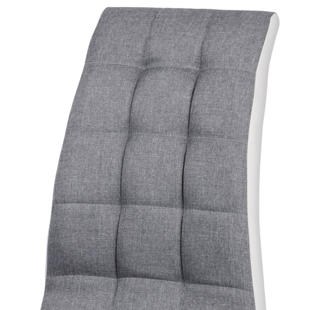 Pohodlnost této jídelní židle je vidět na první pohled a není pochyb o tom, že je tato moderní židle tou správnou volbou do Vaši kuchyně nebo jídelny. Vkusná jídelní židle Vám poskytne komfort nejen v čase oběda. Židle je čalouněná látkou v šedé barvě. Boky židle jsou potažené ekokůží v bílé barvě. Opěrák a sedák židle mají čtvercové prošití. Nohy židle jsou kovové v provedení chrom lesk.