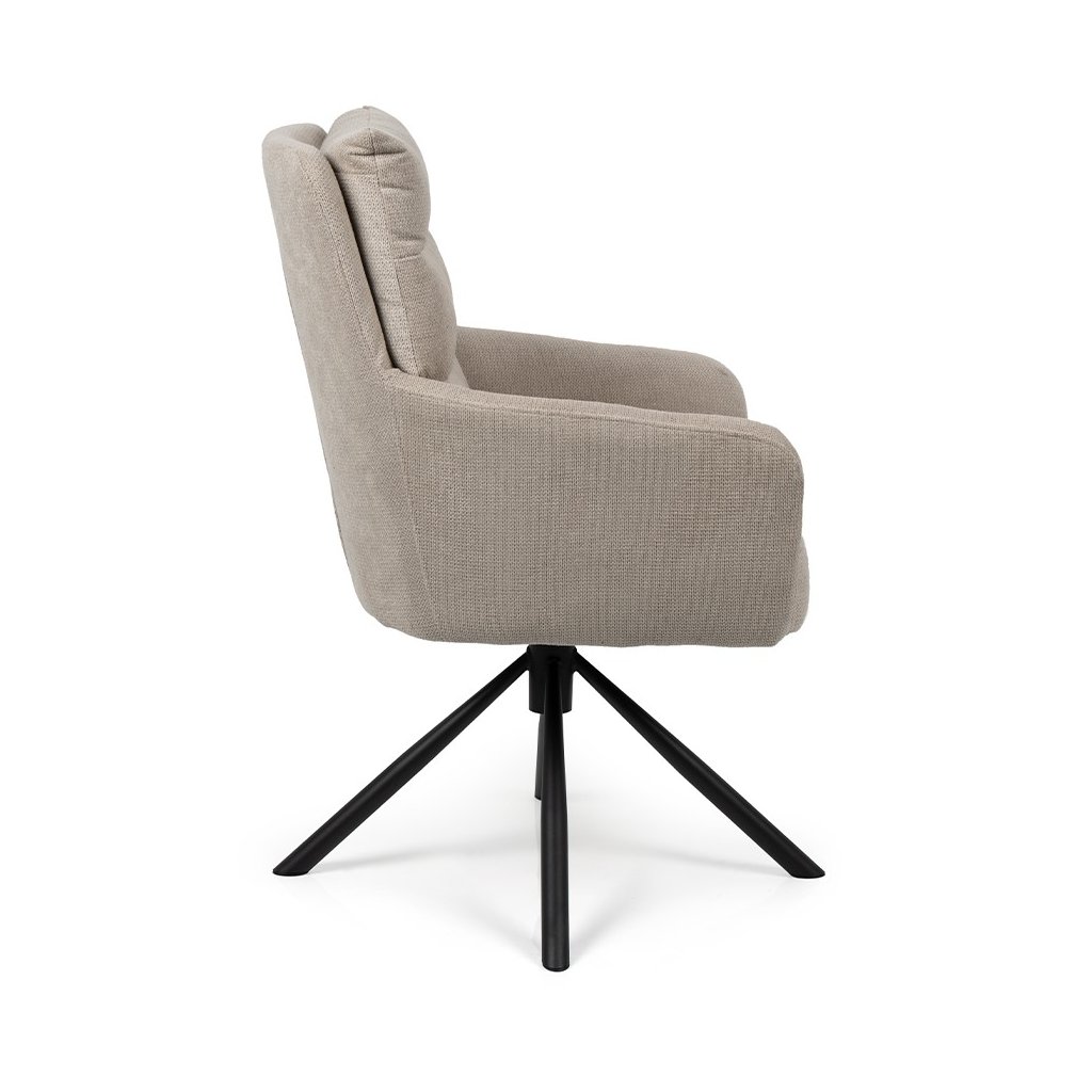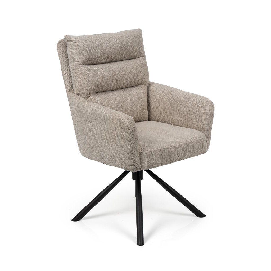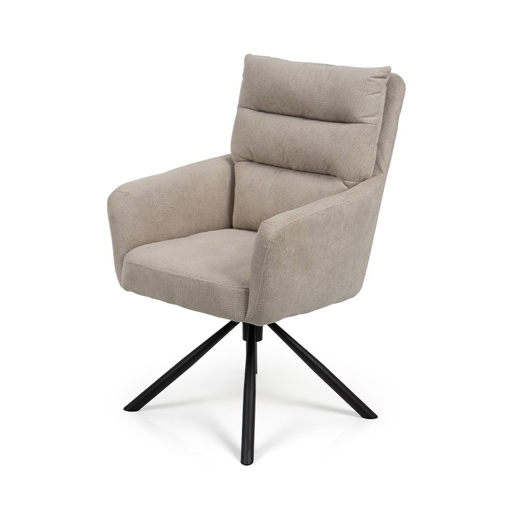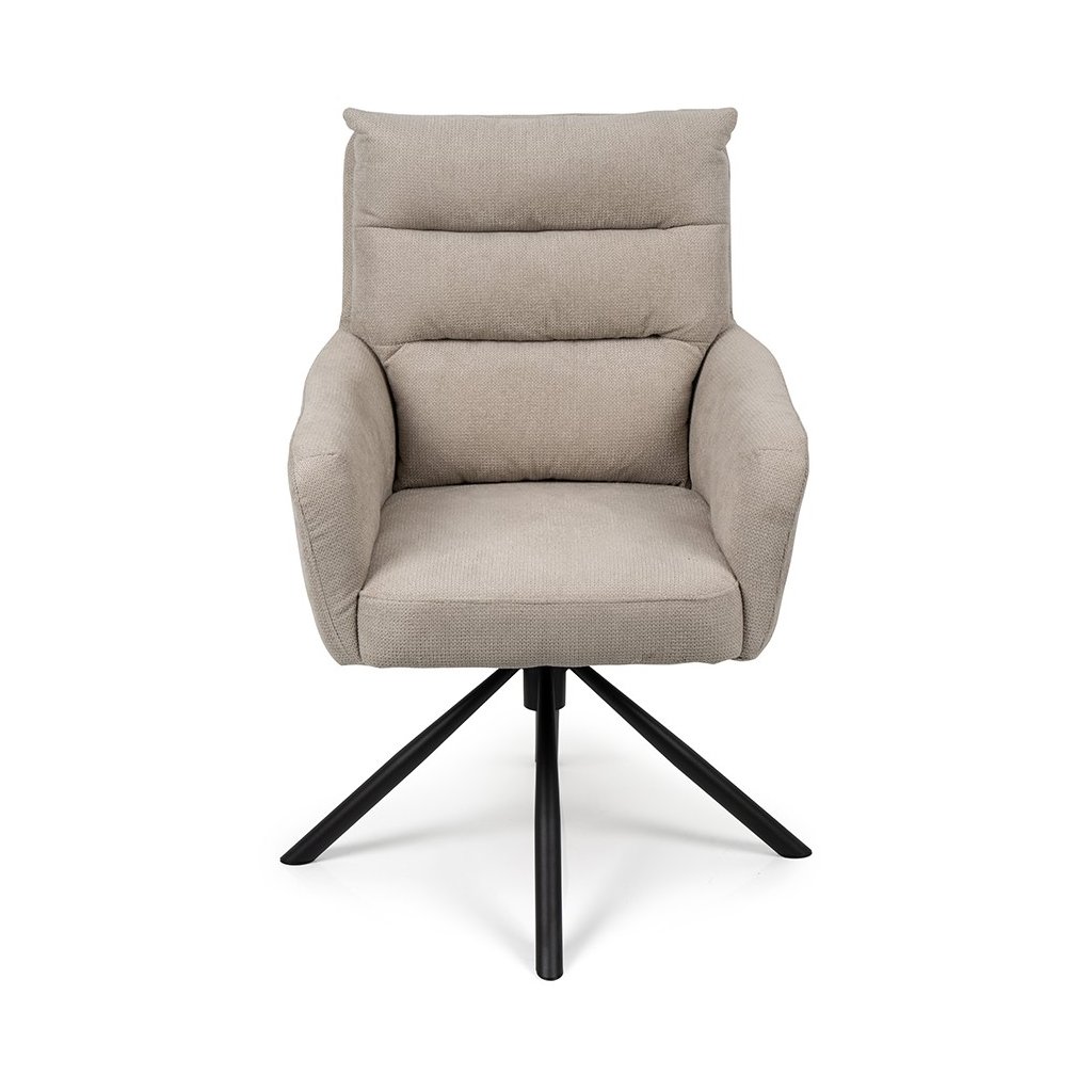 Stylová židle s područkami a moderním designem. Pohodlné čalounění v béžové látce s měkkým polstrováním. Stabilní kovová podnož s otočnou funkcí. Vhodná do jídelny, pracovny i kanceláře. Spojuje komfort, praktičnost a elegantní vzhled.