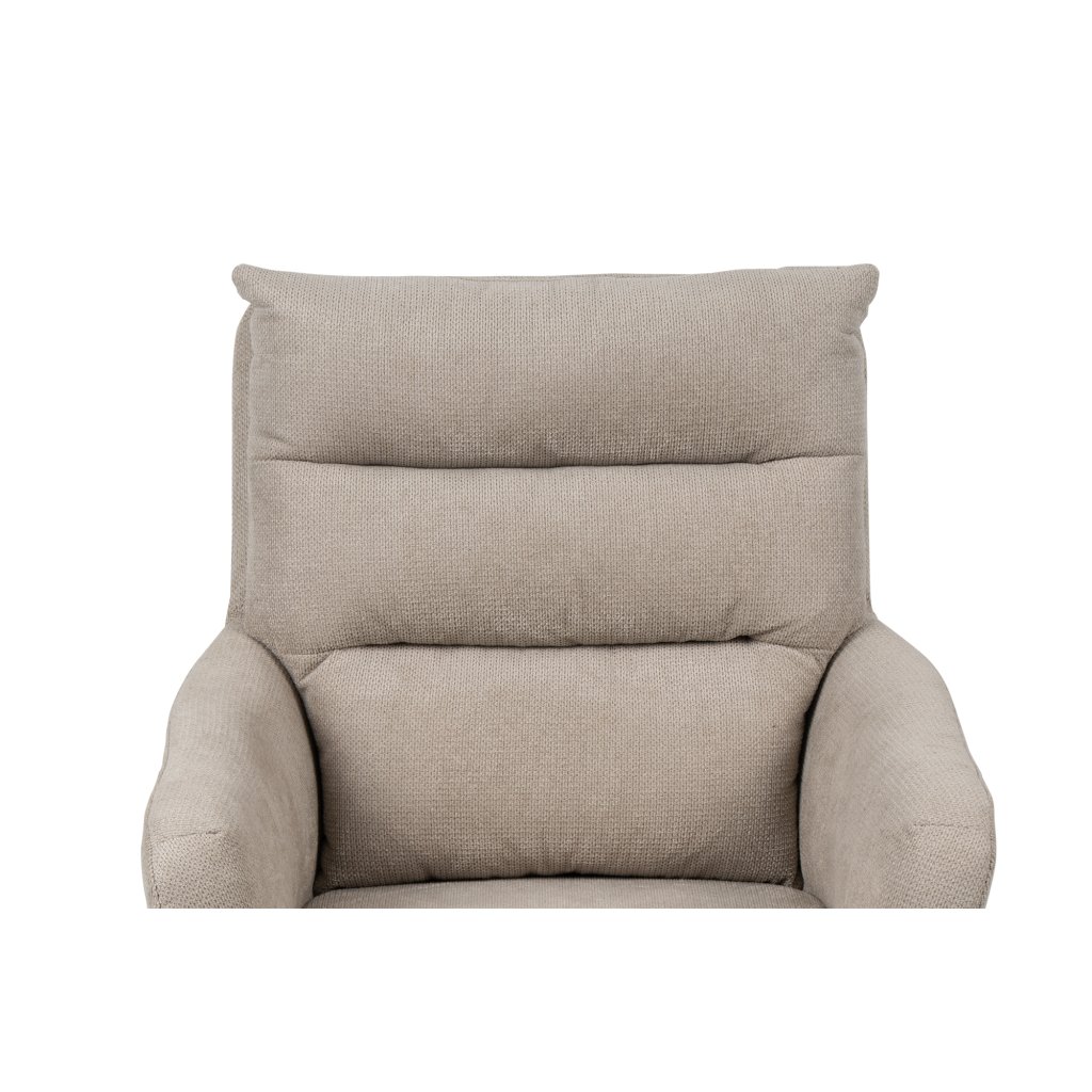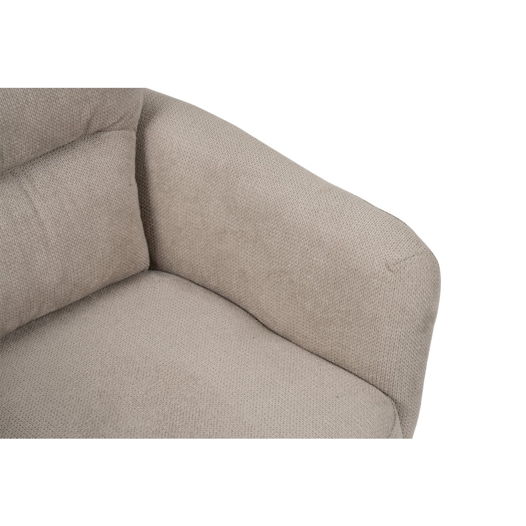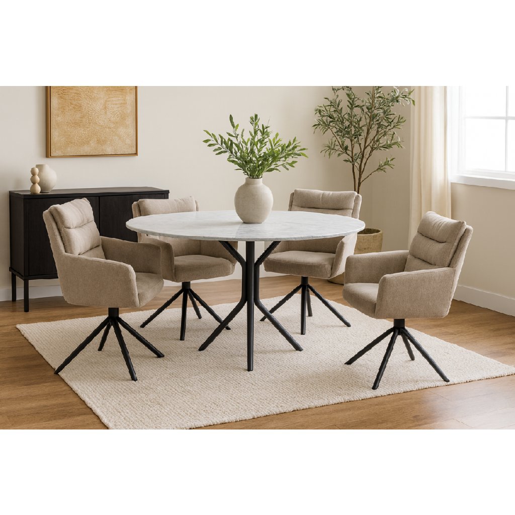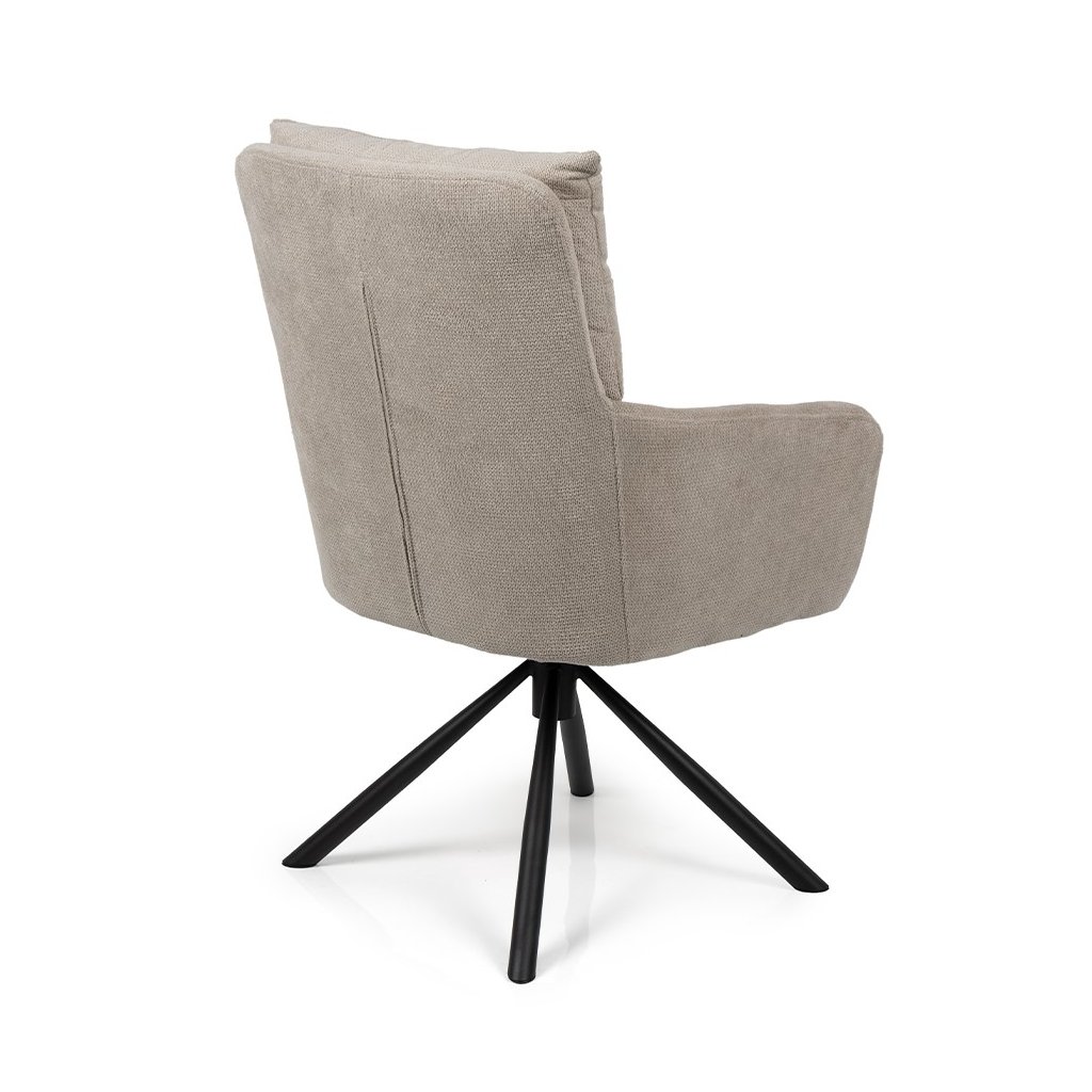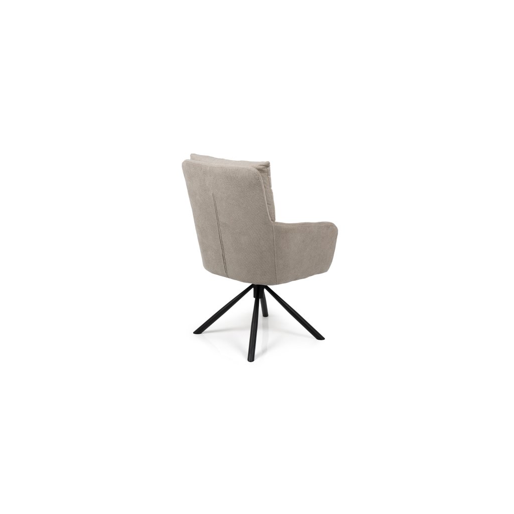 Stylová židle s područkami a moderním designem. Pohodlné čalounění v béžové látce s měkkým polstrováním. Stabilní kovová podnož s otočnou funkcí. Vhodná do jídelny, pracovny i kanceláře. Spojuje komfort, praktičnost a elegantní vzhled.
