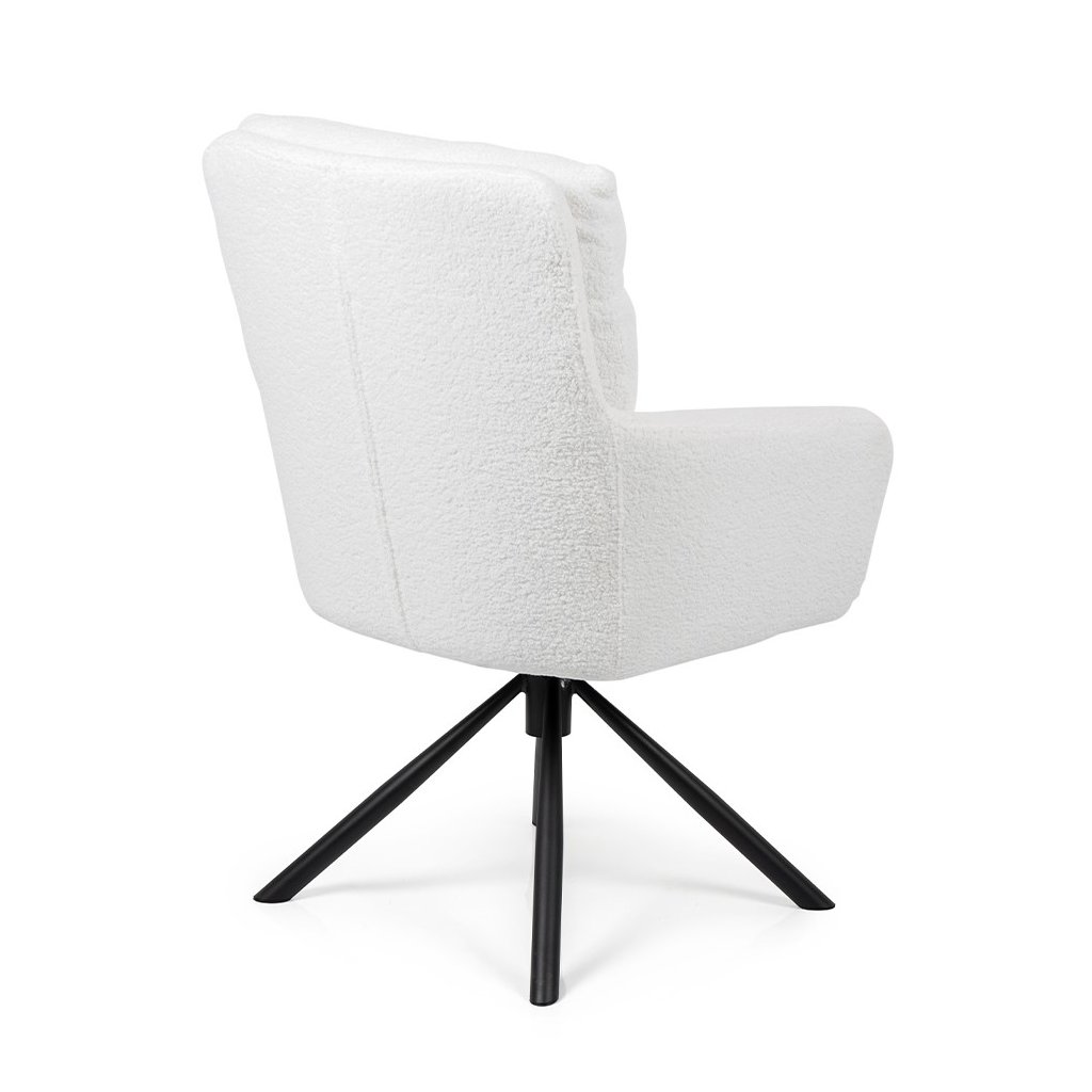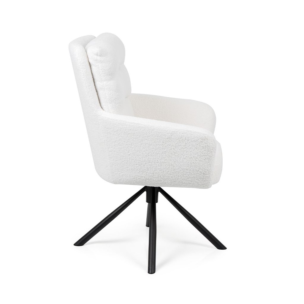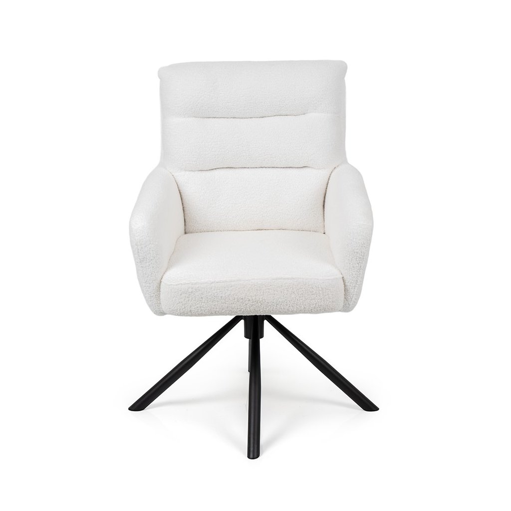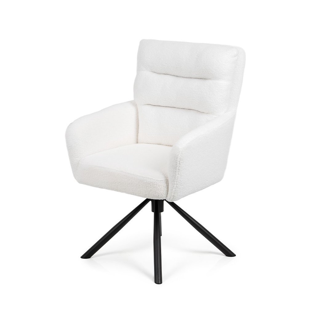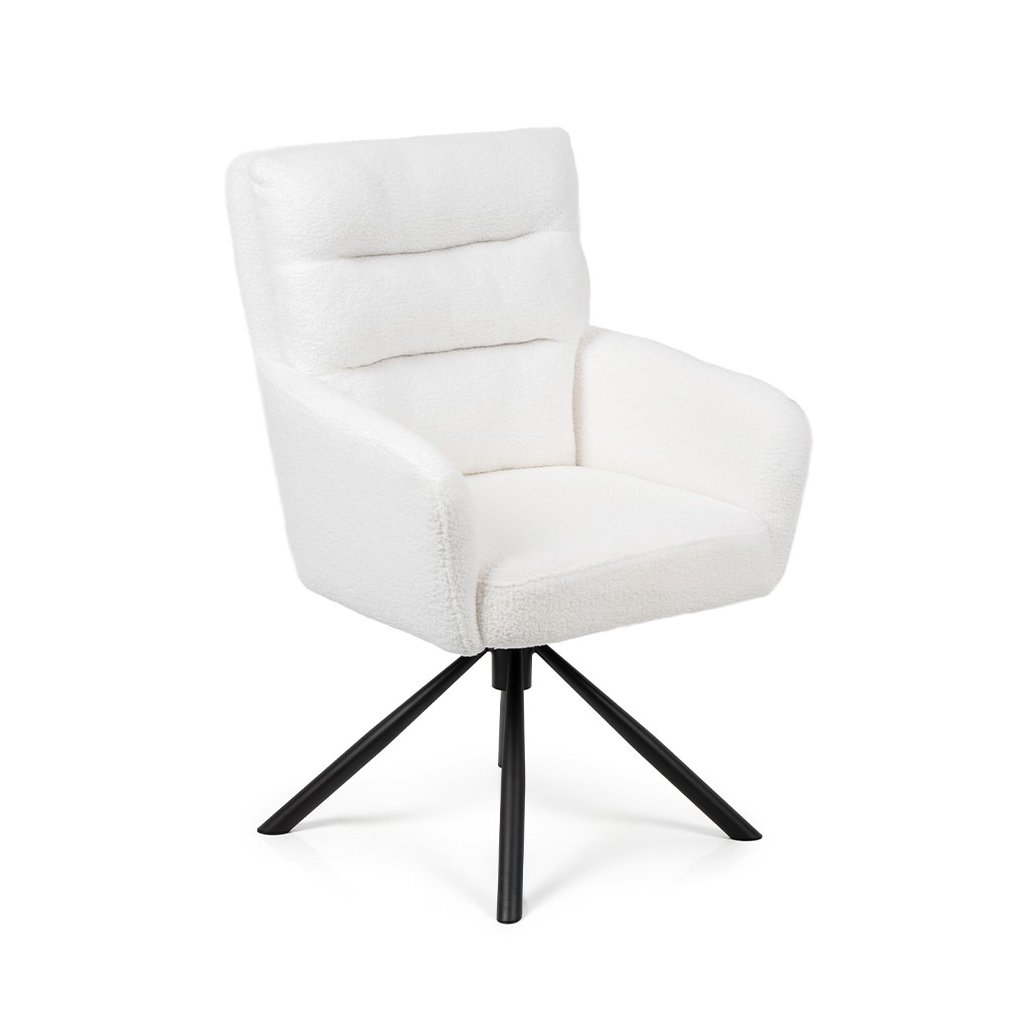 Moderní otočná židle s područkami a elegantním vzhledem. Pohodlné čalounění v bílé látce s měkkým povrchem. Stabilní kovová podnož s otočnou funkcí. Skvěle se hodí do jídelny, pracovny i kanceláře. Spojuje komfort, luxusní design a nadčasovou eleganci.