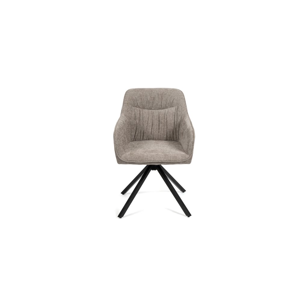 Stylová židle s područkami a moderním vzhledem. Pohodlné čalounění v šedé látce s elegantním kontrastním korpusem. Stabilní kovová podnož s otočnou funkcí. Skvěle se hodí do jídelny, pracovny i kanceláře. Spojuje komfort, praktičnost a nadčasový design.