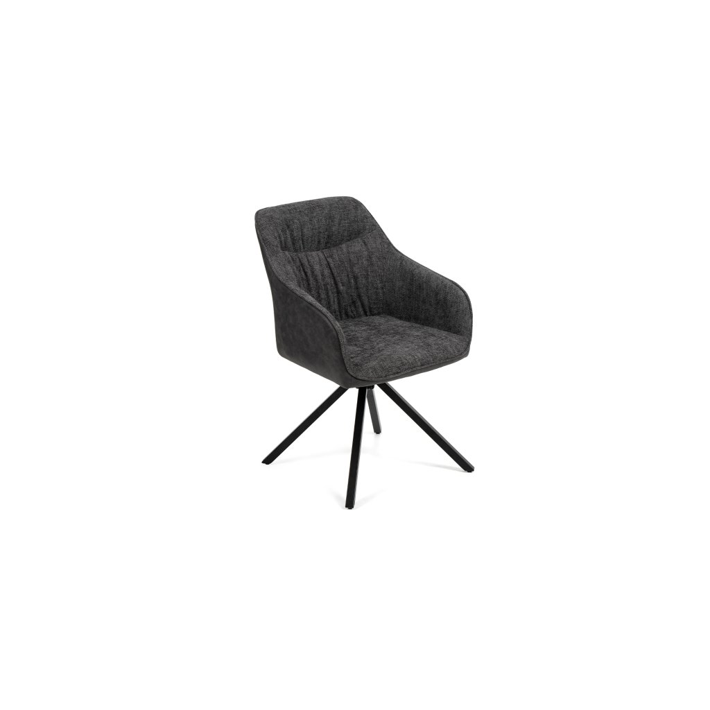 Moderní židle s područkami a elegantním designem. Pohodlné čalounění v tmavě šedé látce s kontrastním korpusem. Stabilní kovová podnož s otočnou funkcí. Vhodná do jídelny, pracovny i kanceláře. Spojuje komfort, odolnost a nadčasový styl.
