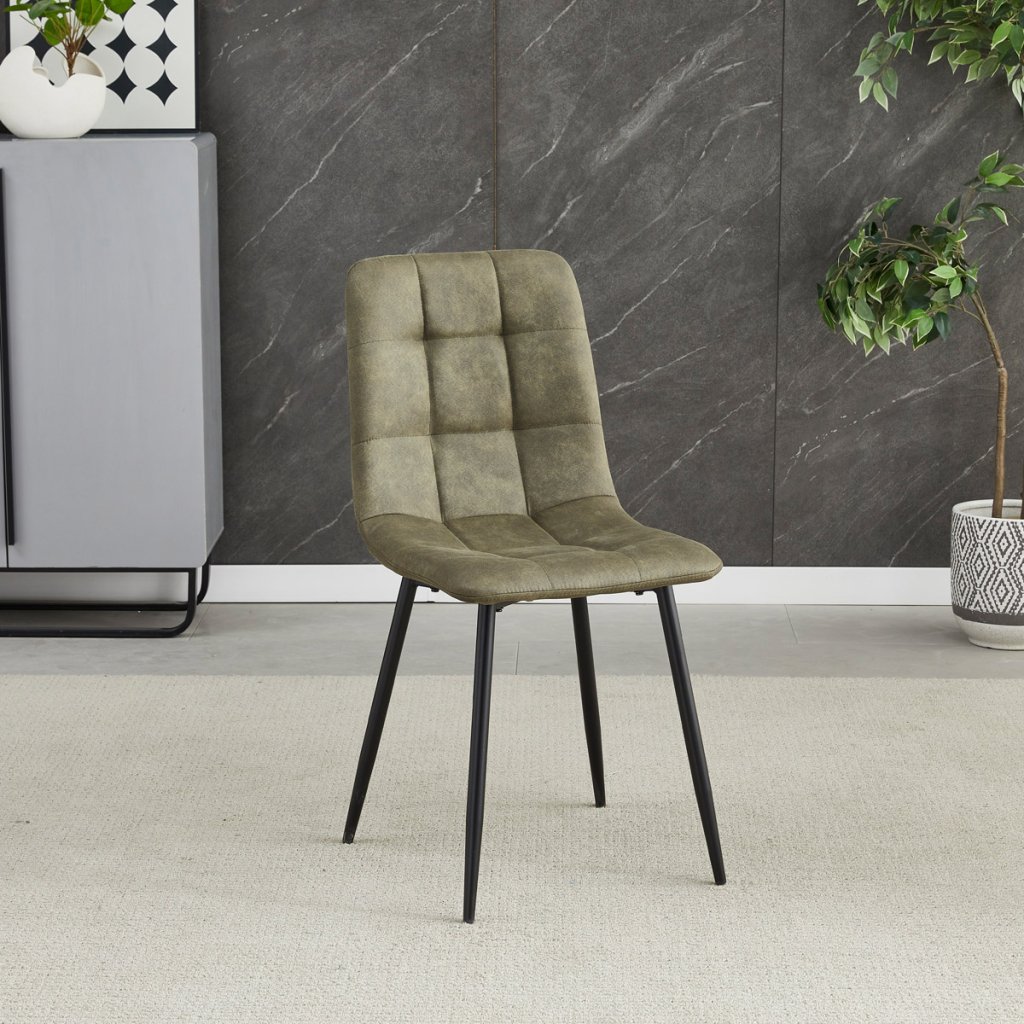Jídelní židle v moderním industriálním stylu je skvělou volbou pro každou jídelnu. Potah z látky vintage v zeleném odstínu dodává nábytku osobitý charakter, zatímco elegantní čtvercové prošívání podtrhuje její vzhled. Černé kovové nohy poskytují stabilitu a ladí s minimalistickým designem. Komfort při sezení zajišťuje měkké polstrování z PU pěny, díky kterému je židle ideální jak pro každodenní používání, tak pro slavnostní chvíle.