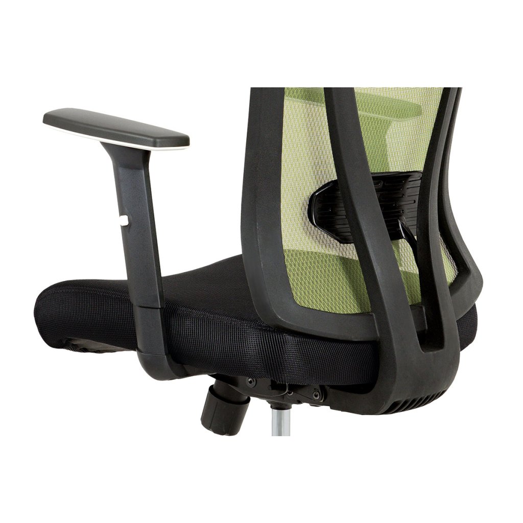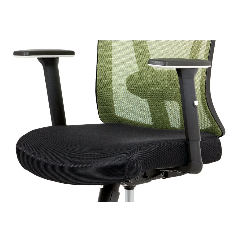 Kancelářská židle KA-H110 GRN, čalouněné černou a zelenou síťovinou MESH, se synchronním mechanismem, v jednoduchém moderním provedení. Celoplastový opěrák se středovou výztuhou ve tvaru V je potažen černou síťovinou MESH, kterou je čalouněn polstrovaný sedák. Polstrovaná bederní opěrka je výškově nastavitelná, je tak zajištěno komfortnější sezení. Výškově nastavitelné plastové područky jsou z černé, měkčené pryže - vaším rukám bude dopřán maximální komfort. Díky plynovému pístu je křeslo výškově nastavitelné, se synchronním mechanismem, s aretací ve třech polohách a s velkým aretačním šroubem, který je umístěn pod sedákem, na úpravu tuhosti. Stabilita židle je zajištěna díky plastovému kříži v černé barvě, na kterém jsou uchycena plastová kolečka, vhodná na koberce.