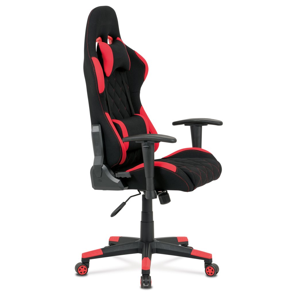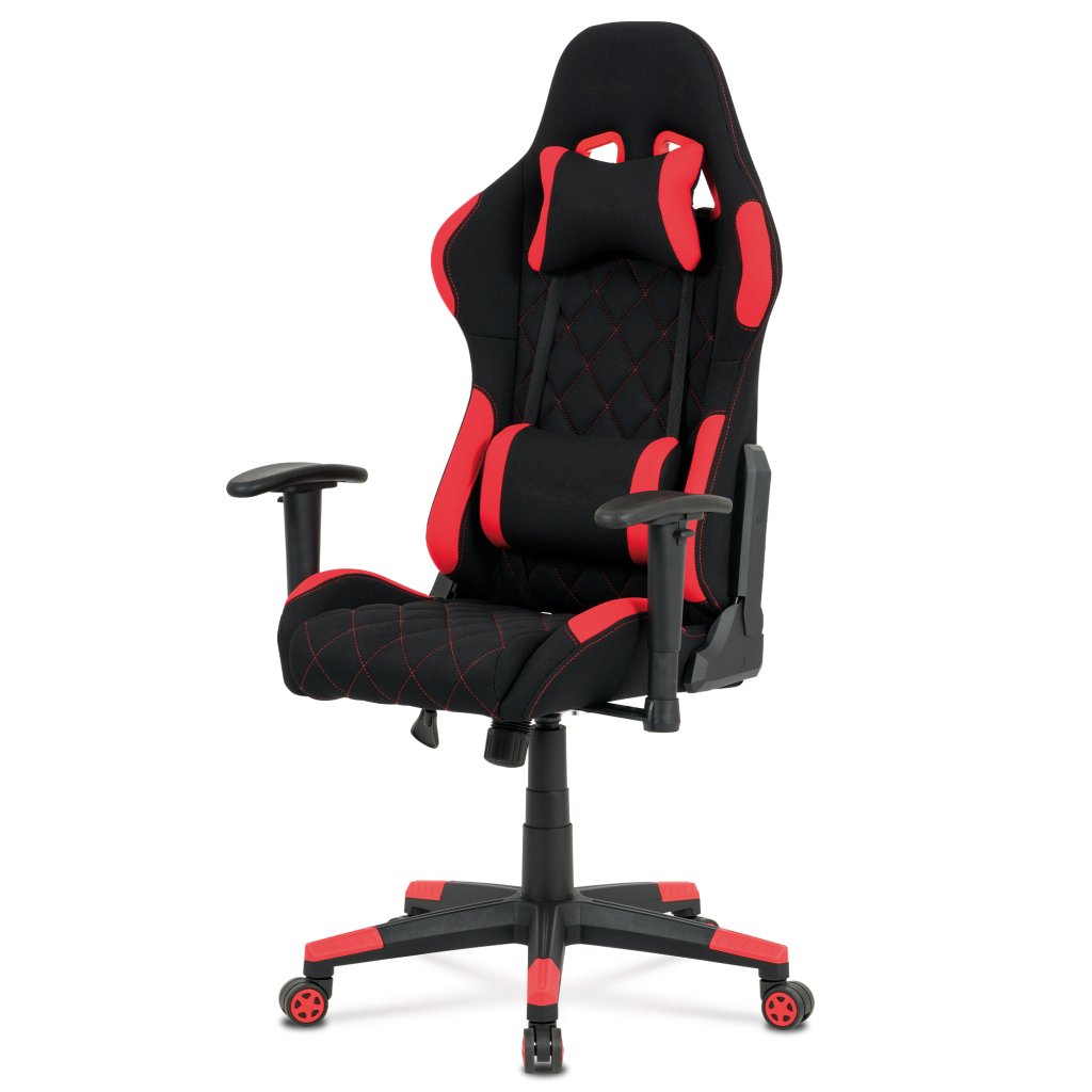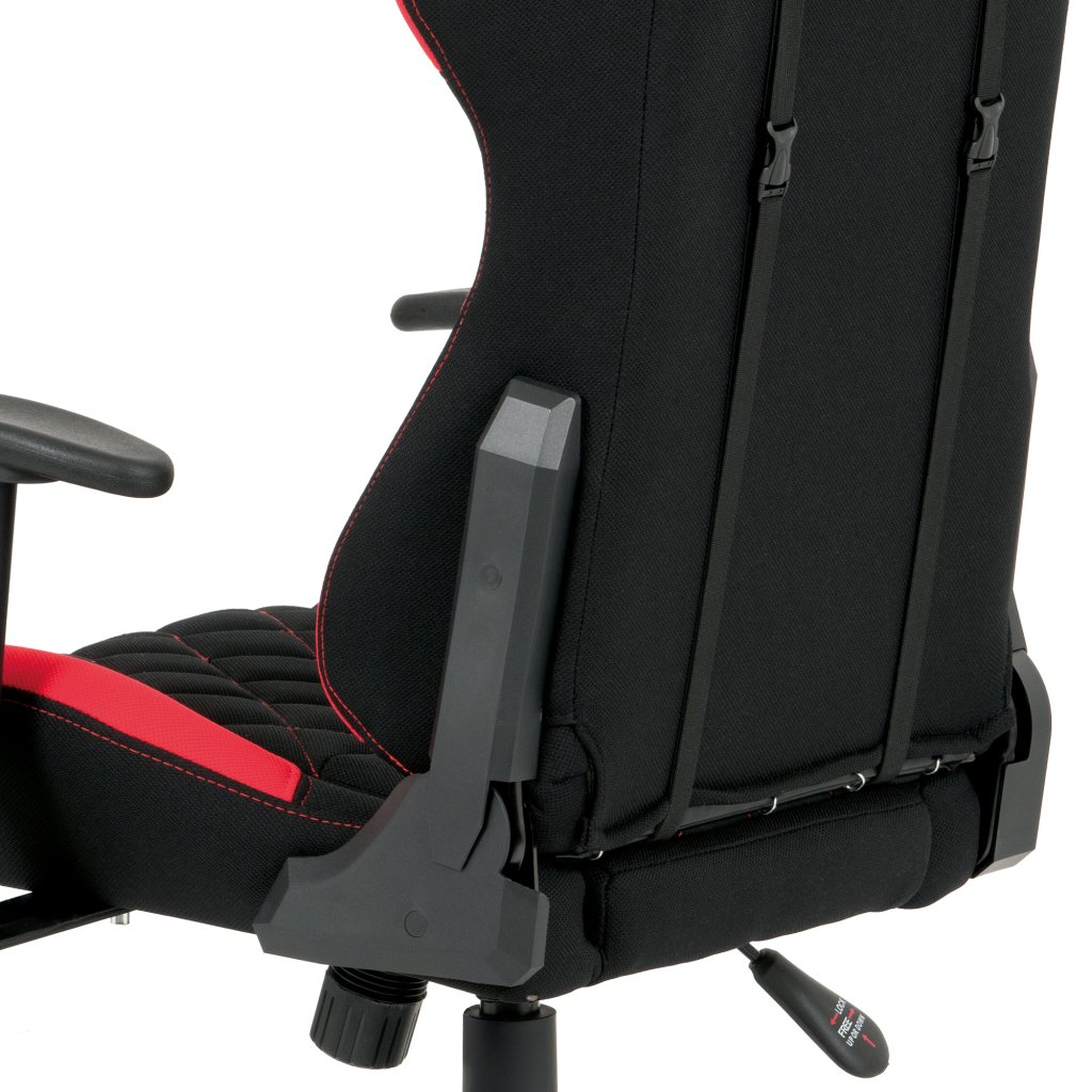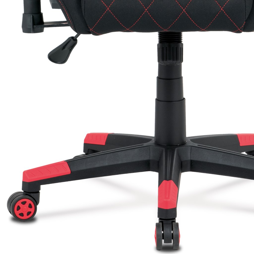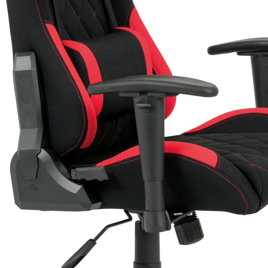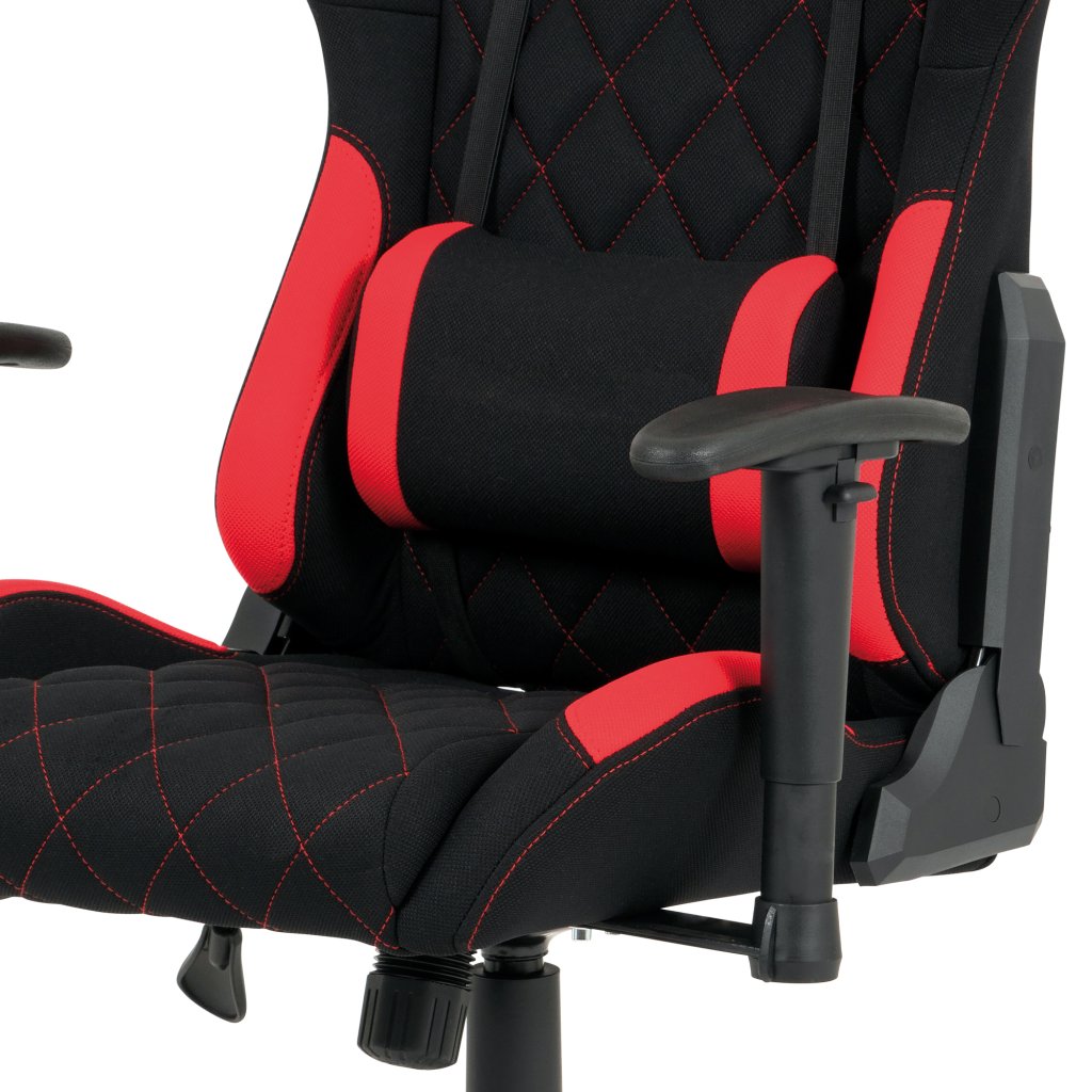 Moderní kancelářské křeslo, které každý správný hráč musí mít! Židle je potažená černo-červenou látkou se stylovým šedým prošitím sedáku i opěráku. Hernímu vzhledu přidají i dva průřezové otvory v opěráku z černého plastu. Na maximálním pohodlí při herních výkonech přidají i polštářky pod hlavou a v bederní oblasti, které lze libovolně odepnout. Ruce si můžete pohodlně opřít o výškově nastavitelné a polohovací područky z měkčeného plastu. Toto křeslo je výškově nastavitelné s houpacím mechanismem a se samostatně polohovatelným opěrákem. Pod sedákem je šroub upravující tuhost pohupu. Křeslo má také tvrzený plastový kříž černé barvy s červenými protiskluzovými prvky a plastovými kolečky, která jsou vhodná na koberce. Výška sedu je 45 až 55 cm, kdy celková výška je 125 až 135 cm. Šířka sedu je 52 cm, hloubka sedu je 46 cm. Nosnost židle je až 130 kg. Zboží je dodáváno v demontu.