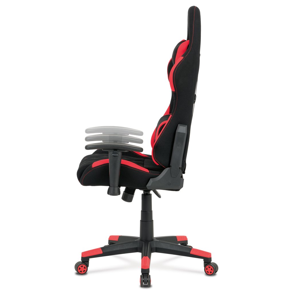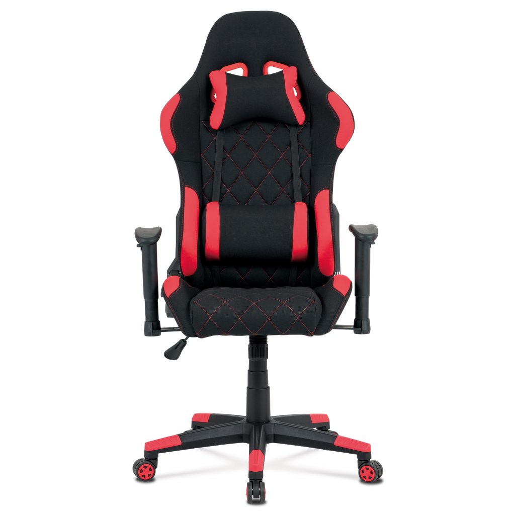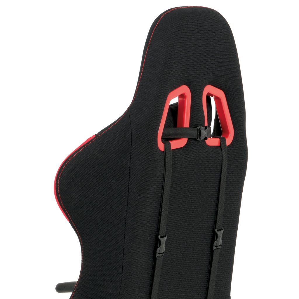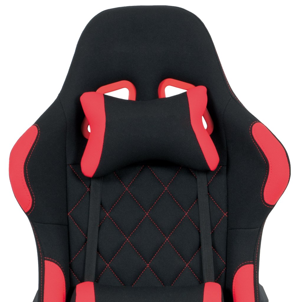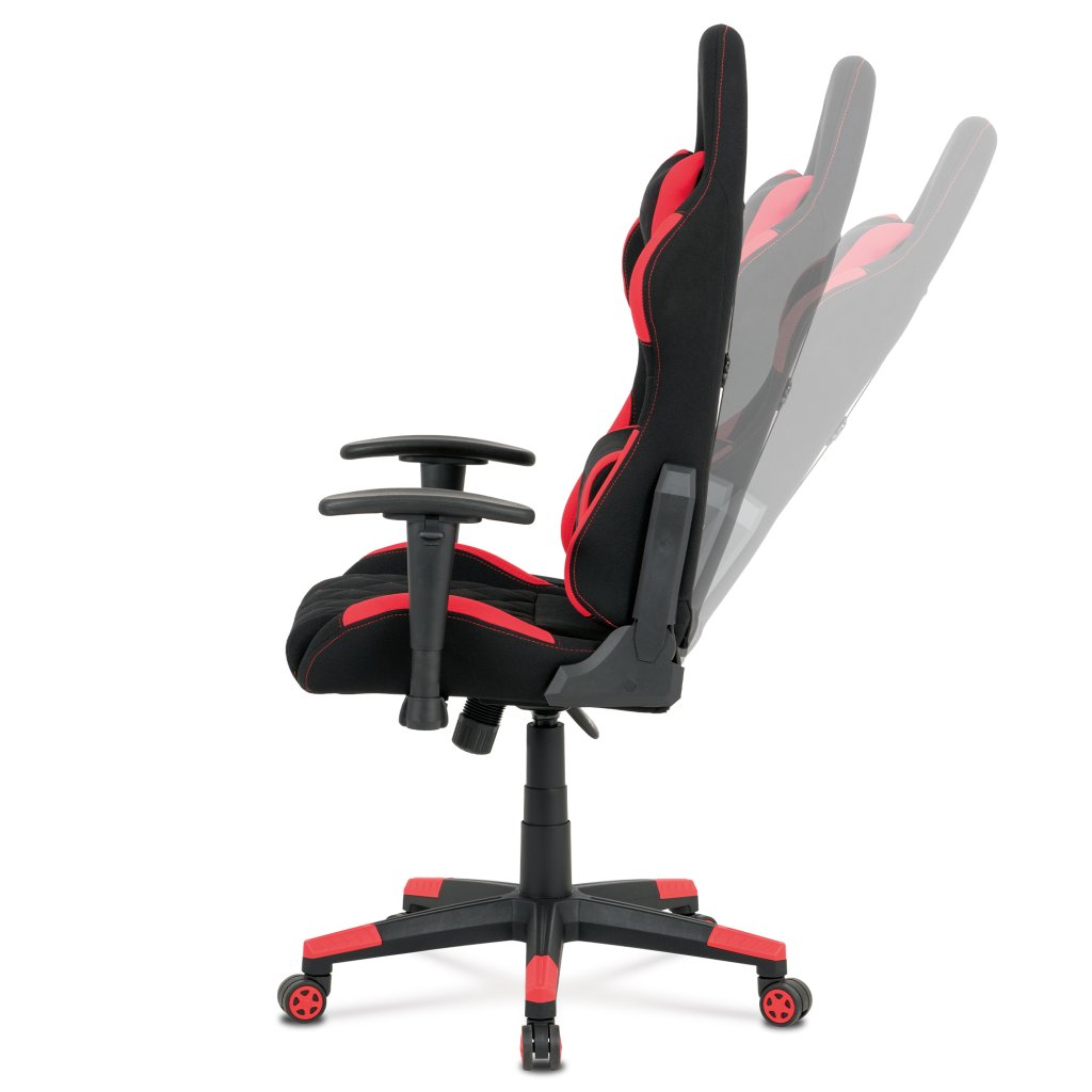 Moderní kancelářské křeslo, které každý správný hráč musí mít! Židle je potažená černo-červenou látkou se stylovým šedým prošitím sedáku i opěráku. Hernímu vzhledu přidají i dva průřezové otvory v opěráku z černého plastu. Na maximálním pohodlí při herních výkonech přidají i polštářky pod hlavou a v bederní oblasti, které lze libovolně odepnout. Ruce si můžete pohodlně opřít o výškově nastavitelné a polohovací područky z měkčeného plastu. Toto křeslo je výškově nastavitelné s houpacím mechanismem a se samostatně polohovatelným opěrákem. Pod sedákem je šroub upravující tuhost pohupu. Křeslo má také tvrzený plastový kříž černé barvy s červenými protiskluzovými prvky a plastovými kolečky, která jsou vhodná na koberce. Výška sedu je 45 až 55 cm, kdy celková výška je 125 až 135 cm. Šířka sedu je 52 cm, hloubka sedu je 46 cm. Nosnost židle je až 130 kg. Zboží je dodáváno v demontu.