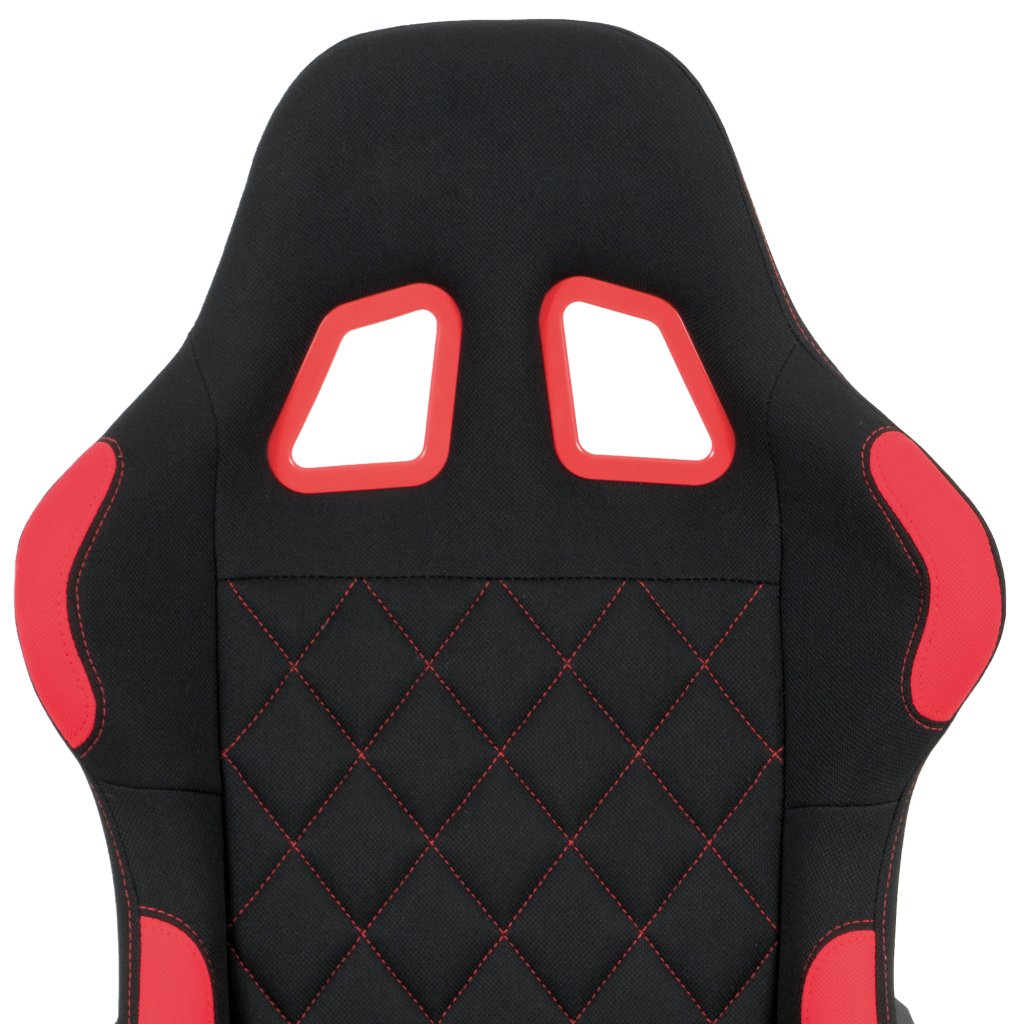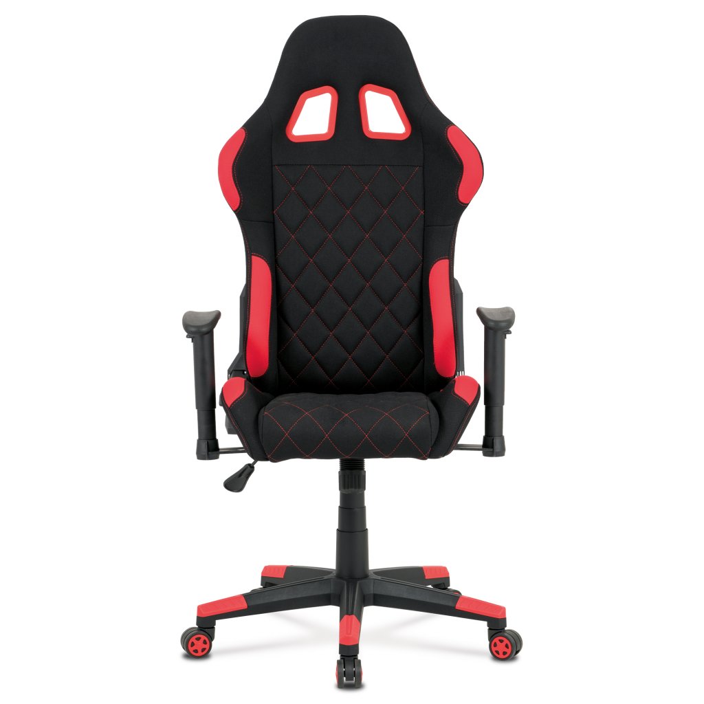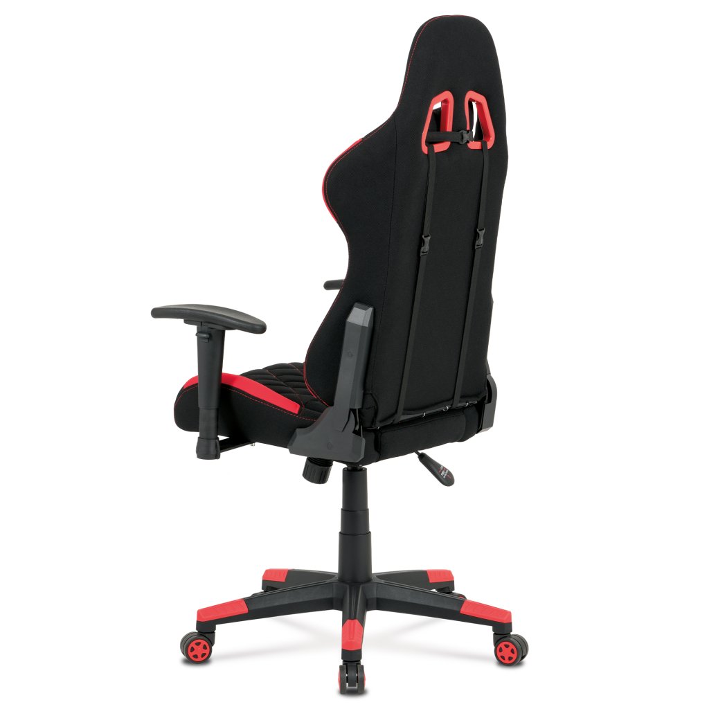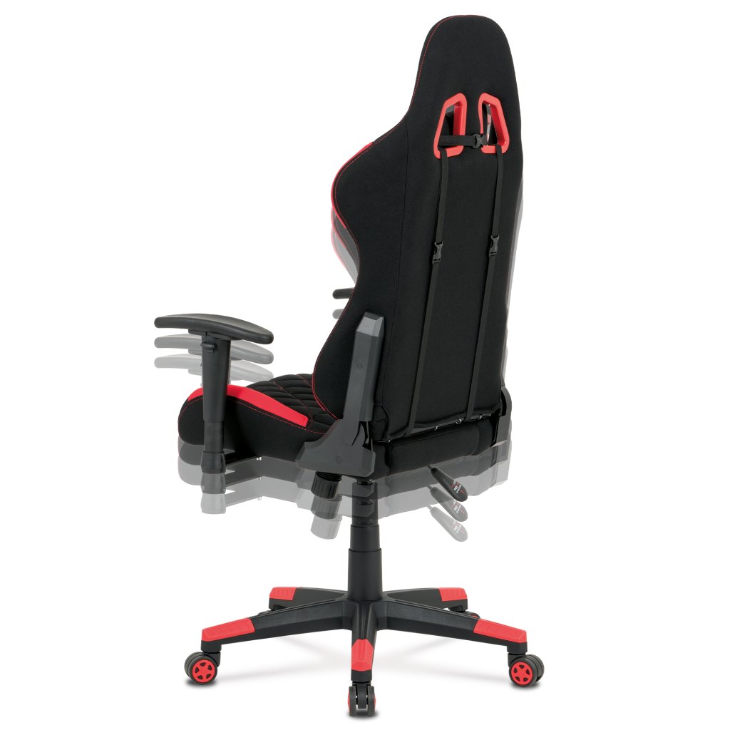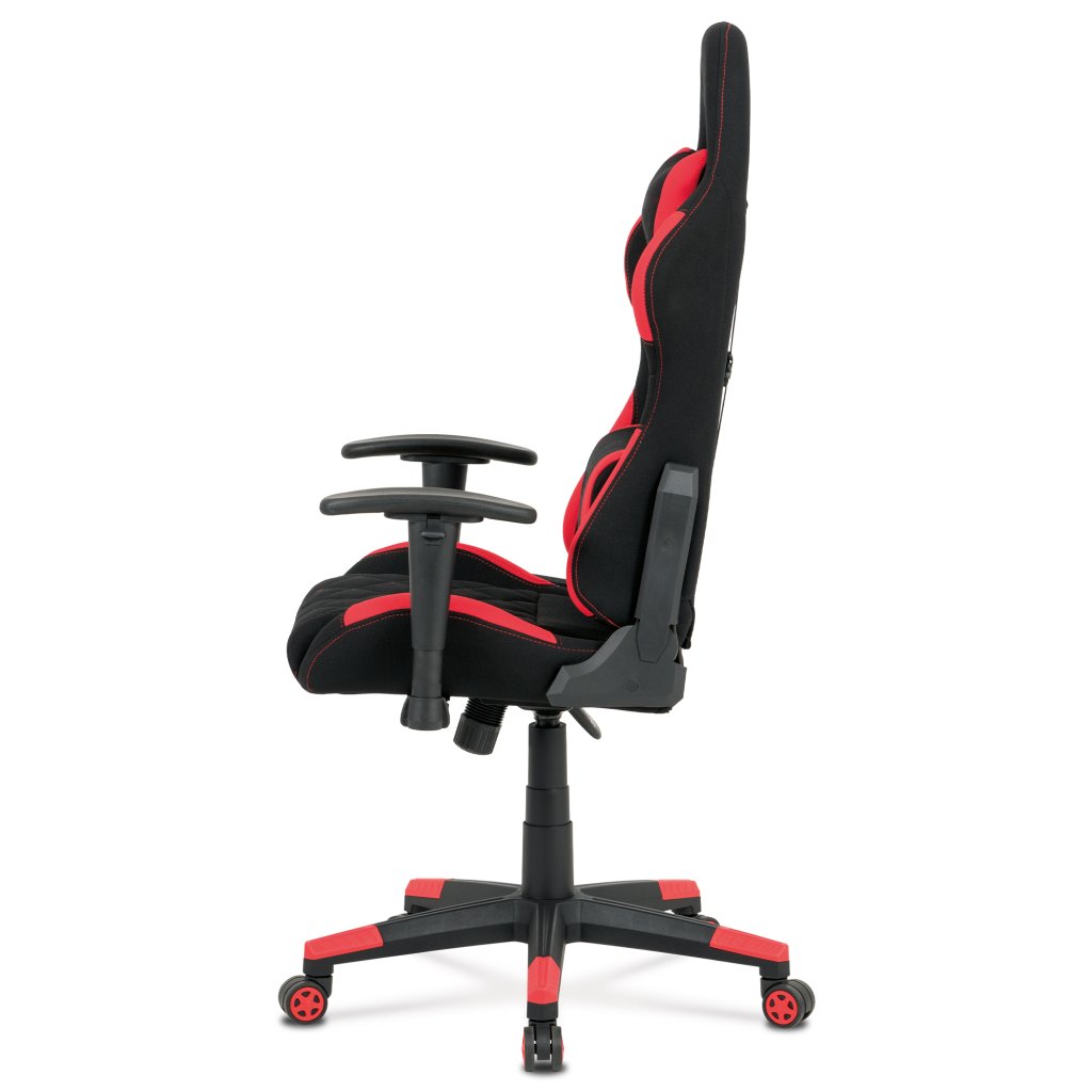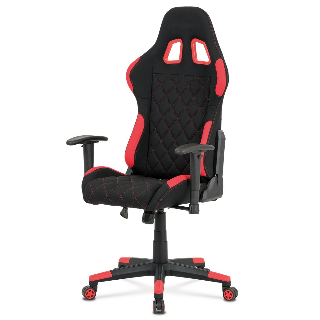 Moderní kancelářské křeslo, které každý správný hráč musí mít! Židle je potažená černo-červenou látkou se stylovým šedým prošitím sedáku i opěráku. Hernímu vzhledu přidají i dva průřezové otvory v opěráku z černého plastu. Na maximálním pohodlí při herních výkonech přidají i polštářky pod hlavou a v bederní oblasti, které lze libovolně odepnout. Ruce si můžete pohodlně opřít o výškově nastavitelné a polohovací područky z měkčeného plastu. Toto křeslo je výškově nastavitelné s houpacím mechanismem a se samostatně polohovatelným opěrákem. Pod sedákem je šroub upravující tuhost pohupu. Křeslo má také tvrzený plastový kříž černé barvy s červenými protiskluzovými prvky a plastovými kolečky, která jsou vhodná na koberce. Výška sedu je 45 až 55 cm, kdy celková výška je 125 až 135 cm. Šířka sedu je 52 cm, hloubka sedu je 46 cm. Nosnost židle je až 130 kg. Zboží je dodáváno v demontu.