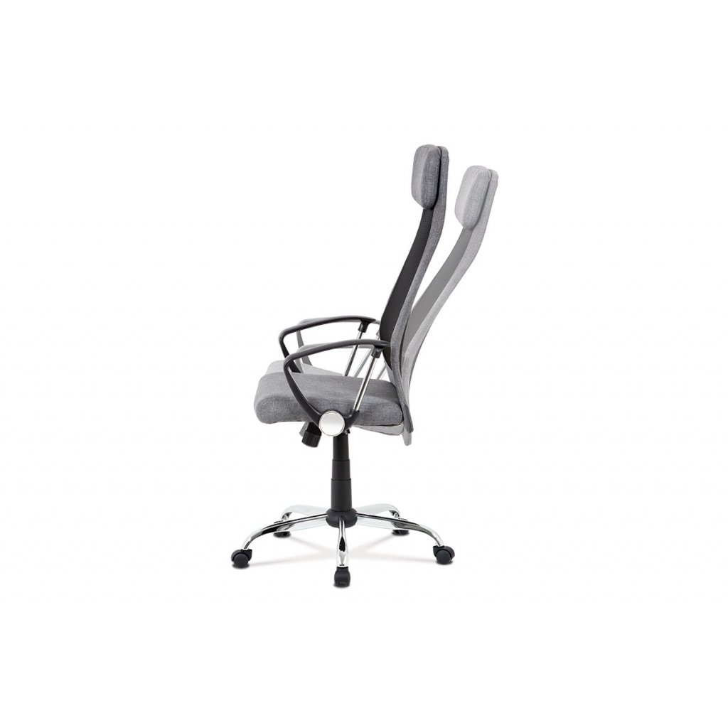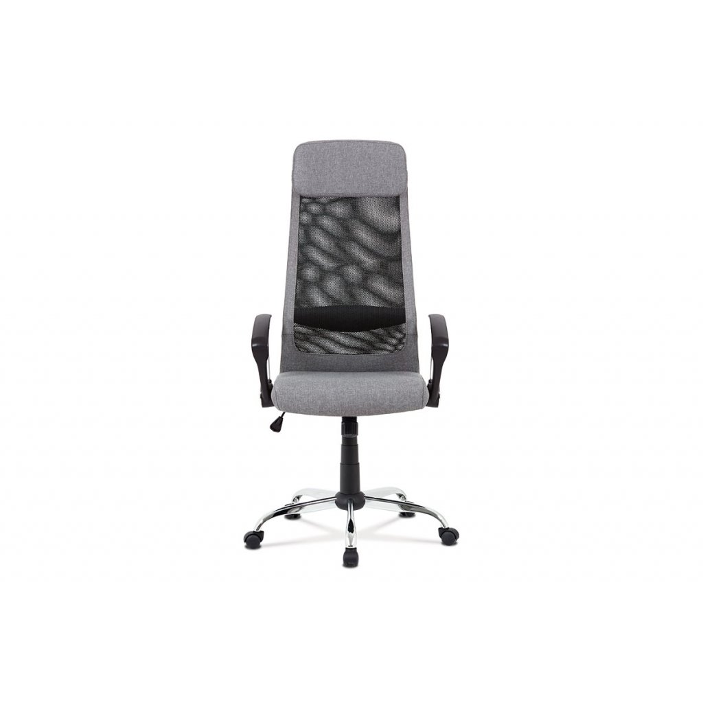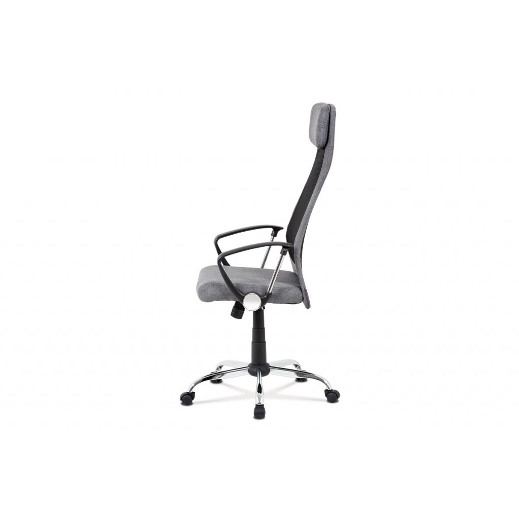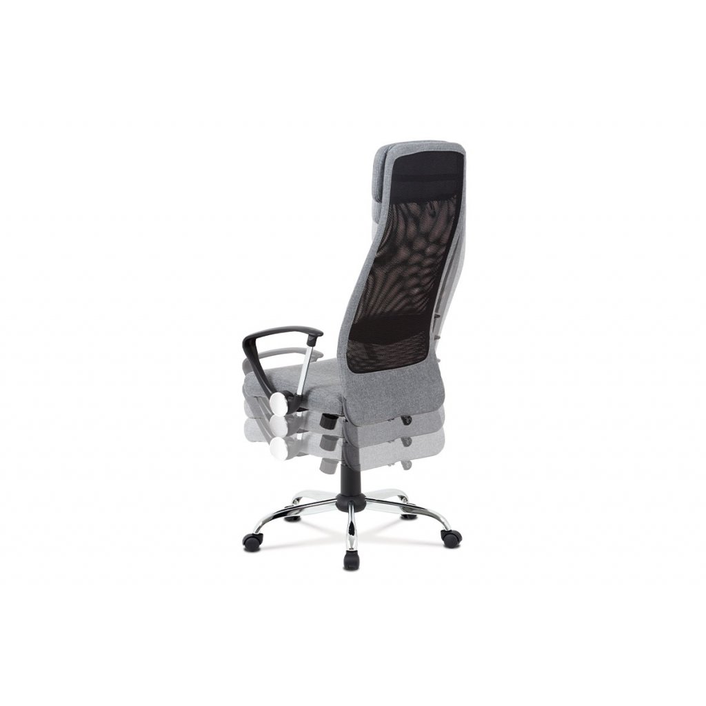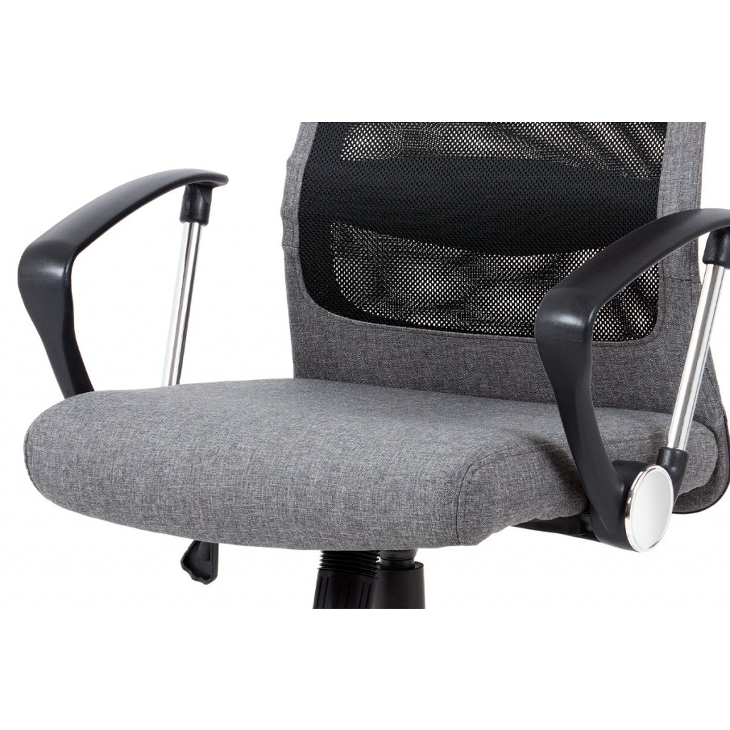 Stylová kancelářská židle šedé barvy do moderní doby je díky kvalitnímu pístu výškově nastavitelná, s houpacím mechanismem, zesíleným kovovým křížem s chromovou úpravou a plastovými kolečky vhodnými na koberce. Pohodlný sedák je potažený příjemnou látkou šedé barvy. Na naprostém pohodlí přidá i prodyšný opěrák potažený černou síťovinou a šedou látkou, a to především díky polstrované výztuži v bederní oblasti a příjemně polstrovanému podhlavníku. Vrcholem komfortu jsou designově dokonalé pevné plastové područky černé barvy, které obsahují kovové vzpěry a další prvky s chromovou úpravou, což přidá na super moderním vzhledu židle. Díky houpacímu mechanismu dosáhne židle maximálního pohodlí pro svého uživatele. Tuhost houpaní lze regulovat velkým plastovým šroubem, který je umístěn pod sedákem.