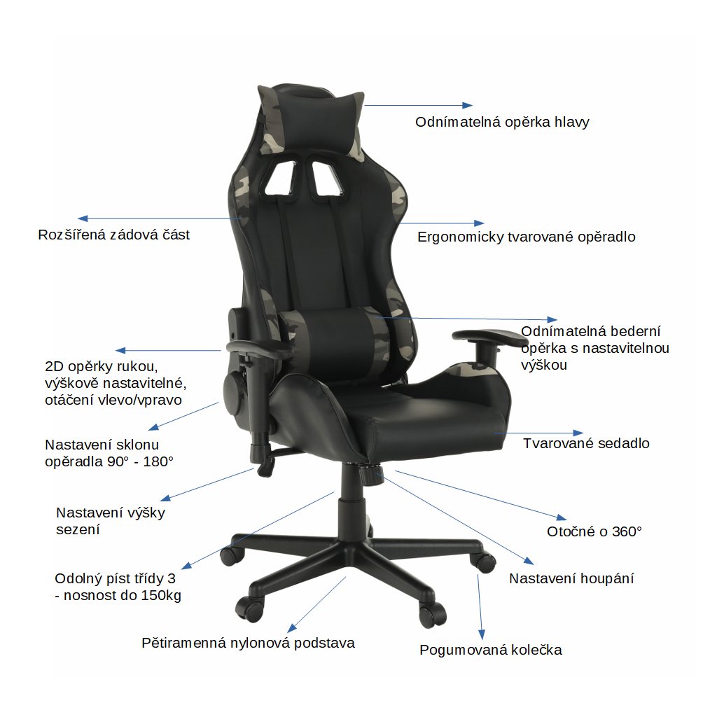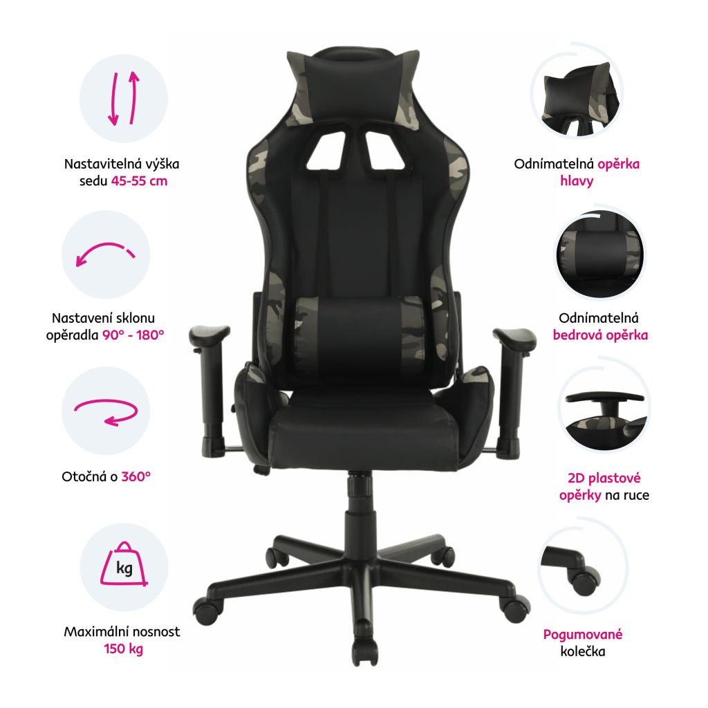 Herní a kancelářské křeslo EMRE, v provedení černé barvy v kombinaci s maskáčovým vzorem, s plastovým křížem, v moderním designu. Konstrukce sedáku a opěráku je vyrobena z kovu. Křeslo je otočné o 360 ° s možností nastavení sklonu opěradla 90 ° - 180 °. V oblasti zad a hlavy jsou umístěny odnímatelné polštářky. Ergonomicky tvarované opěradlo s rozšířenou zádovou částí a výškově nastavitelnou bederní opěrkou zvyšují komfortní sezení, především při delším čase stráveném u počítače. Výškově nastavitelné a otočné područky s čalouněnou ložnou plochou jsou skvělým pomocníkem pro unavené ruce. Stabilitu křesla zajišťuje plastový kříž, na němž jsou umístěna pogumovaná kolečka.