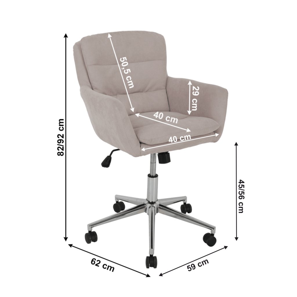 Kancelářské křeslo KAILA čalouněné látkou v béžovém provedení, s kovovou podstavou a pěticípou růžicí, na níž jsou umístěna kolečka, v moderním stylu. Pohodlnější posezení na tomto otočném a výškově nastavitelném křesle je zajištěno i díky područkám.