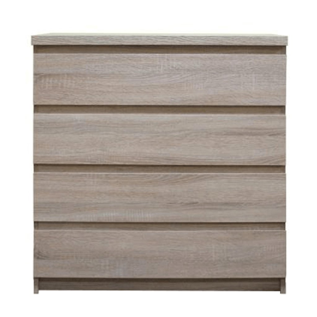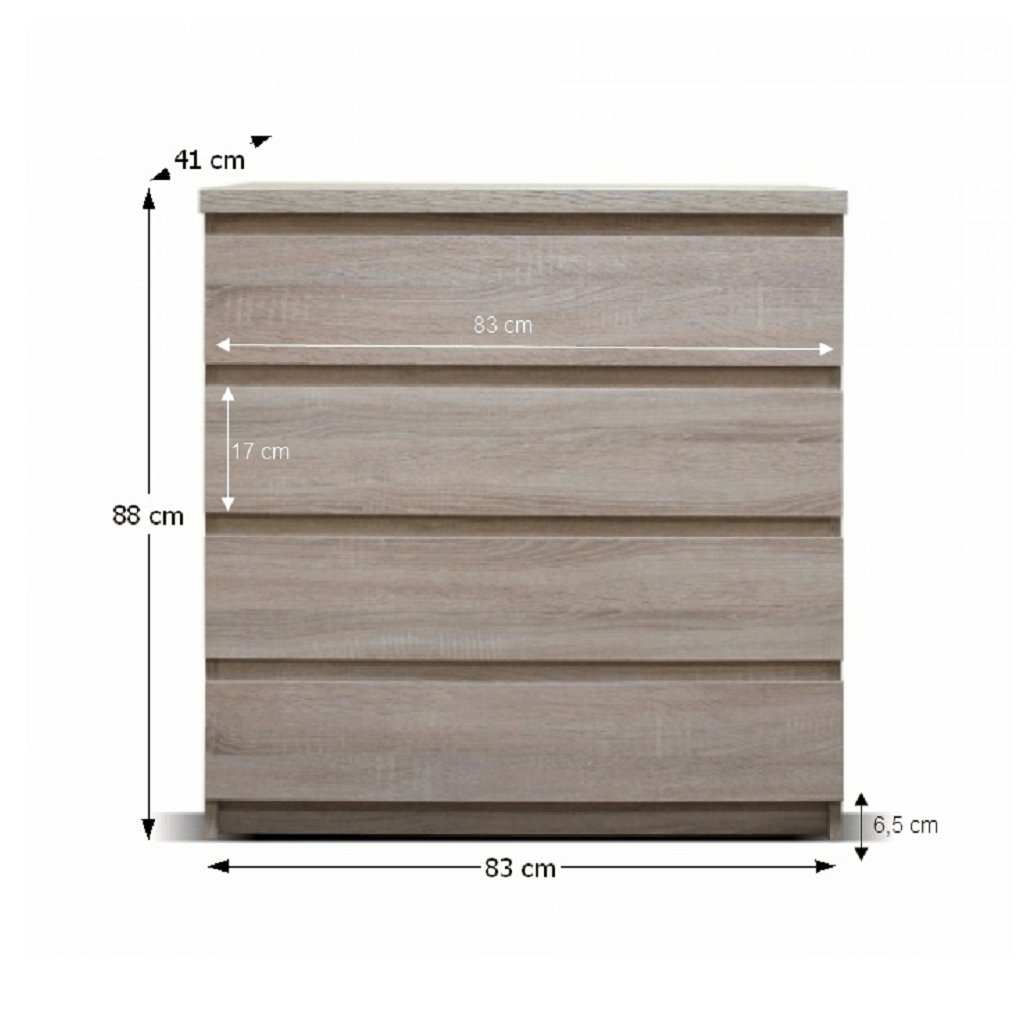 Komoda v jednoduchém moderním provedení se skvěle hodí především do obývacích pokojů a pracoven. Součástí komody jsou čtyři zásuvky, které lze využít pro úschovu různých drobností. Je vyrobena z kvalitního DTD lamina v elegantním provedení dekoru dub sonoma. Skvěle vypadá v sestavě s vitrínou, konferenčním stolkem, regálem a RTV stolkem v tomto samém provedení.