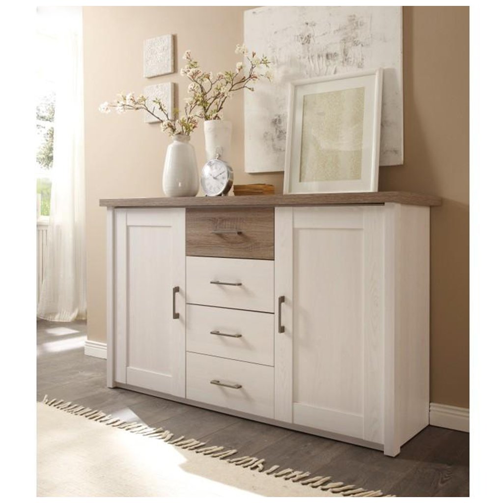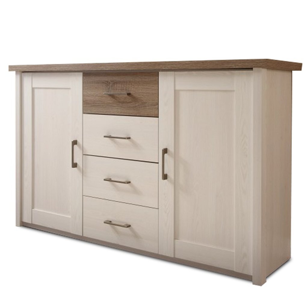 Tato moderní komoda je v provensálském stylu. Ke komodě si můžete dokoupit skříň a postel, jelikož se jedná o sektorový nábytek. Komoda je dvoudvéřová a má čtyři šuplíky. Bude skvělým pomocníkem do vaší ložnice, díky velikému množství úložného prostoru. Komoda je z foliovaného DTD materiálu. Dekor skříně je dub sonoma truflový, který je v báječné kombinaci s bílou barvou pinie. Komoda má kovové úchytky.