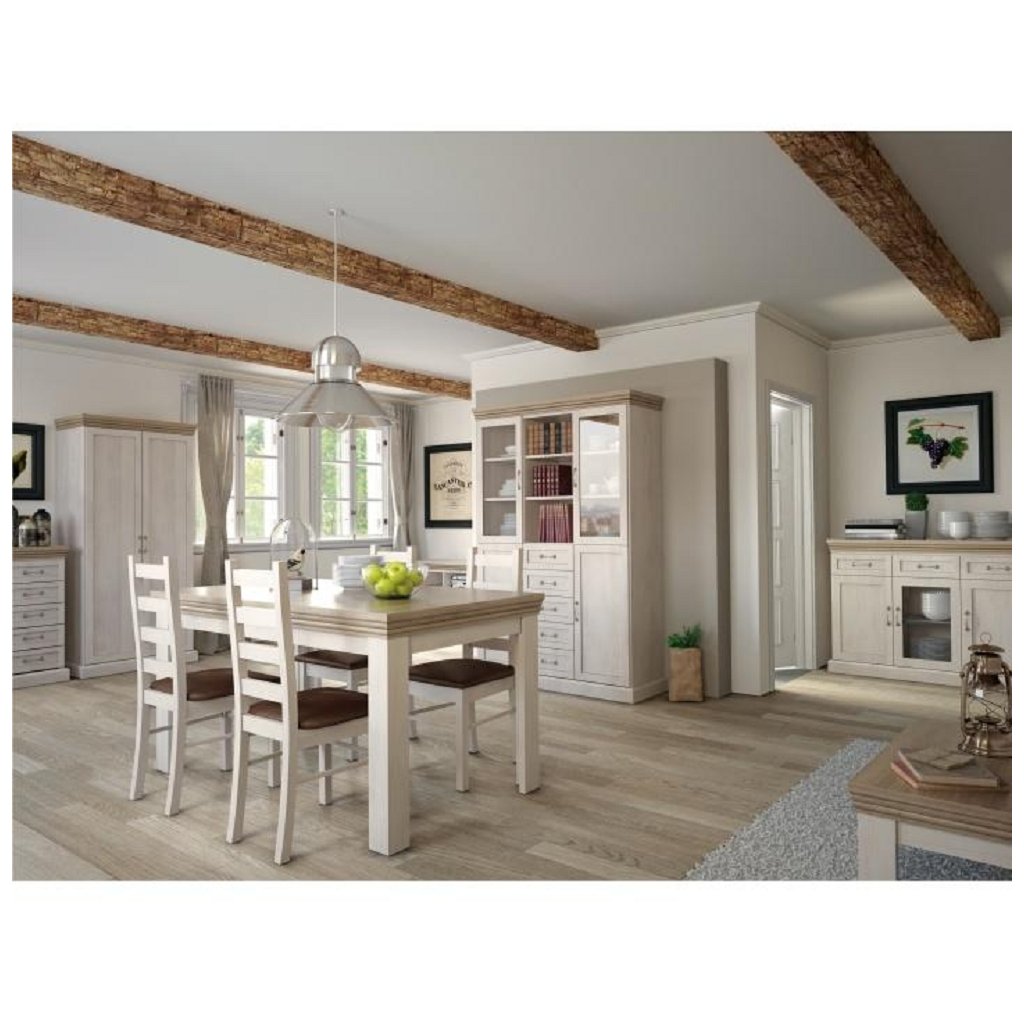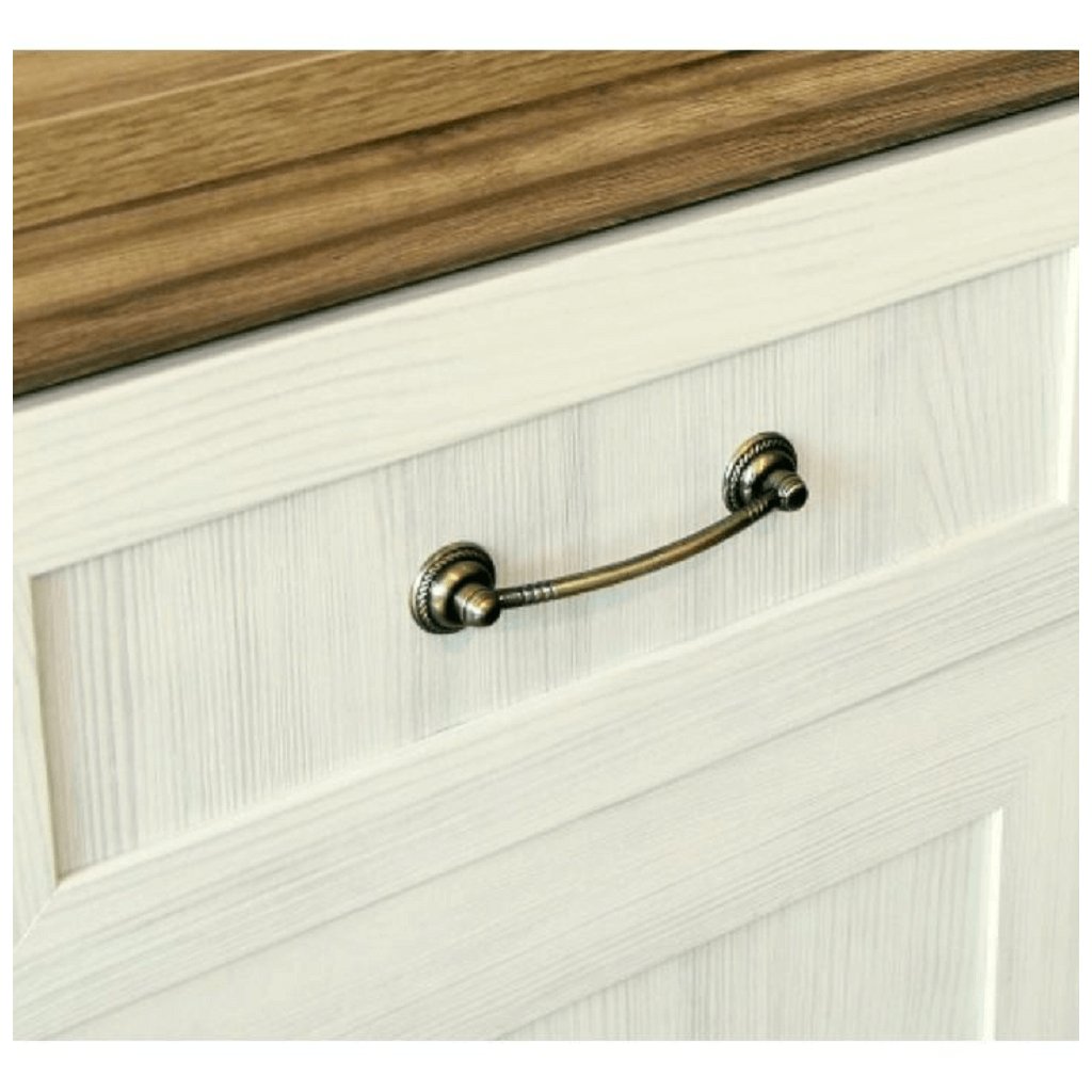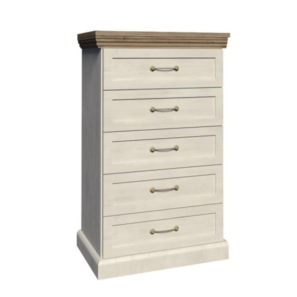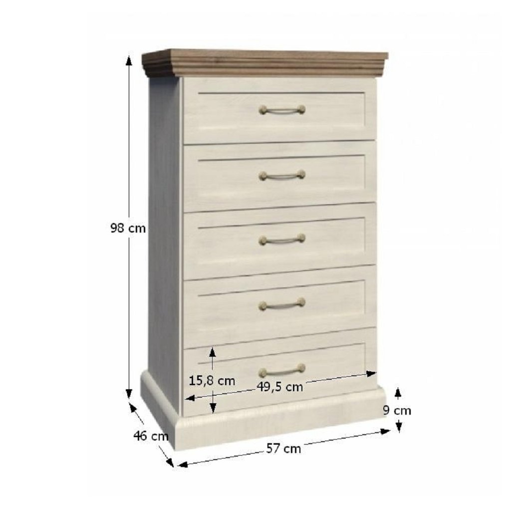 komoda KS5 s pěti zásuvkami z elegantního sektorového systému Royal v provence stylu, ze kterého si můžete vyskládat nábytek podle Vašich představ. Vhodná na zařízení obývacích pokojů, ložnic a jídelen. Materiál: korpus DTD laminovaná + ozdobné lišty, kovové úchyty. Barevné provedení: bílá sosna skandinávská v kombinaci s dubem divokým. Rozměry ŠxVxH: 57x98x46 cm. Dodáváno v demontu.