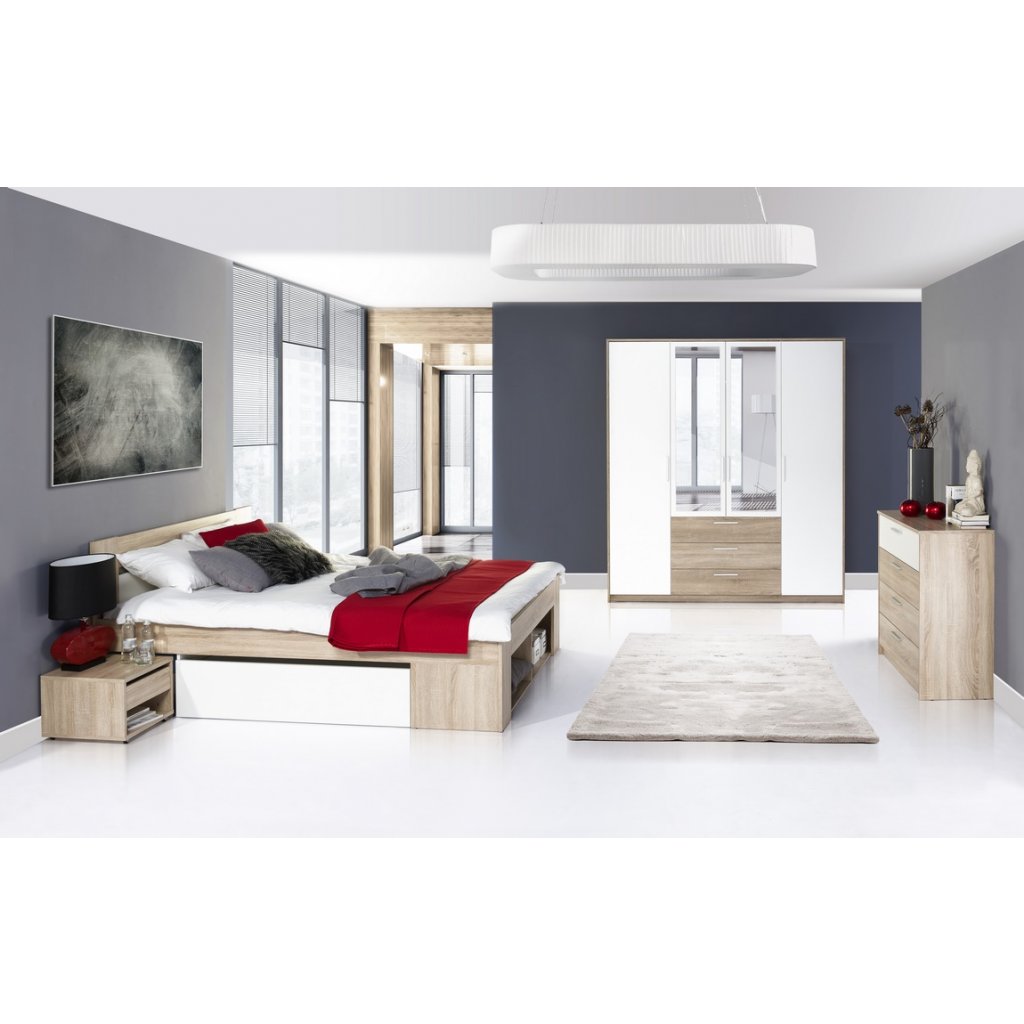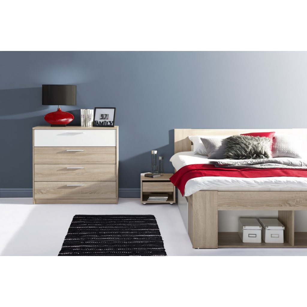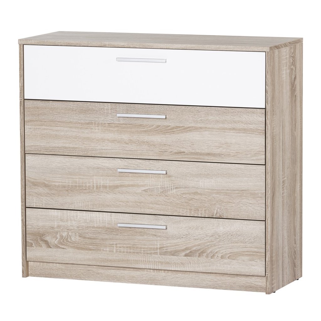 Komoda se 4 zásuvkami v moderním provedení. Korpus i dvířka jsou z kvalitního LTD , barevné provedení - dub sonoma s bílou. Dodáváme v demontovaném stavu.