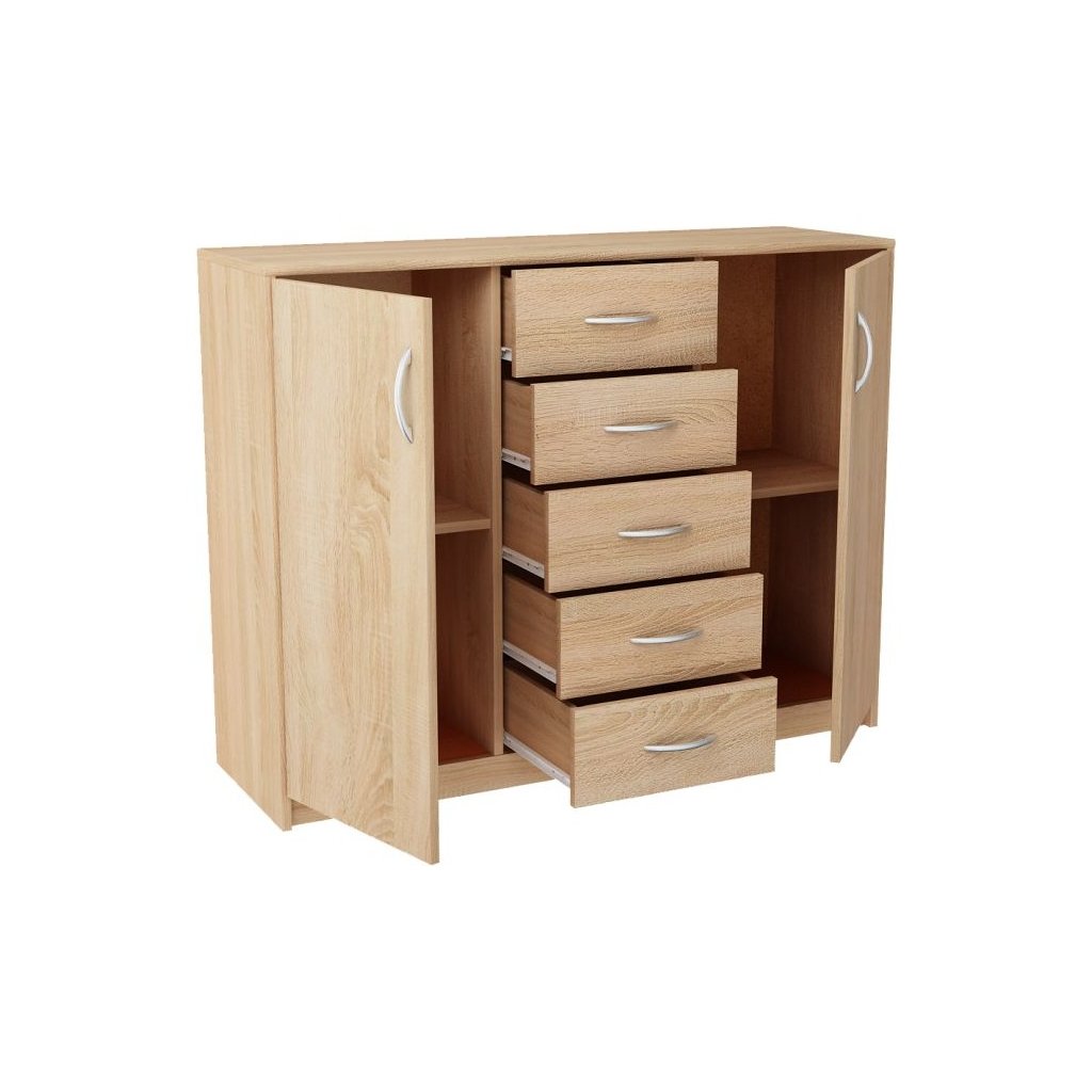 Komoda má pět zásuvek a dvě dvířka. Korpus a dvířka jsou vyrobené z kvalitního LTD v dekoru dub sonoma. Lamino je odolné vůči poškrábání, vysokým teplotám i nárazům. Vše je hraněné ABS páskou. Komoda má svůj design podtržený jasně viditelnou strukturou dřeva. Pojezdy v zásuvkách jsou kovové s plastovými kolečky. V naší nabídce naleznete tuto komodu i v jiných provedeních, včetně různých barevných variant.