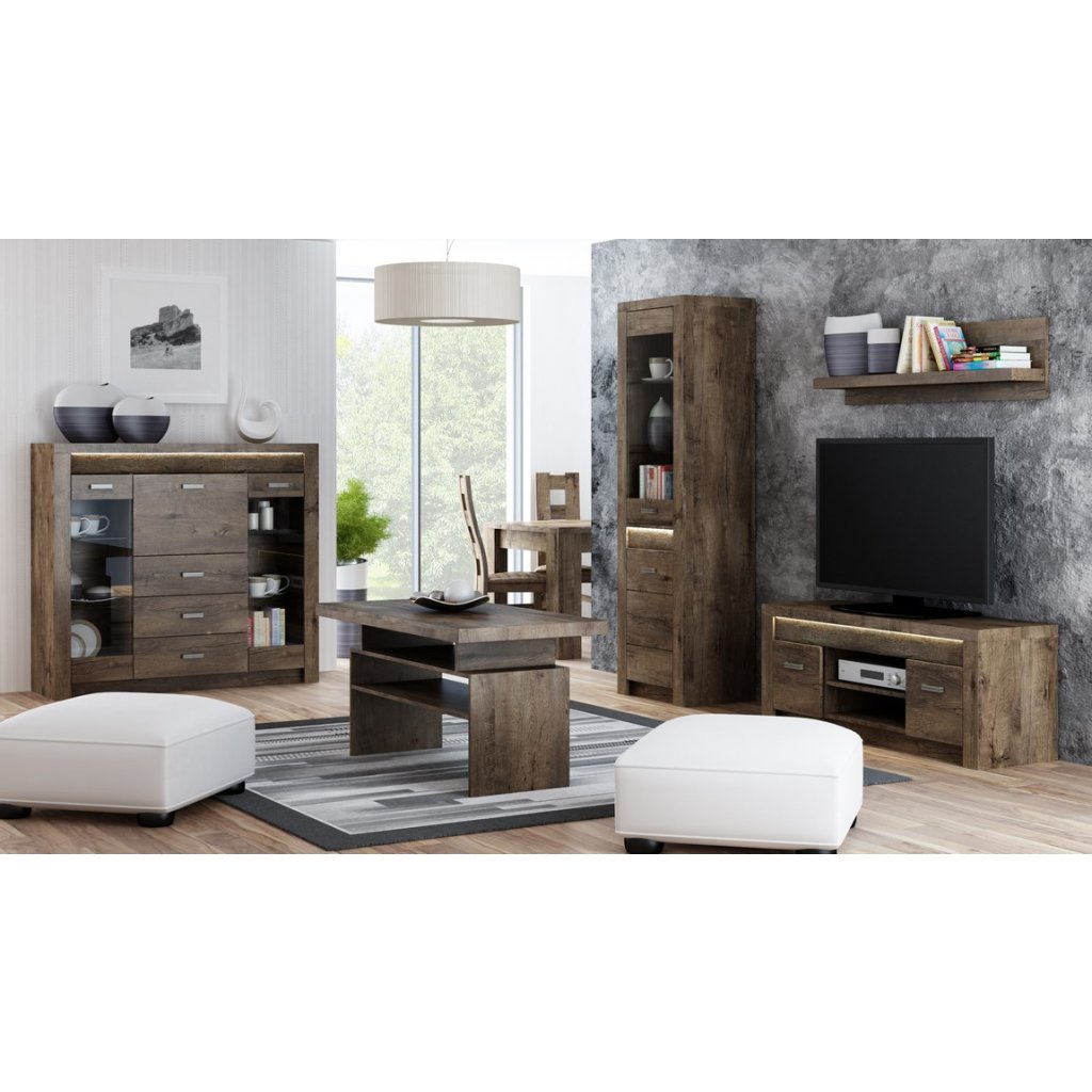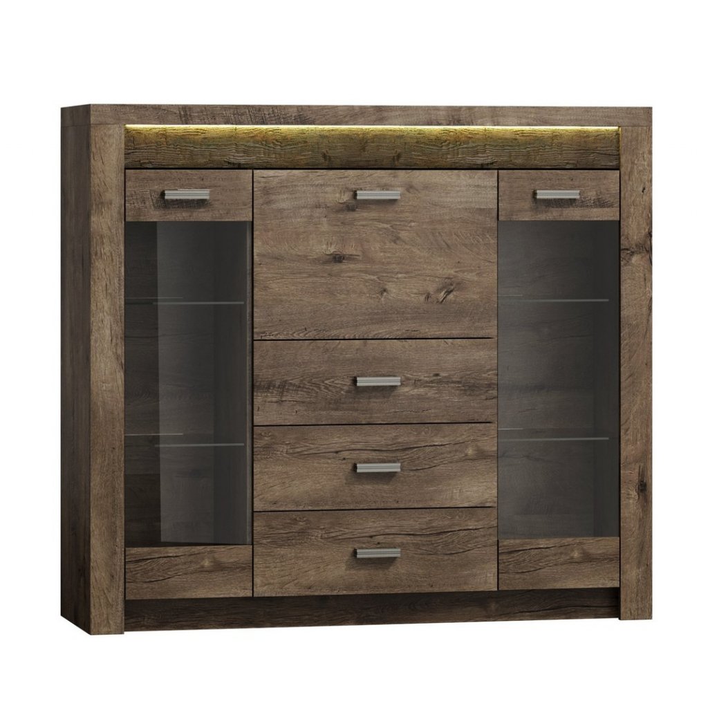 Komoda je v barevném provedení jasan tmavý. Komoda obsahuje dvě vitríny, tři zásuvky a výklopná dvířka. Pokud se Vám nelíbí toto barevné provedení, pak nabízíme tuto komodu i v jiných barvách. Doporučujeme dokoupit LED osvětlení. Tato komoda patří do sektorové řady, která je navržena v moderním duchu. Celá řada se vyznačuje elegancí a jednoduchými tvary, které zaručují plné využití prostoru.