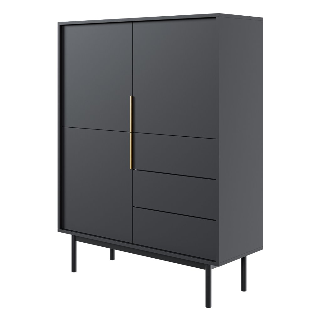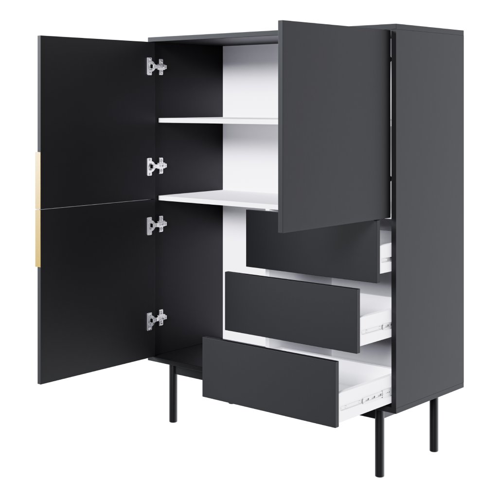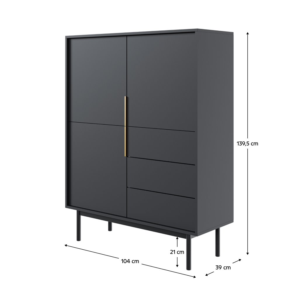 Materiál: DTD laminovaná/ABS hrany/HDF Barva: černá Rozměry (ŠxHxV): 104x39x139,5 cm Tloušťka materiálu: 1,6 cm Třídveřová 3 skříňky Policová 3 šuplíky Na nožičkách Materiál nožiček: kov Bar...