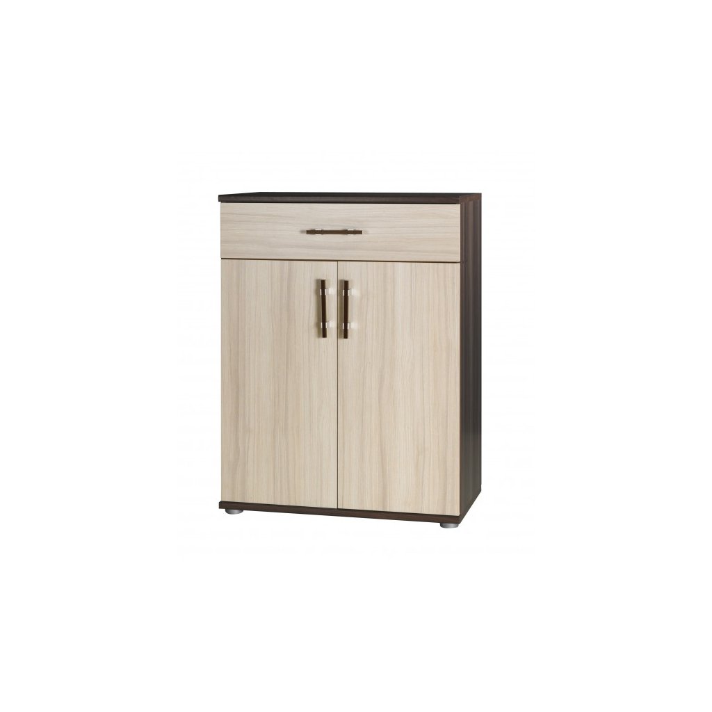 Komoda má jednu širokou zásuvku a dvě dvířka v dekoru jasan světlý a korpus má v dekoru jasan tmavý. Je vyrobena z kvalitního lamina. Komoda patří do sektorové řady, ze které si lze sestavit ložnici, předsíň, pracovnu nebo obývací pokoj.