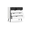 Komoda je navržená v skandinávském stylu a má jednoduchý vzhled, který působí elegantním dojmem. Je v prosté bílé barvě s černými prvky, takže je to ideální volba do každé domácnosti. Komoda je zhotovena z lamina o tloušťce 18 mm, které je velmi odolné a snadné na údržbu. Tento krásný kousek najde uplatnění v ložnici, v obývacím pokoji, ale i v kanceláři nebo předsíni. Díky svému provedení nabízí dostatek místa. Je vybavena třemi zásuvkami v barvě bílé a dvěmi menšími zásuvkami v barvě černé. Skandinávský vzhled komody zdůrazňují vysoké šikmé nožky, které jsou taktéž v černé barvě a obloukové výřezy, které nahrazují úchytky. Komoda patří do sektorového nábytku a díky rozmanitosti nabízených prvků si můžete sestavit obývací pokoj, jídelnu, ložnici či předsíň. Přesná šířka je 98,5 cm. Zboží je dodáváno v demontu a součástí je montážní plánek včetně všech potřebných spojovacích materiálů.