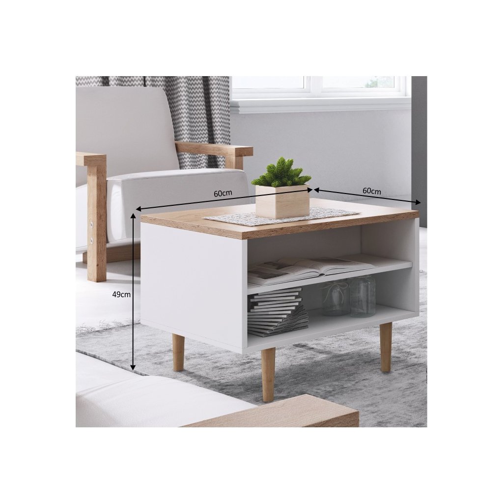 Konferenční stolek barva bílá dekor buk nohy dřevo deska lamino moderní styl čtvercový s úložným prostorem matný povrch.