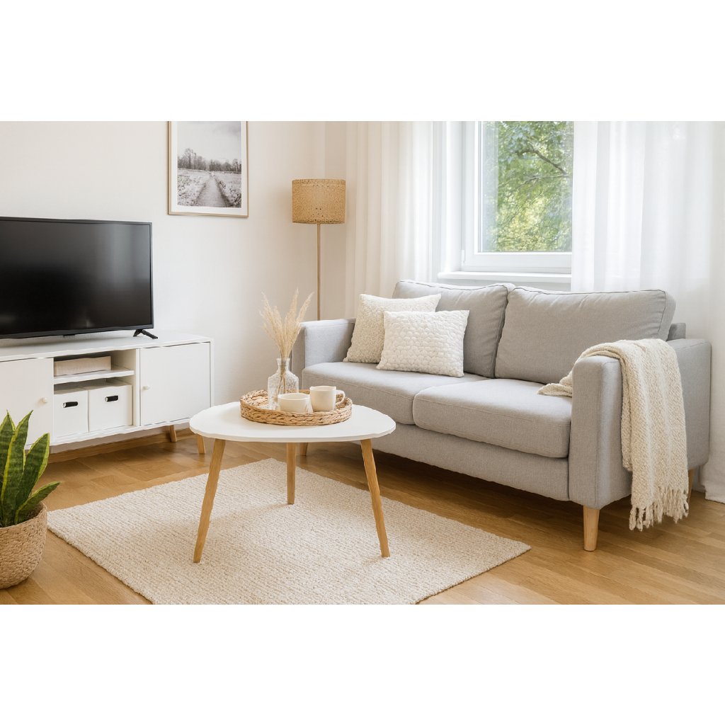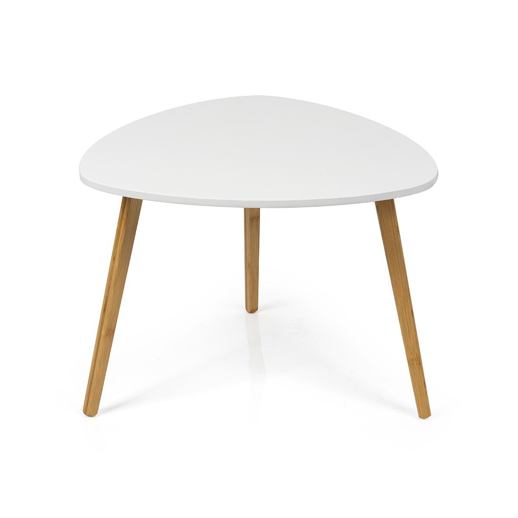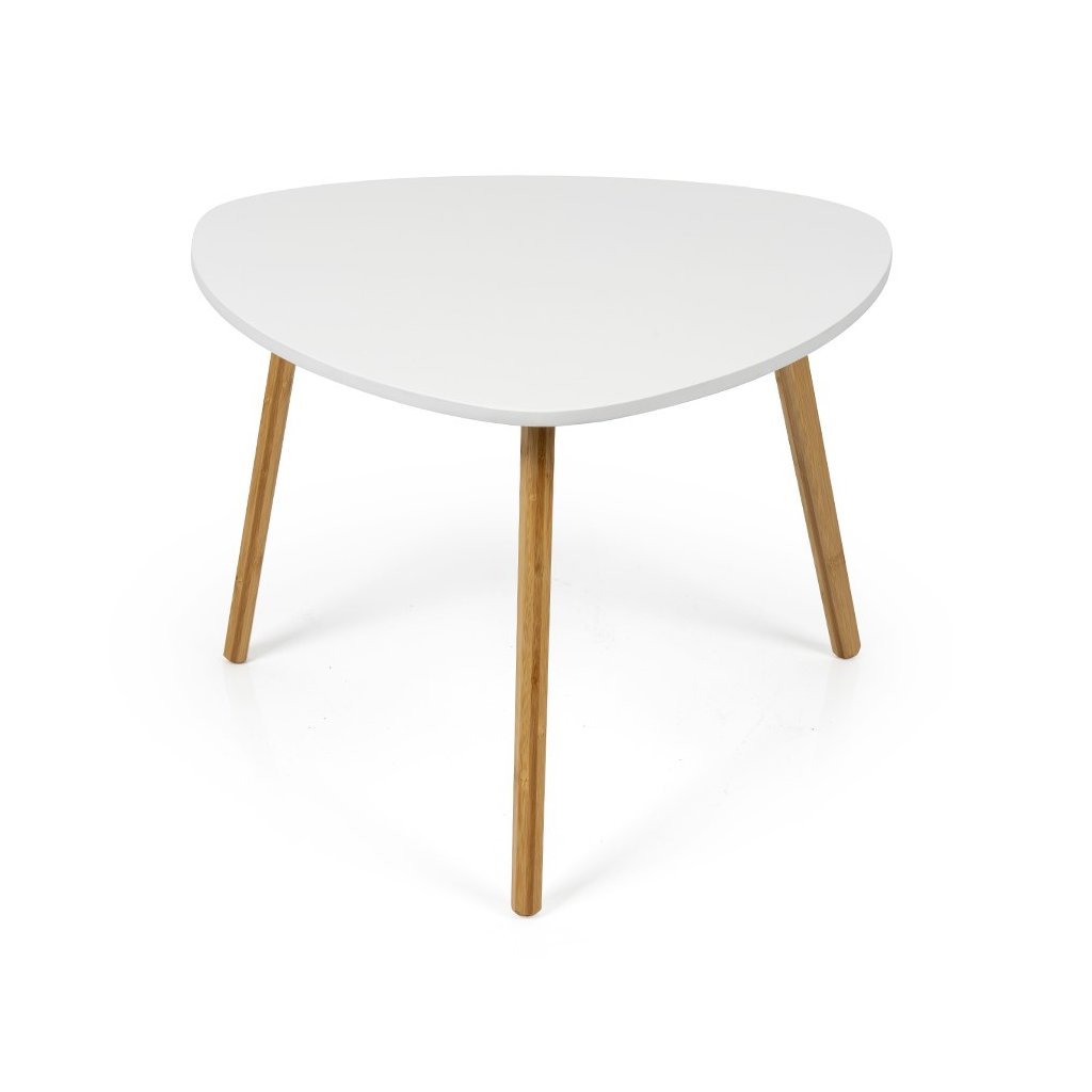 Moderní konferenční stolek s originálním tvarem desky. Bílá stolová deska působí čistě a elegantně. Stabilní nohy z přírodního dřeva dodávají teplý a skandinávský vzhled. Vhodný do obývacího pokoje či moderní pracovny. Kombinace jednoduchosti, praktičnosti a stylového designu.