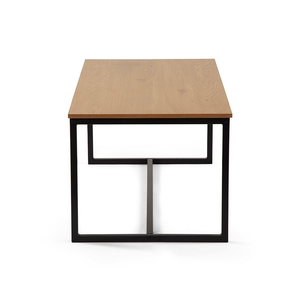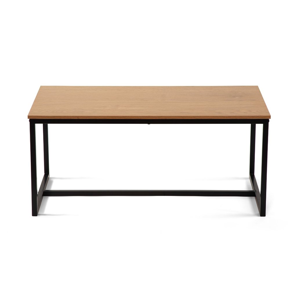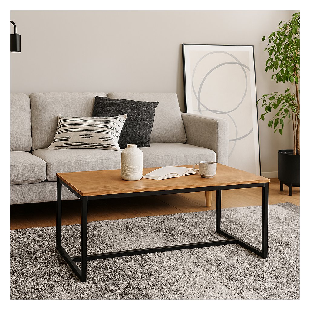 Moderní konferenční stolek s jednoduchým designem. Stolová deska v dekoru přírodního dřeva dodává interiéru hřejivý vzhled. Stabilní kovová konstrukce v černém provedení. Ideální do obývacího pokoje či pracovny. Spojuje praktičnost, odolnost a nadčasový styl.