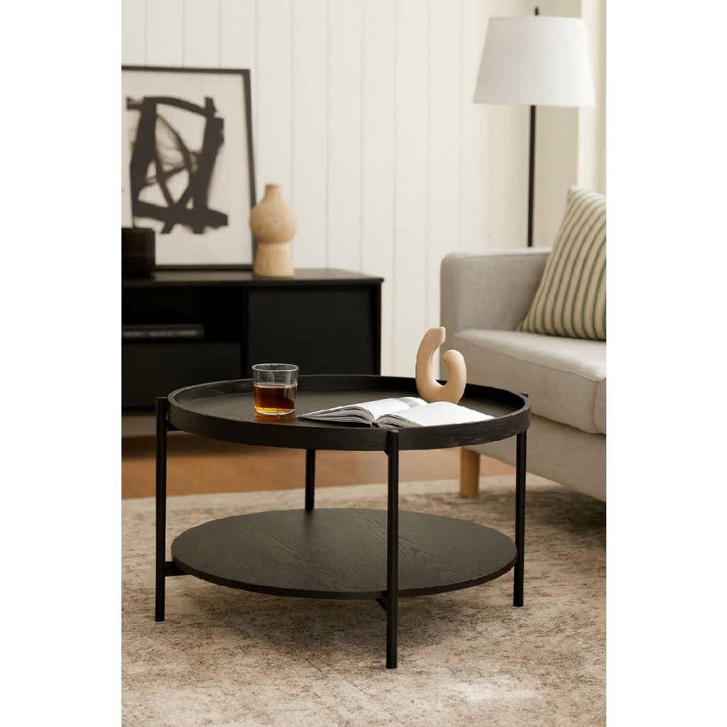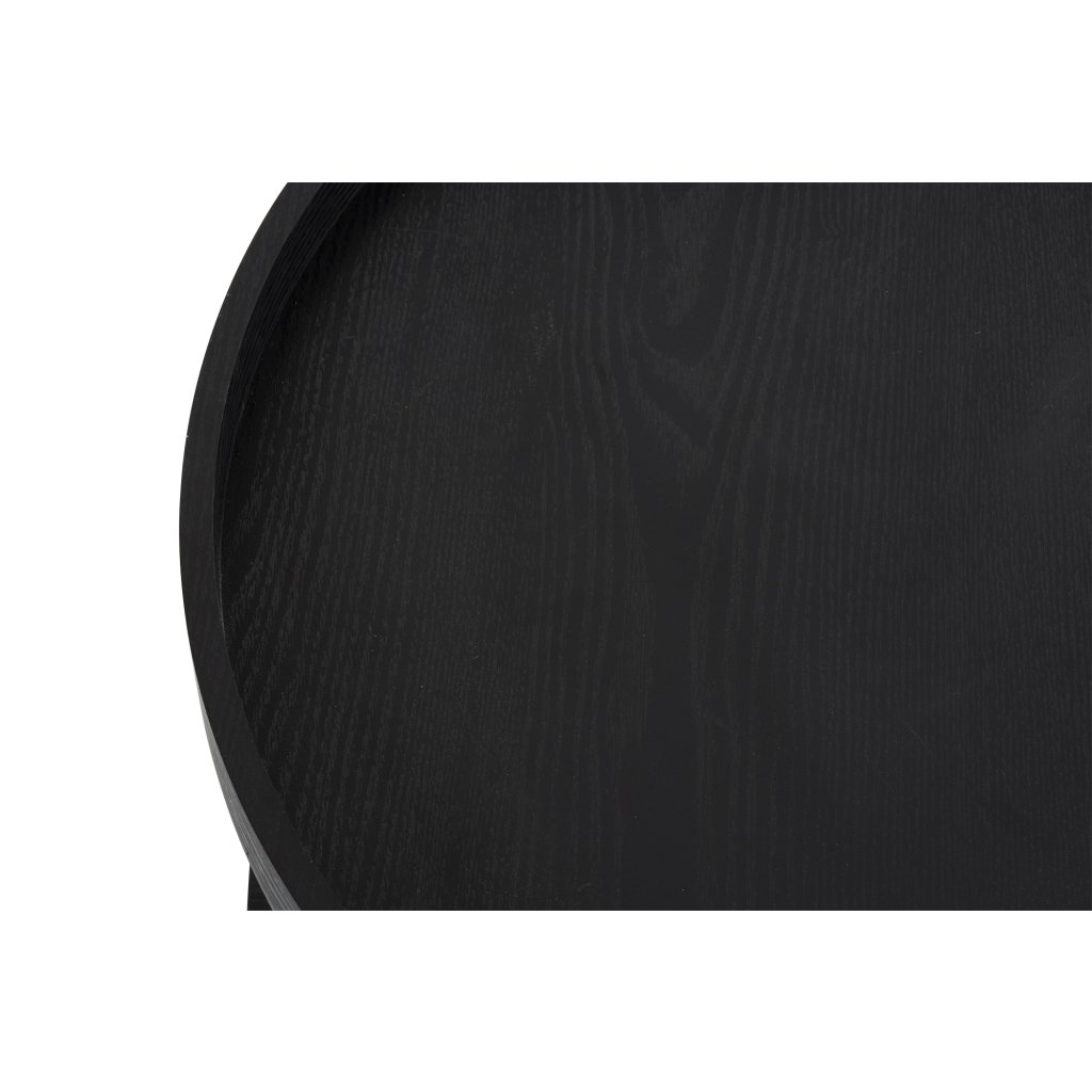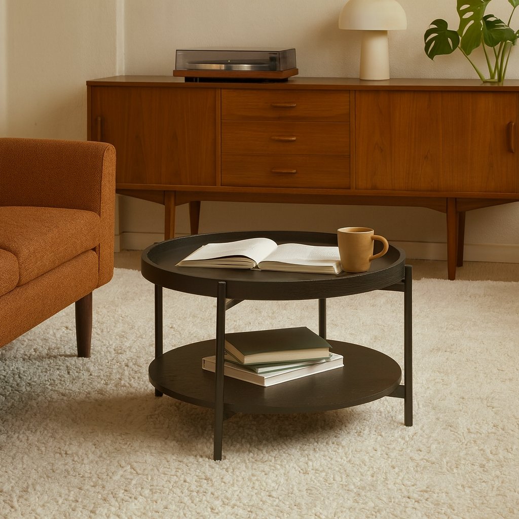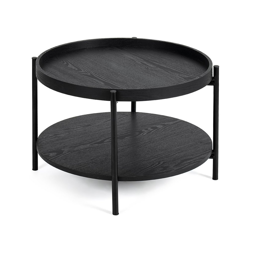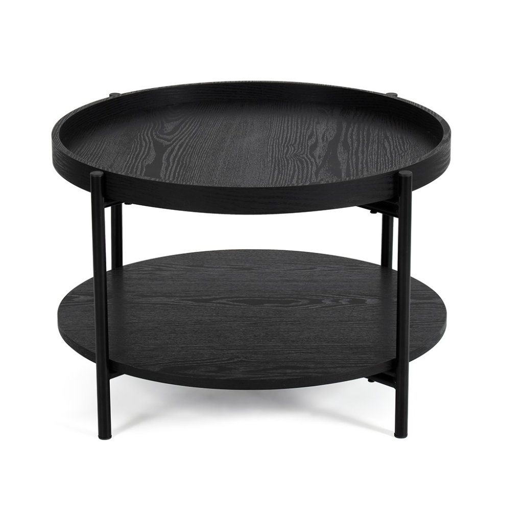 Kulatý konferenční stolek s moderním minimalistickým designem. Dvě odkládací plochy v černém dekoru dřeva pro maximální praktičnost. Stabilní kovová konstrukce v černém provedení. Vhodný do obývacího pokoje či stylové pracovny. Spojuje eleganci, funkčnost a nadčasový vzhled.