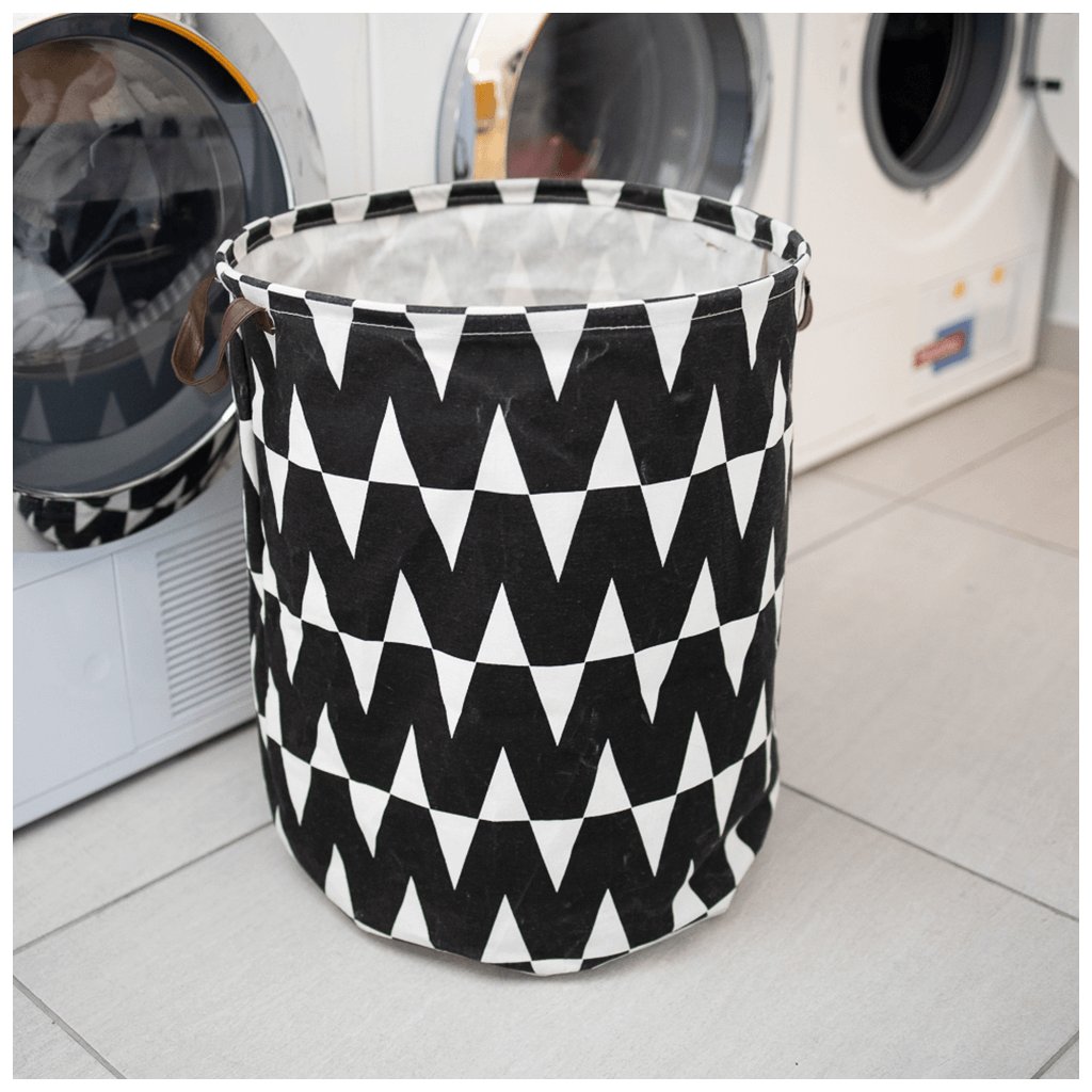 Kulatý látkový koš na prádlo se vzorem v černobílé barvě.