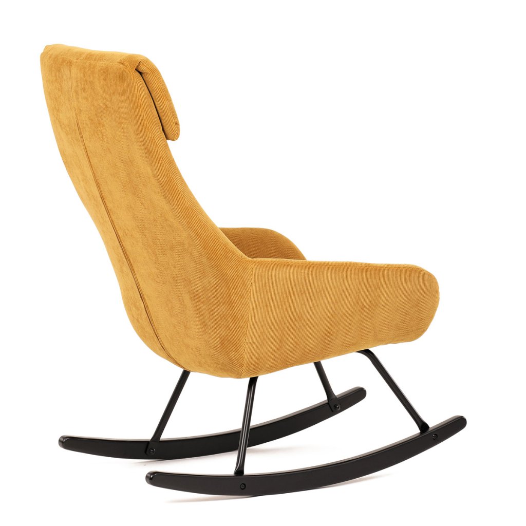 Křeslo houpací, potah žlutá manšestrová látka, dřevěné nohy, masiv kaučukovník AKR110ZL. Rozjasněte svůj interiér stylovým křeslem ve slunečné žluté barvě. Kombinace kvalitního manšestrového potahu a elegantních černých nohou z masivního d...