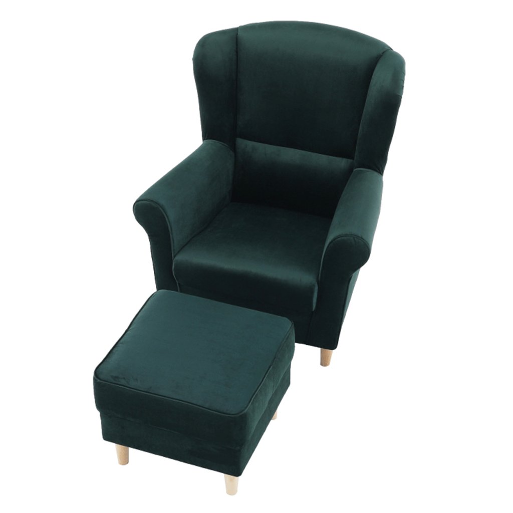 Stylový látkový ušák v okatém smaragdovém provedení (látka Riviera). Křeslo má dřevěné nohy. Můžete ho kombinovat s pestrobarevnou sedačkou pro vytvoření zajímavého kontrastu. Skvěle poslouží pro příjemné posezení s knížkou a uleví celému vašemu tělu. Vysoká opěra zad zároveň slouží i jako opora hlavy. Navíc je doplněn taburetem, abyste si mohli natáhnout nohy při sledování vašich oblíbených pořadů. Sedací část je vyplněna PUR pěnou, která vyniká výbornými vlastnostmi. Na začátku je tužší, ale používáním se stává komfortnější, aniž by ztrácela na objemu. Rozměry taburetu jsou (ŠxVxH) 53x42x53 cm. Dodávané v demontu.