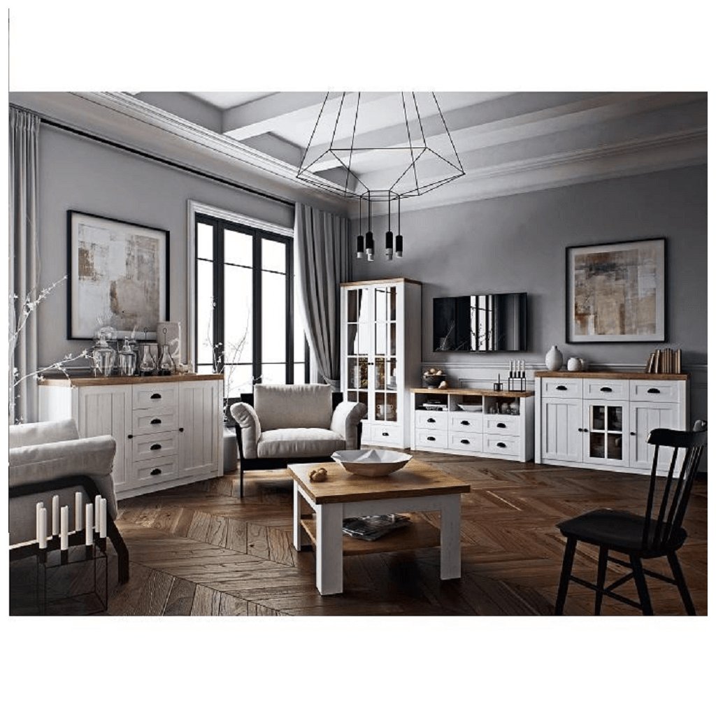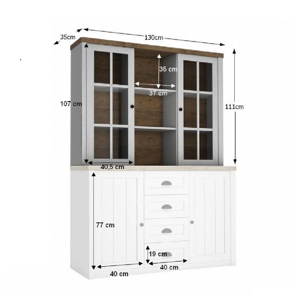 V naší nabídce naleznete komody, ke kterým se budou hodit tyto nástavce. Nástavce jsou vyrobené z laminovaného DTD materiálu, který je doplněn po stranách skleněnou skříňkou. Nástavec stejně jako komoda je v provedení dekoru dub lefkas a borovice andersen. Konstrukce je v bílé barvě - borovice andersen a horní společně se zadní deskou nástavce jsou v dekoru dub lefkas. Určitě jste si mohli povšimnout velikého množství odkládacího prostoru nejen díky policím, ale také proskleným skříňkám. Obývací pokoj si můžete složit podle vašich představ, jelikož se jedná o sektorový nábytek. V naší nabídce naleznete komody, které mají jiné rozložení skřínek a šuplíků také konferenční stolek, vitrínu či zrcadlo. Pokud vám nevyhovuje rozložení tohoto nástavce nezoufejte, v naší nabídce naleznete i jiný.