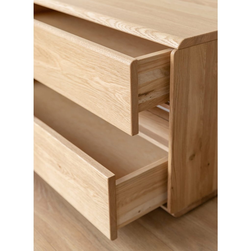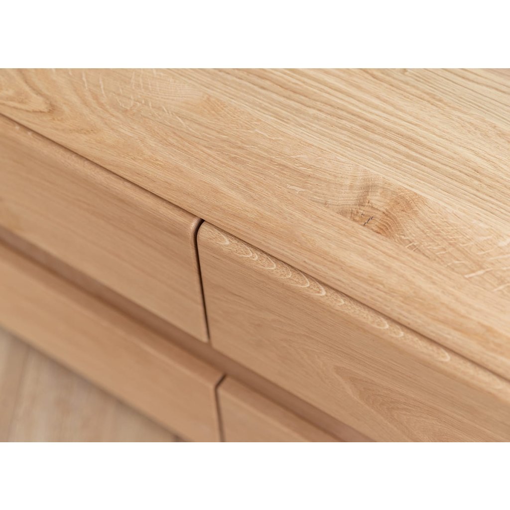 Krásný, zlatý odstín dubu, výrazné kroužky a četné velké suky dodávají komodě Divisione silný charakter a zdůrazňují její přírodní původ. Jemně zaoblené hrany a rovné linie čel skříňky působí velmi moderně, odlišuje ji však zapuštěný prvek mezi zásuvkami. Vyrobili jsme ho z kartáčovaného dřeva, díky čemuž bude každý interiér, do kterého bude umístěn, vypadat originálně.