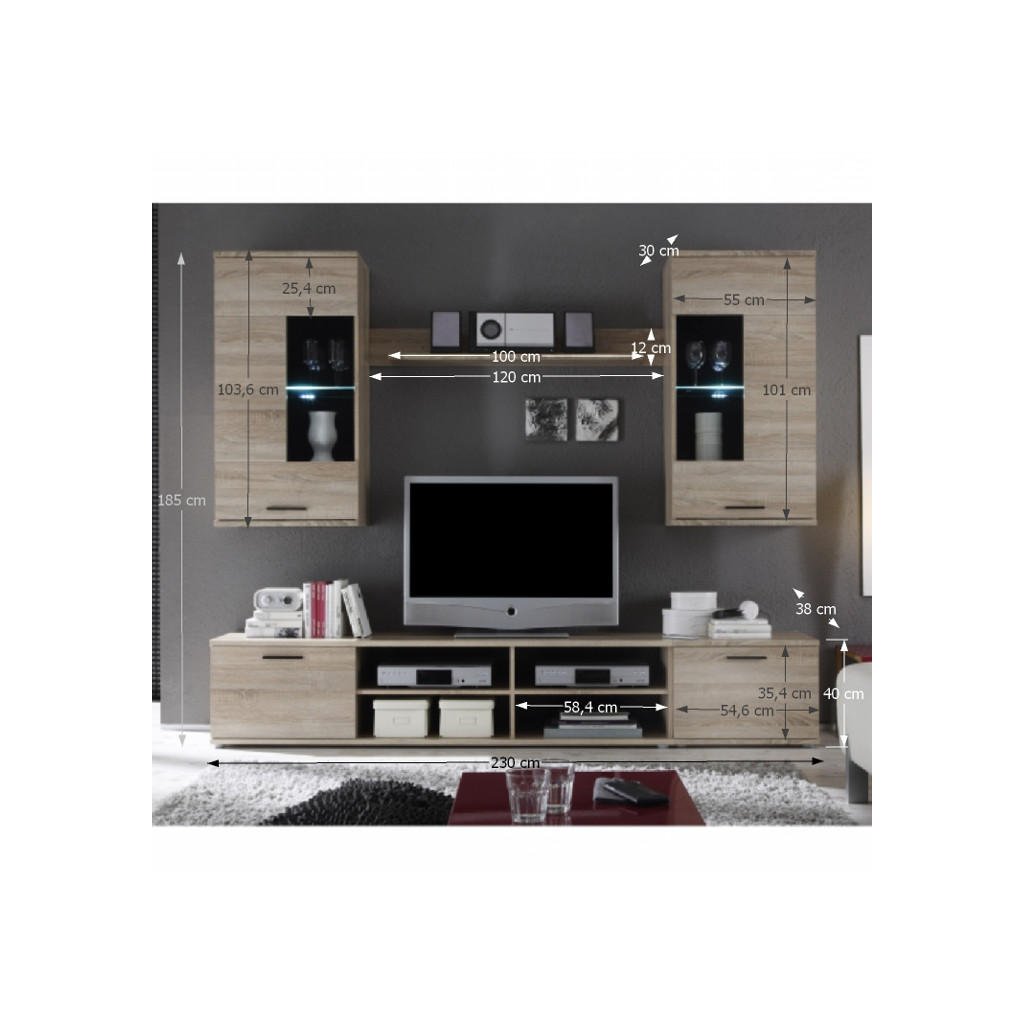 Tato moderní obývací stěna v dekoru dubu zaujme především svojí jednoduchostí. Prosklené poličky ve skříňkách zvýrazňuje moderní LED osvětlení, které zvýrazní nejen samotné skříňky, ale celou obývací sestavu. Sestava o rozměru ŠxVxH: 230x185x38 cm se skládá z TV stolku, skříněk a police.
