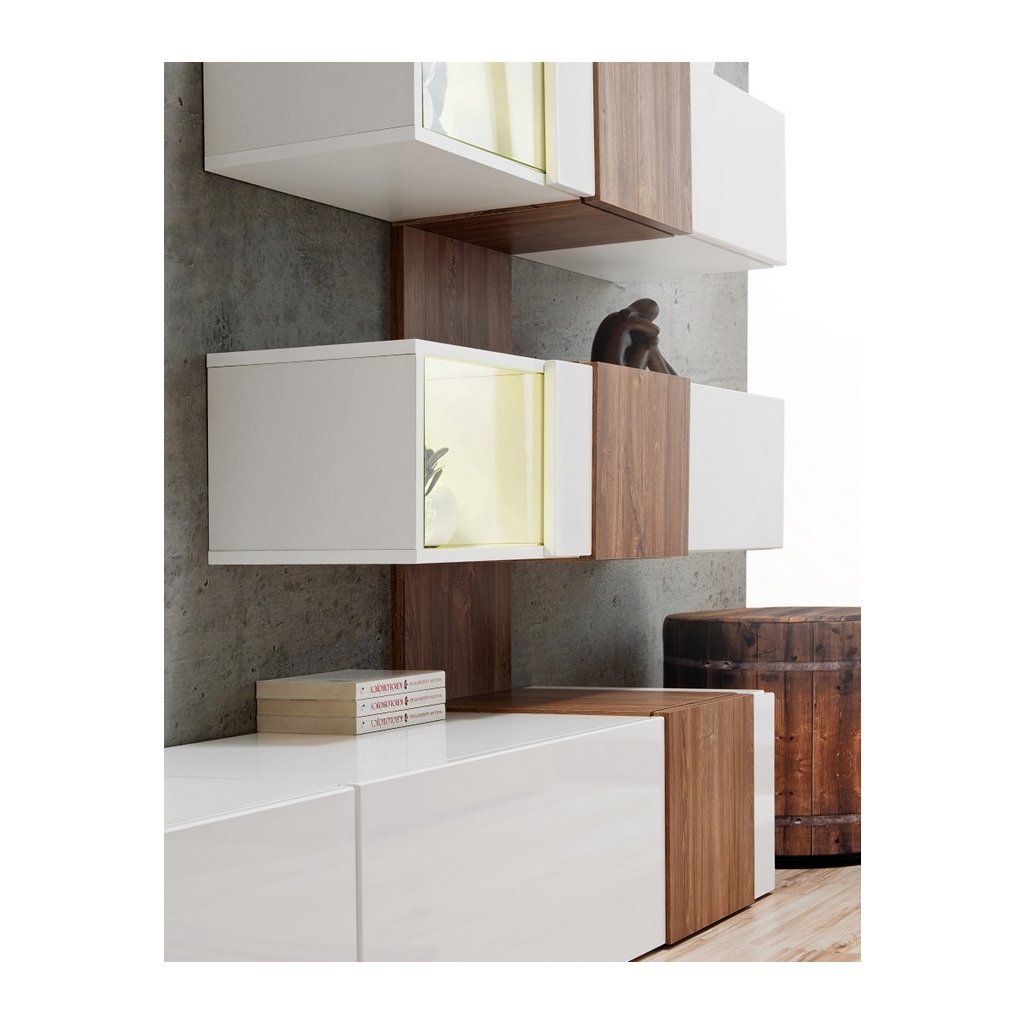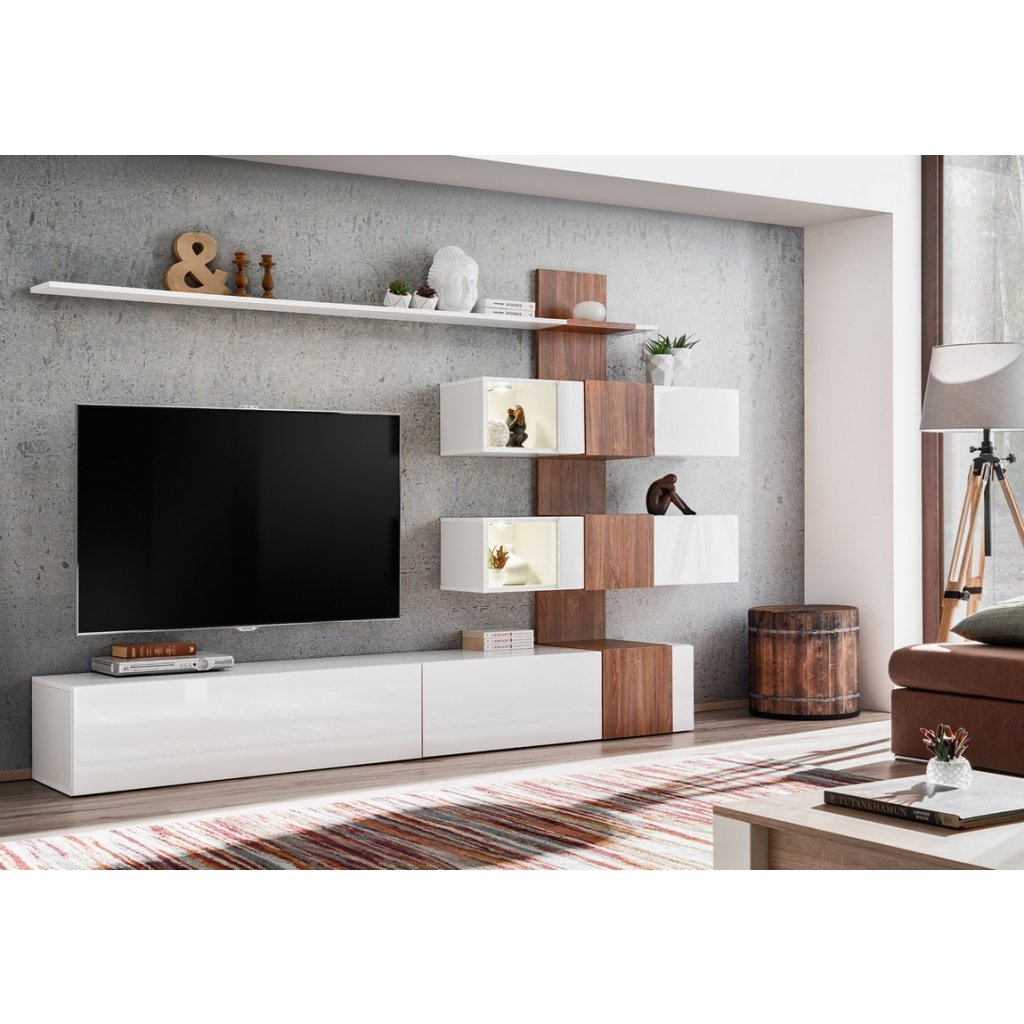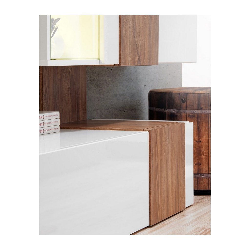 Moderní obývací stěna je navržena podle nejnovějších trendů. Sestava se skládá z: TV stolek, panel s vitrínami a police. Dvířka i korpus jsou vyrobeny z MDF desky v kombinaci bílá lesk/dub sterling. LED osvětlení v ceně. Dodáváme v demontovaném stavu.