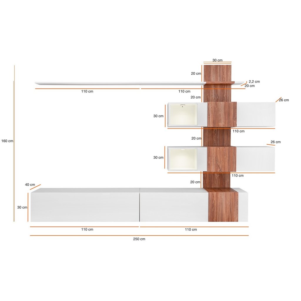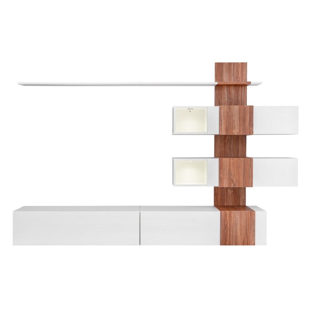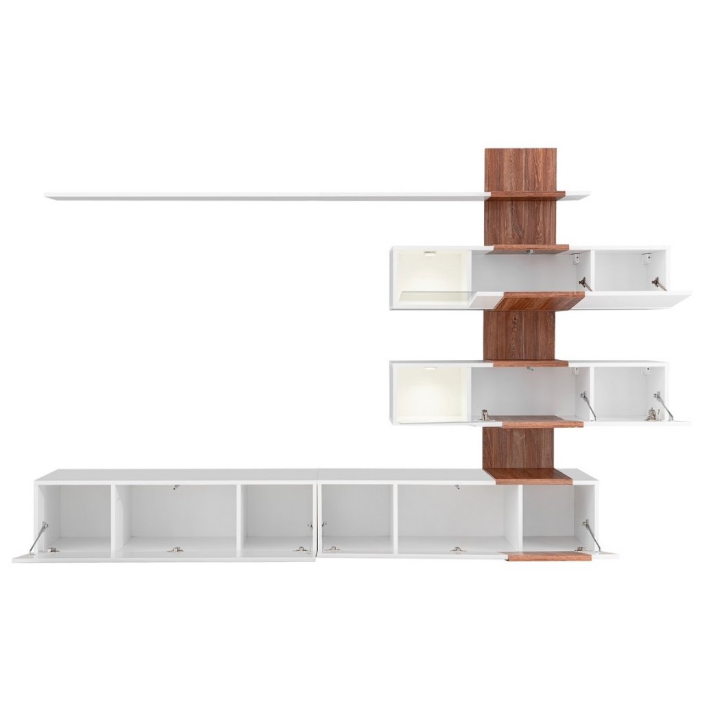 Moderní obývací stěna je navržena podle nejnovějších trendů. Sestava se skládá z: TV stolek, panel s vitrínami a police. Dvířka i korpus jsou vyrobeny z MDF desky v kombinaci bílá lesk/dub sterling. LED osvětlení v ceně. Dodáváme v demontovaném stavu.