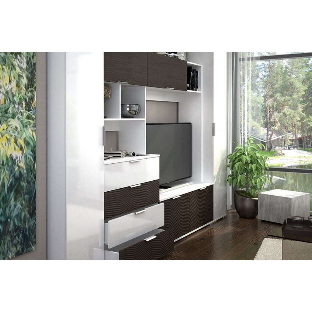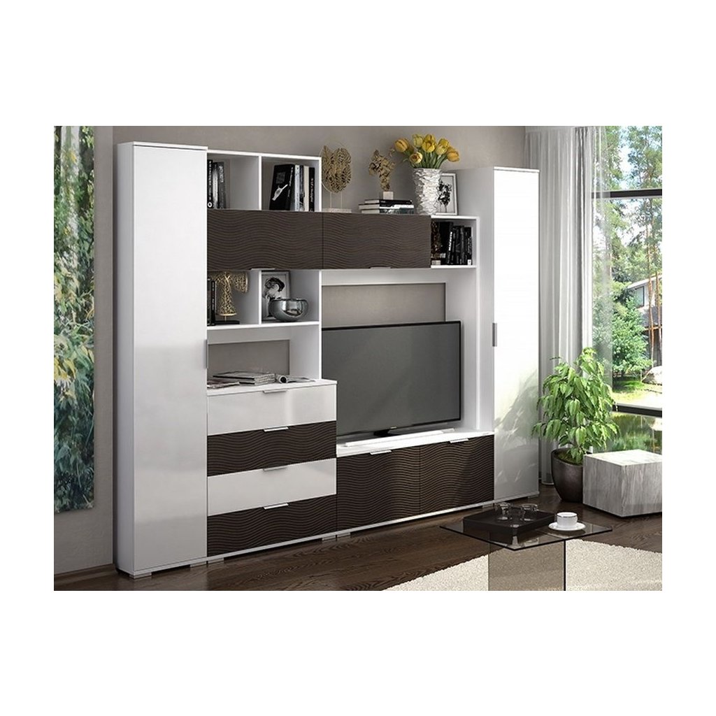 Obývací stěna je vyrobena v příjemných kontrastních barevných kombinacích. Plochy ve světlých odstínech opticky rozšiřují prostor, tmavší odstín pak dodá prostoru na útulnosti. Za zmínku stojí také jemné linie vlnkování s 3D efektem na čele nábytku, které Vás okouzlí svou elegancí Je vyrobena z kvalitní laminátové desky v kombinacis MDF barev bílá lesk a wenge, korpus je v barvě bílá mat. Sestava se skládá z (ŠxHxV v cm) - centrální části: TV stolek, komoda, regál, police (200 x 45 x 212), 2x skříň (40 x 45 x 212). Prostor na TV do 49 palců. Dodáváme v demontovaném stavu.