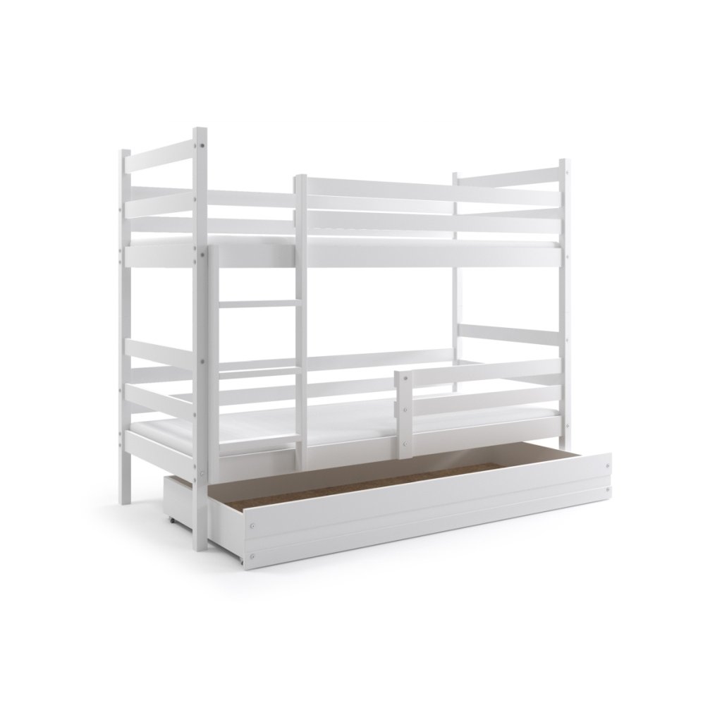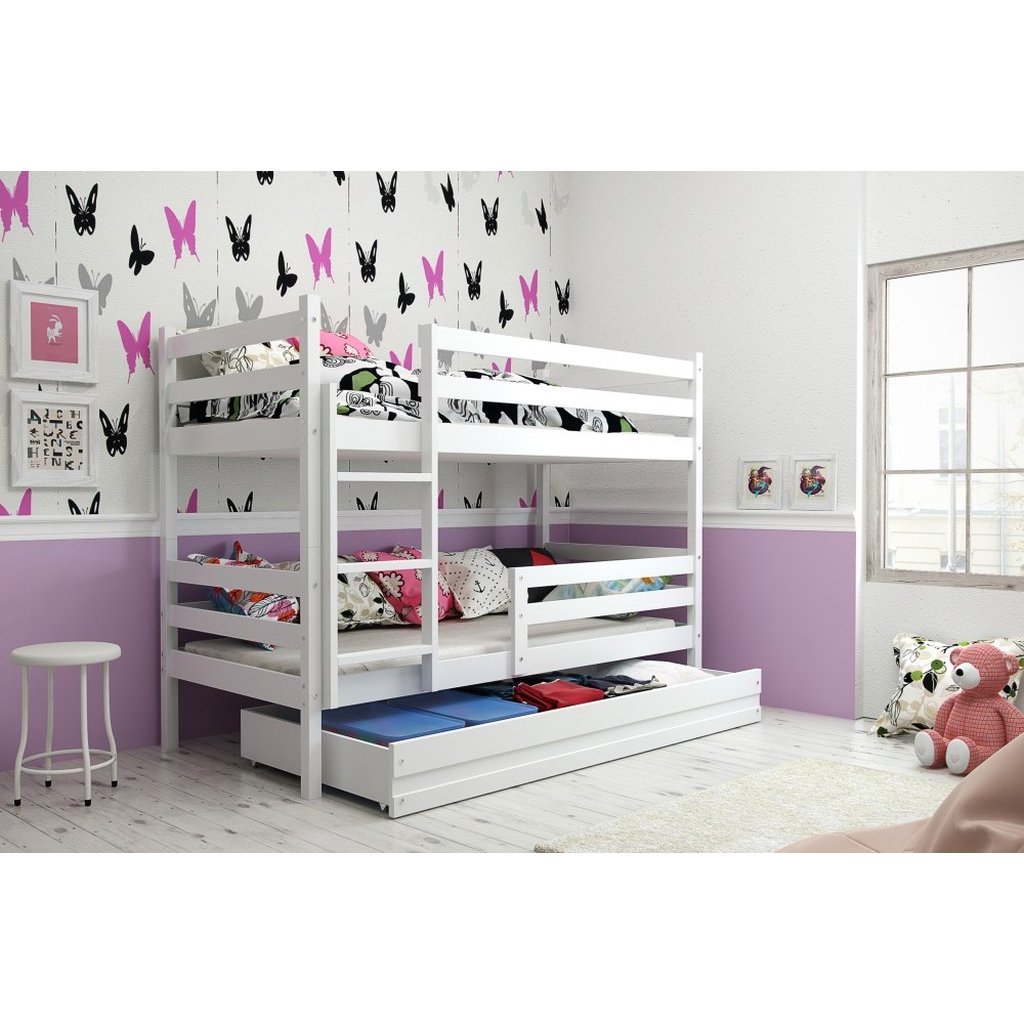 Dětská patrová postel je určena pro všechny, kteří pro své dítě chtějí kvalitní, moderní a praktickou postel. Je vyrobena z kvalitního borovicového dřeva a má stabilní konstrukci. Zaoblené hrany, zábrana na dolní i horní posteli, zajišťují maximální bezpečí pro dítě. Žebřík je možné umístit jak na pravou tak na levou stranu. V případě potřeby lze palandu rozložit na dvě samostatné postele. Plocha pro spaní je 2x 90x200 cm. Součástí postele je 2x zábrana, praktický úložný prostor na kolečkách, 2x rošt a 2x pěnová matrace se snímatelným potahem. Na fotografii můžete vidět postel v bílé barvě. Dodáváno v demontu. Dodáváme ještě v dekoru borovice, olše a grafit.