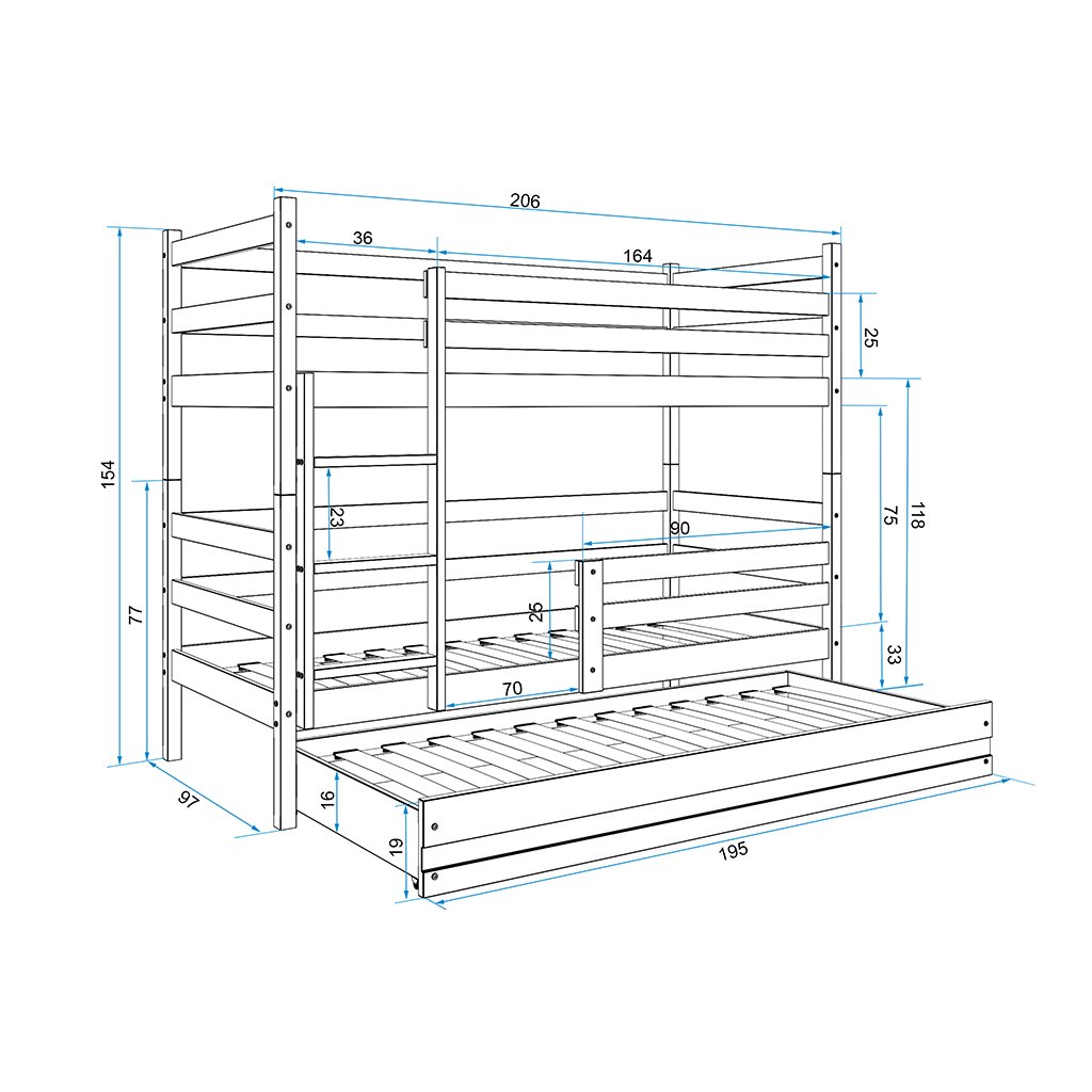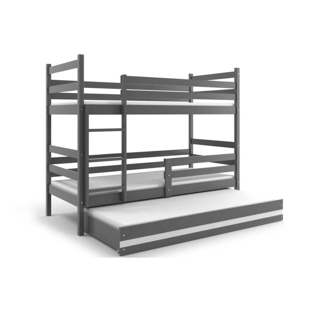 Dětská patrová postel je určena pro všechny, kteří pro své dítě hledají funkčnost, moderní provedení a zároveň praktičnost. Postel je vyrobena z kvalitního borovicového dřeva. Stabilní konstrukce, zaoblené hrany a zábrana na horní i dolní posteli zajišťují maximální bezpečí pro vaše dítě. Žebřík si můžete umístit podle sebe - na pravou či levou stranu. Když vaše dítě omrzí patrová postel je možné palandu rozložit na dvě samostatné postele. Součástí postele je také praktická přistýlka s matrací, kterou můžete využít pro přespání kamarádky. Na fotografii můžete vidět postel v bílém provedení. Plocha pro spaní je 90x200 cm (vrchní a spodní část) a 80x190 cm (přistýlka). Všechny části mají pěnovou matraci a rošt. Pokud by se vám nehodilo toto barevné provedení, z naší nabídky si určitě vyberete jinou barvu.