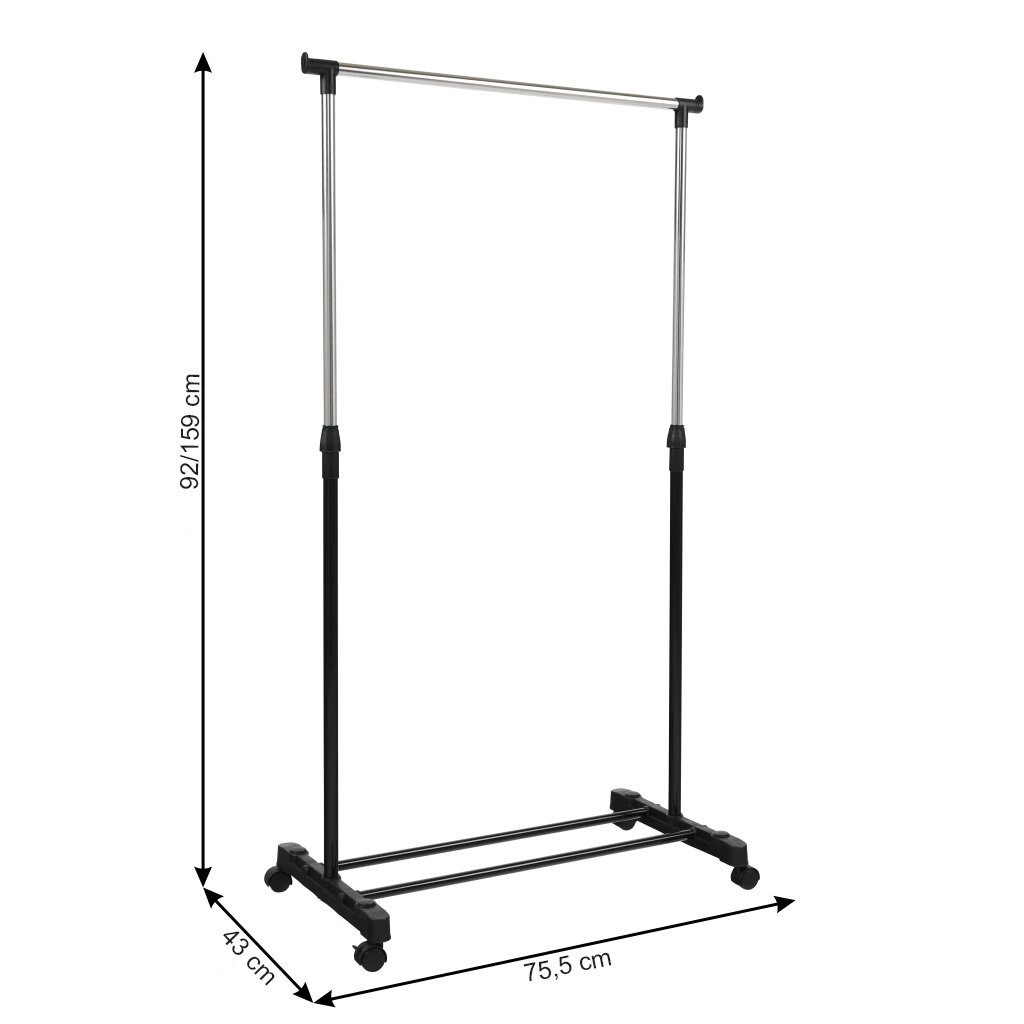 pojazdný věšák s kolečky a jednou závěsnou výškově nastavitelnou tyčí, provedení: nerezový kov + černý plast, rozměry ŠxHxV: 75,5x43x92-159 cm