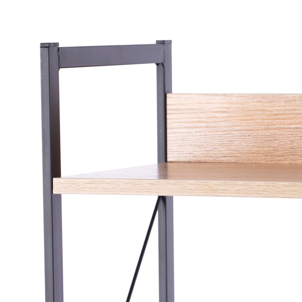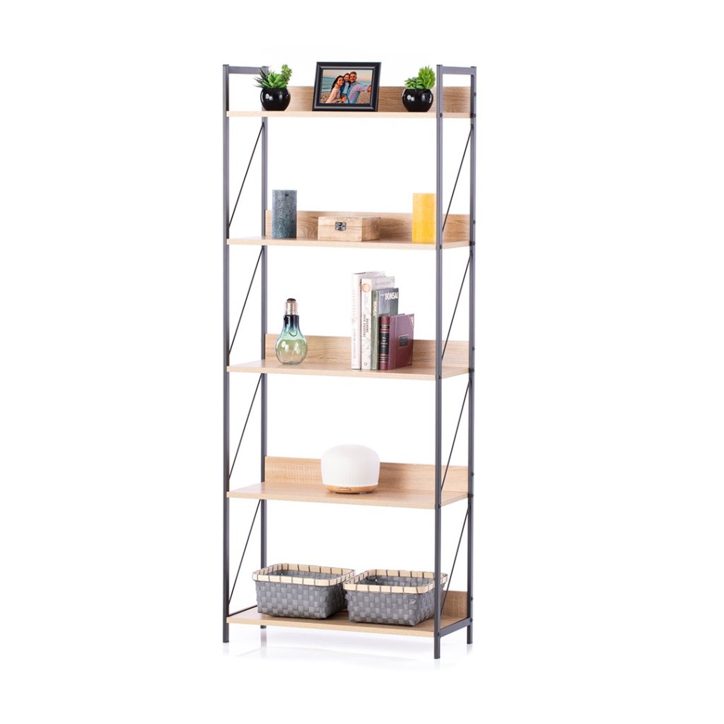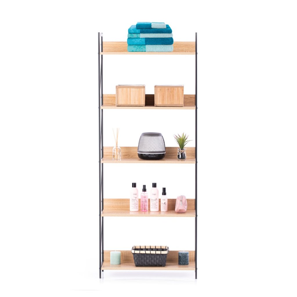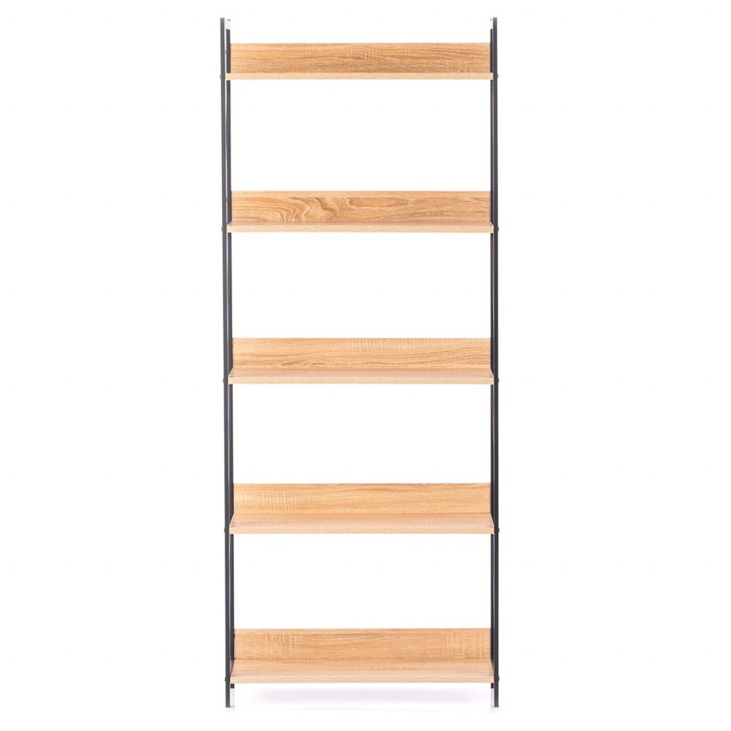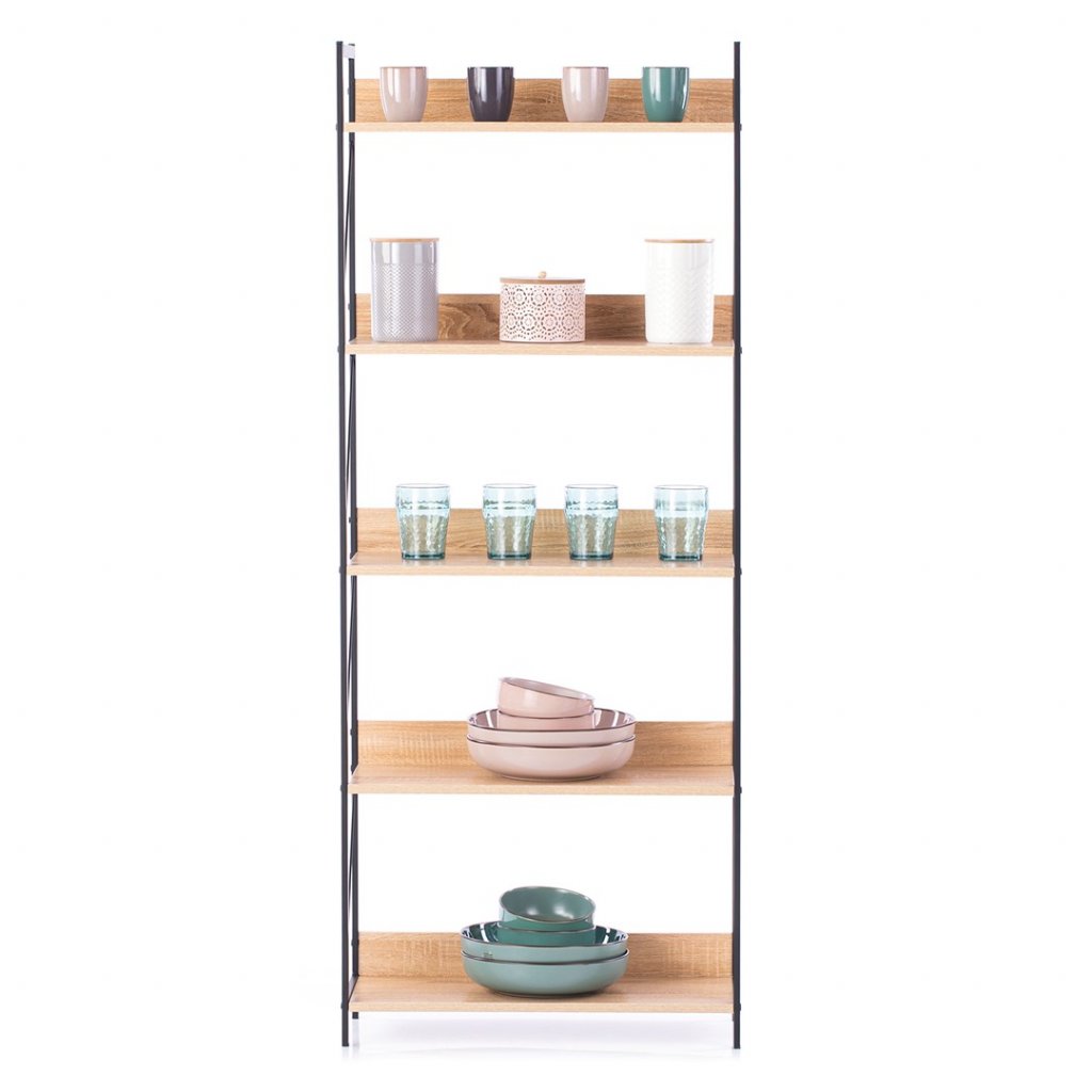Policový regál v jednoduchém idnustriálním stylu, v dekoru dub, s kovovou konstrukcí v černé barvě. Police regálu jsou vyrobeny z dřevotřísky potažné PVC.