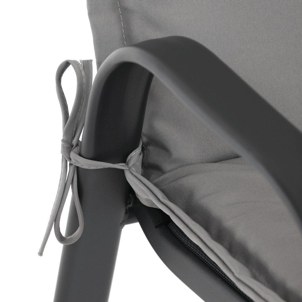 Polstr na zahradní židli v šedé látce nabízí pohodlné sezení díky dostatečnému polstrování sedáku i opěradla. Rozměry 55 x 45 cm pro záda a 45 x 45 cm pro sedák zajišťují univerzální použití na většinu zahradních židlí. Polstr je vybaven šňůrkami pro pevné připevnění k židli, což zabraňuje posunu během používání. Látka je příjemná na dotek a snadno se udržuje, což přispívá k dlouhodobému komfortu a estetice venkovního posezení.