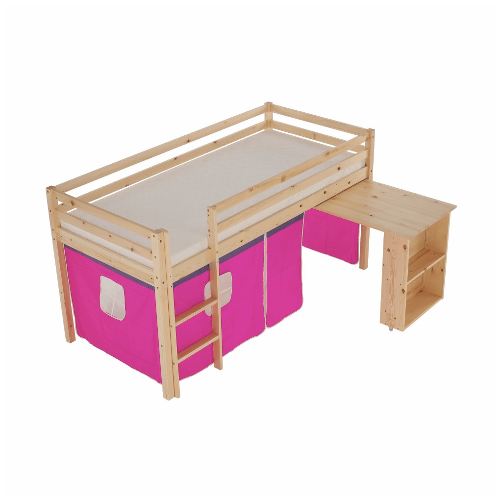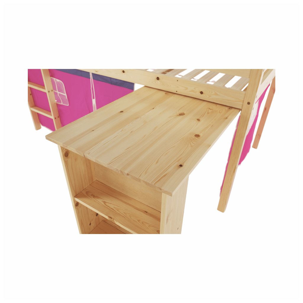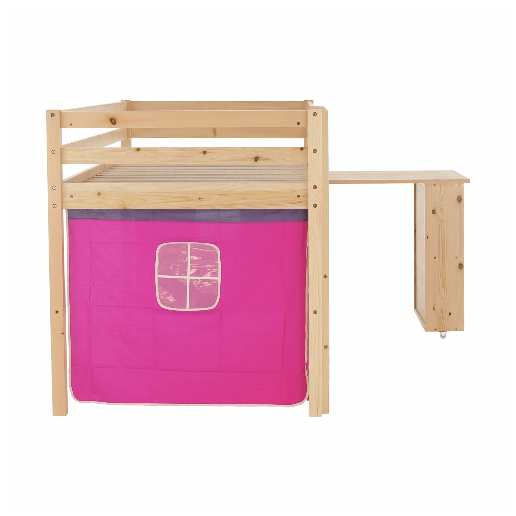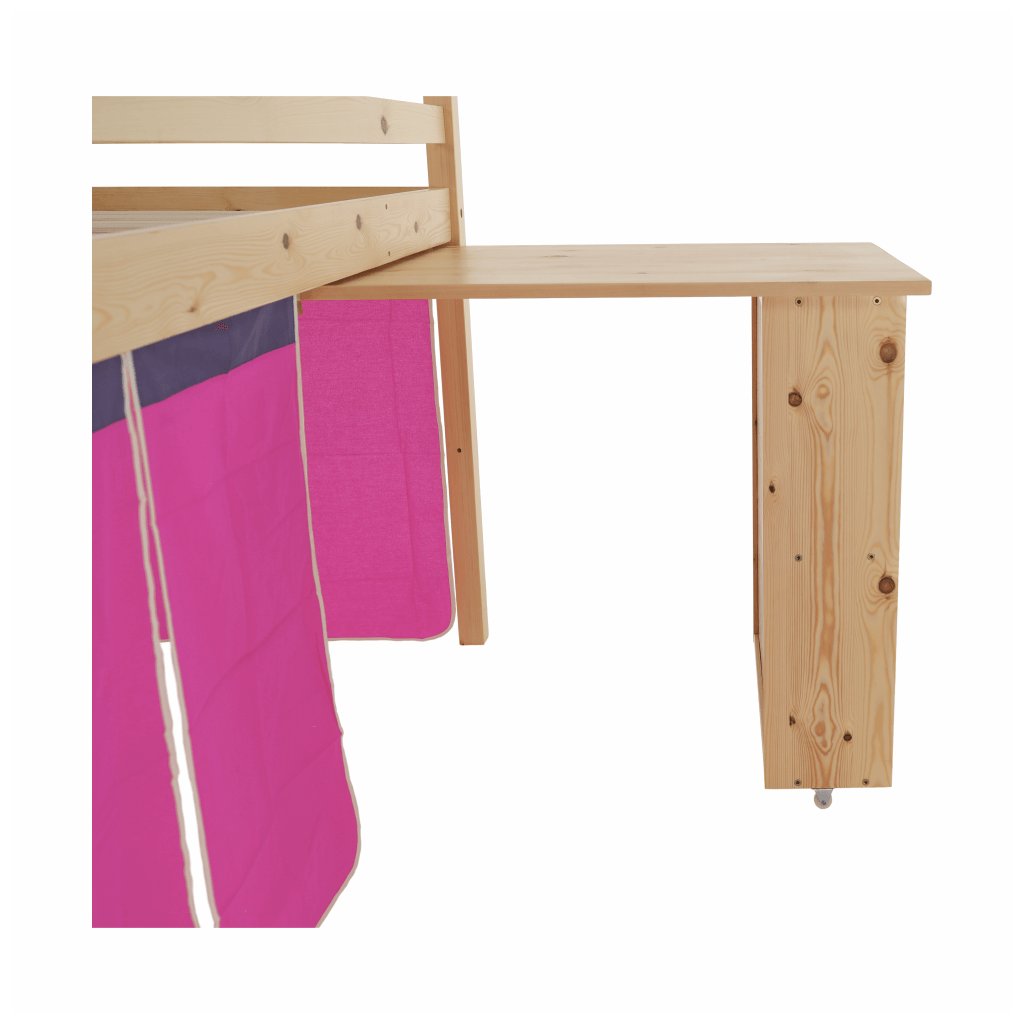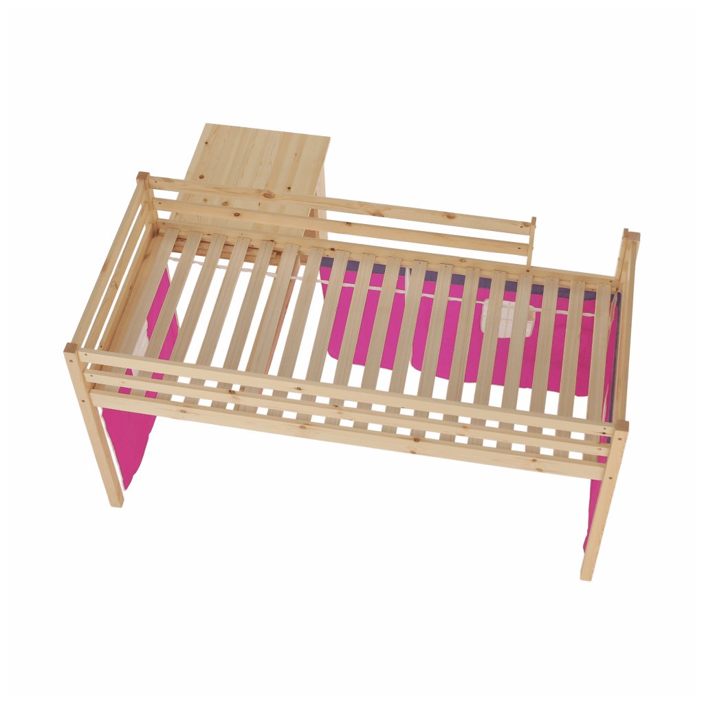 I vy bojujete s nedostatkem místa v pokoji vašeho dítěte? Úsporným řešením může být i postel se zvýšeným lůžkem, jejíž součástí je i PC stůl s regálem . Za růžovým závěsem si vaše dítě založí vlastní pevnost a ukryje všechna svá tajemství. Na kreslení, čtení knih a časopisů, také na školní úkoly zas poslouží šikovný psací stůl , který je z boční strany obohacený o regál se dvěma úložnými plochami . Když je třeba jít spát, malý rošťák šikovně vyběhne do postele po dřevěném žebříku, který lze upevnit na pravou nebo levou stranu postele .