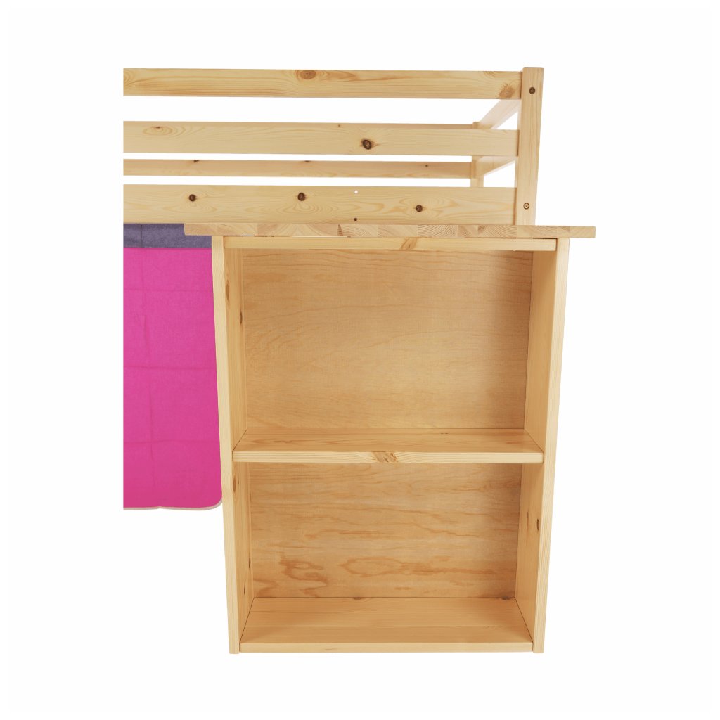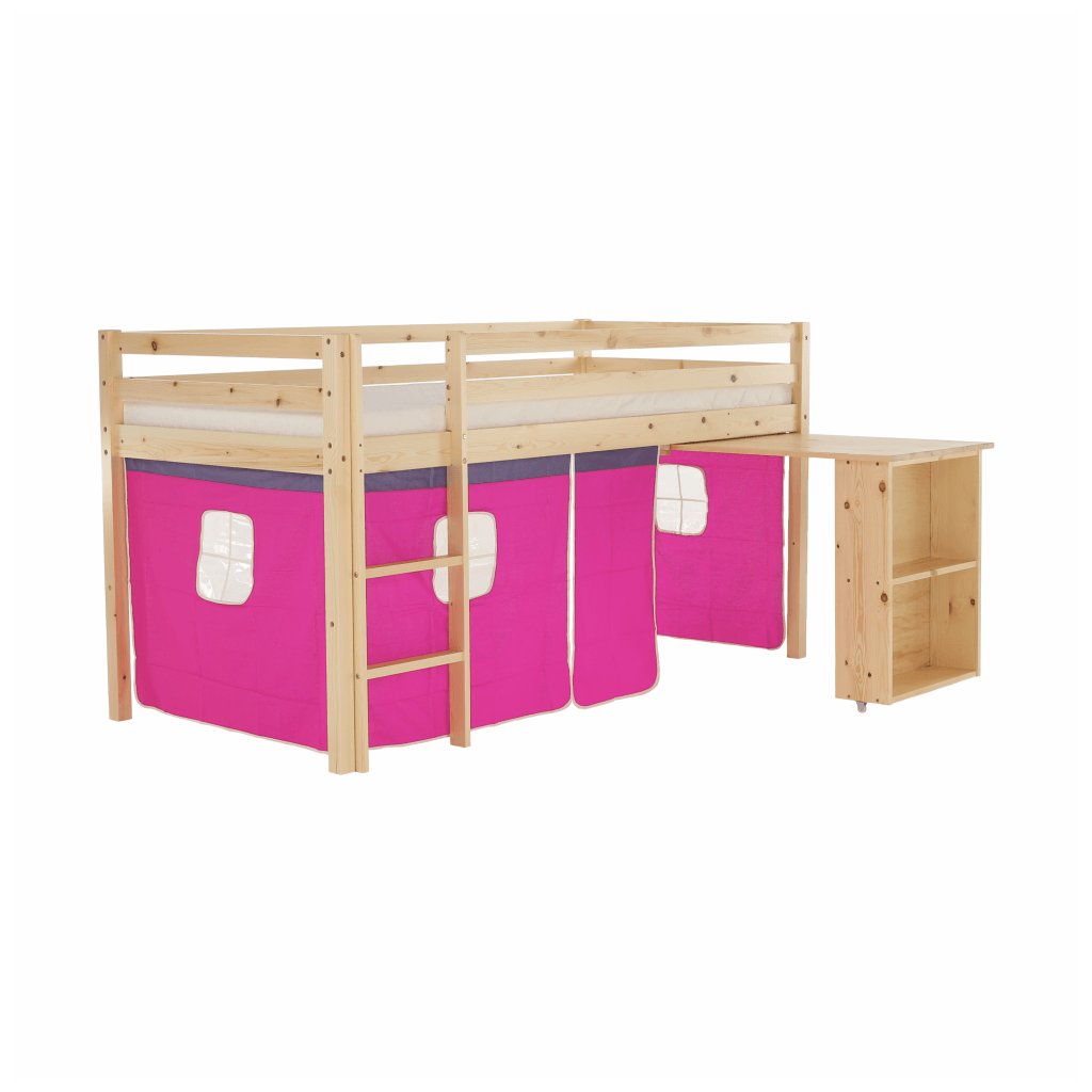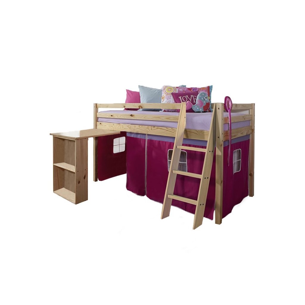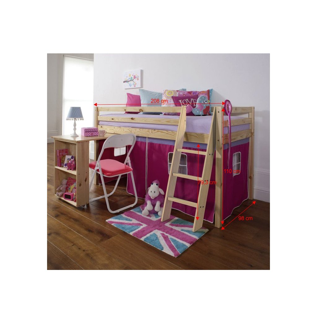I vy bojujete s nedostatkem místa v pokoji vašeho dítěte? Úsporným řešením může být i postel se zvýšeným lůžkem, jejíž součástí je i PC stůl s regálem . Za růžovým závěsem si vaše dítě založí vlastní pevnost a ukryje všechna svá tajemství. Na kreslení, čtení knih a časopisů, také na školní úkoly zas poslouží šikovný psací stůl , který je z boční strany obohacený o regál se dvěma úložnými plochami . Když je třeba jít spát, malý rošťák šikovně vyběhne do postele po dřevěném žebříku, který lze upevnit na pravou nebo levou stranu postele .